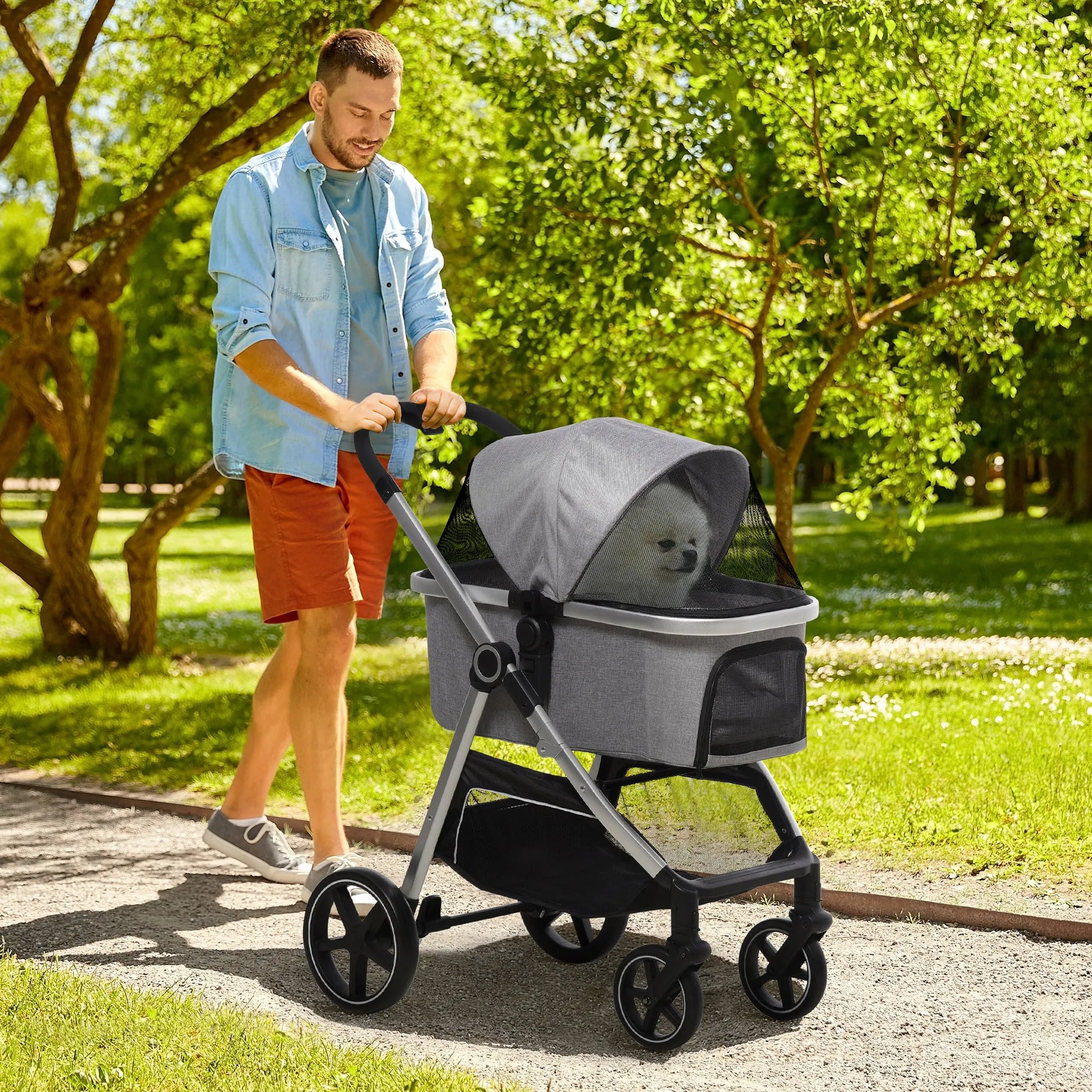 Su šiuo vežimėliu šuniui galėsite saugiai ir patogiai transportuoti savo augintinį. Jis turi keturis lengvai riedančius ratus ir rankeną, todėl jį lengva pasiimti su savimi keliaujant. Vežimėlis šuniui yra erdvus, todėl jūsų plaukuotasis draugas turės daug vietos viduje. Jis turi tinklinius langelius geram vėdinimui ir keturių lygių reguliuojamą stogelį. Vežimėlyje yra papildomas krepšys, kuriame galėsite laikyti aksesuarus.