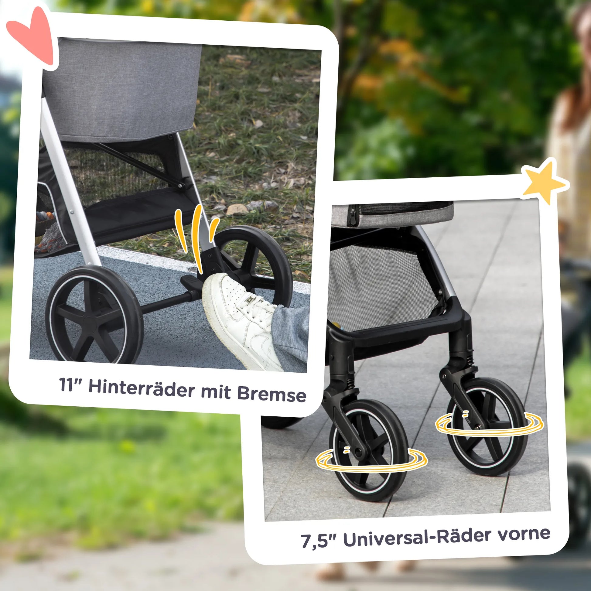 - ✔ Priekiniai EVA universalūs ratai ir galiniai EVA ratai su stabdžiais