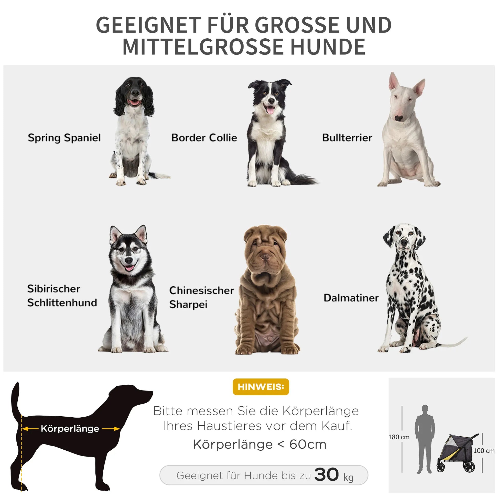 Šunų vežimėlis iki 30kg, sulankstomas, "Vieno paspaudimo" sistema, 2 saugos pavadėliai, laikymo kišenės, paminkštinta rankena, tamsiai pilkas.