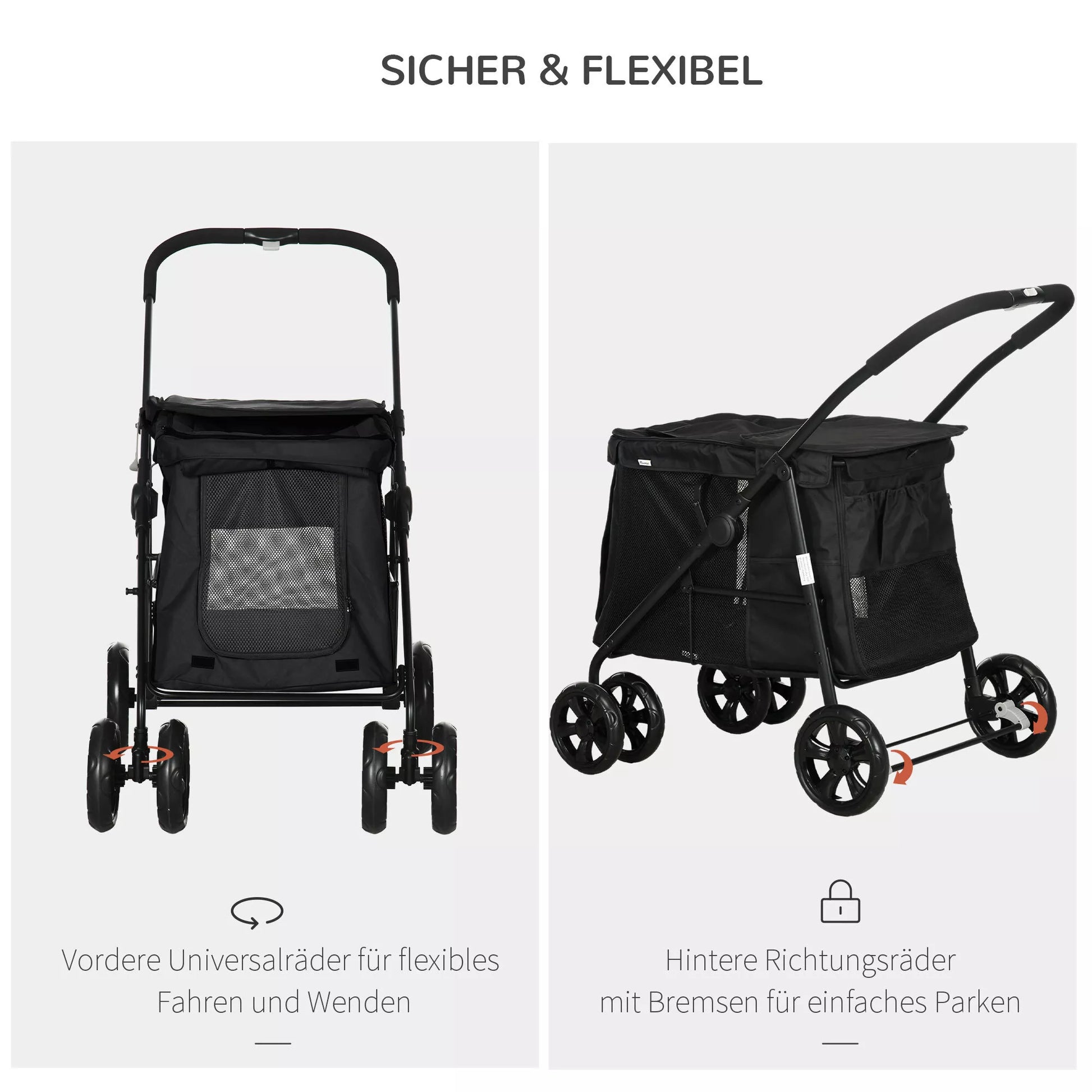 - ✔ Priekiniai universalūs EVA ratai ir galiniai EVA ratai su stabdžiais