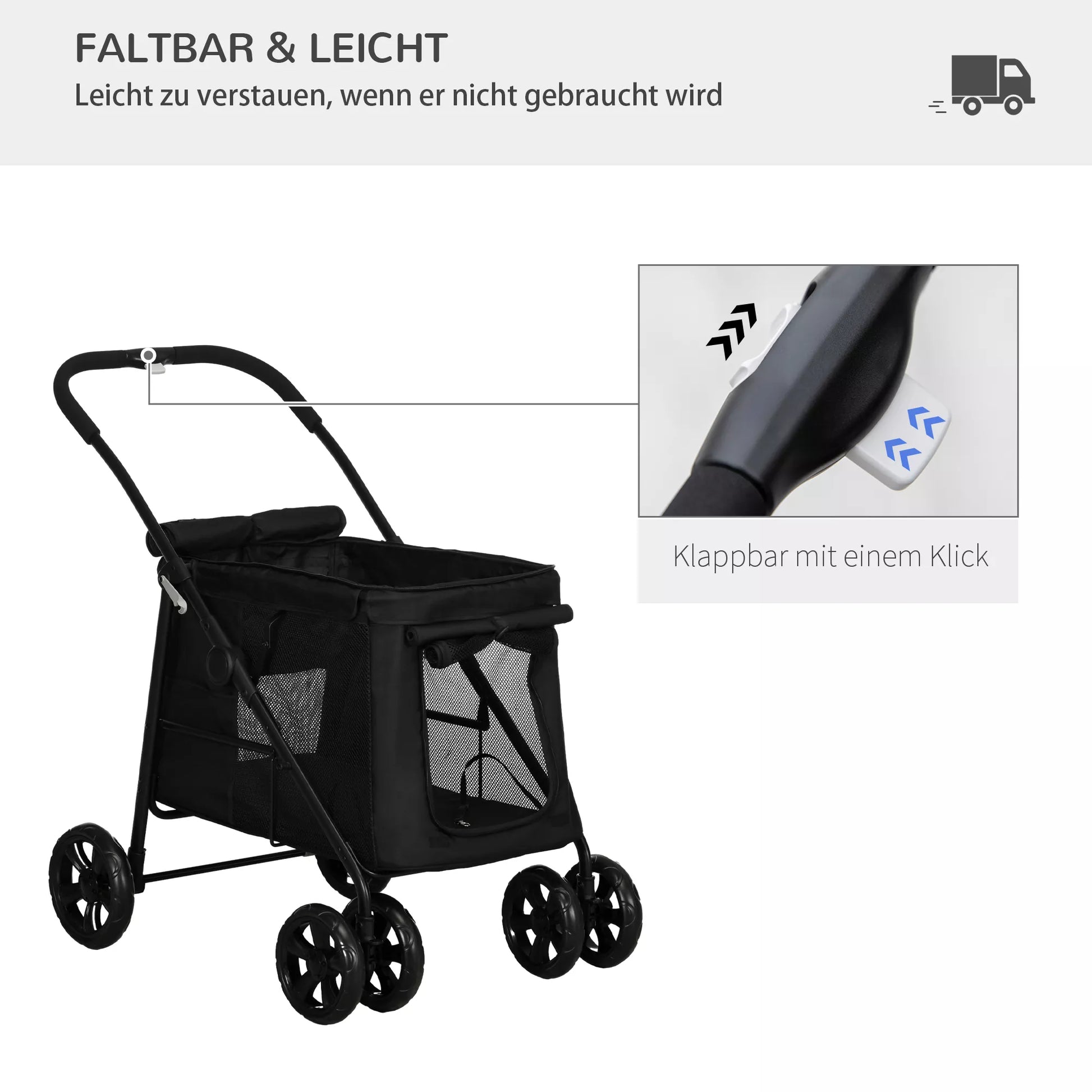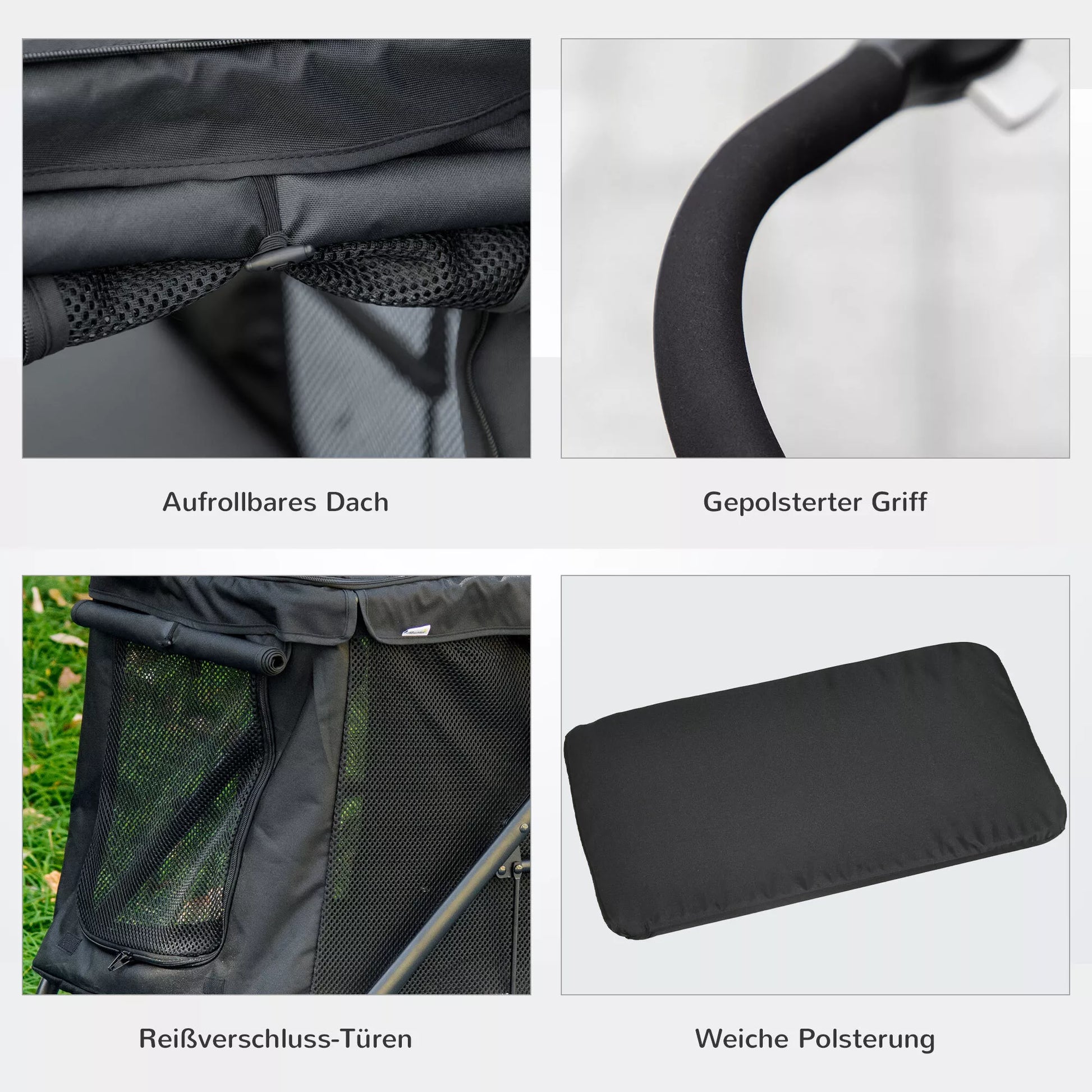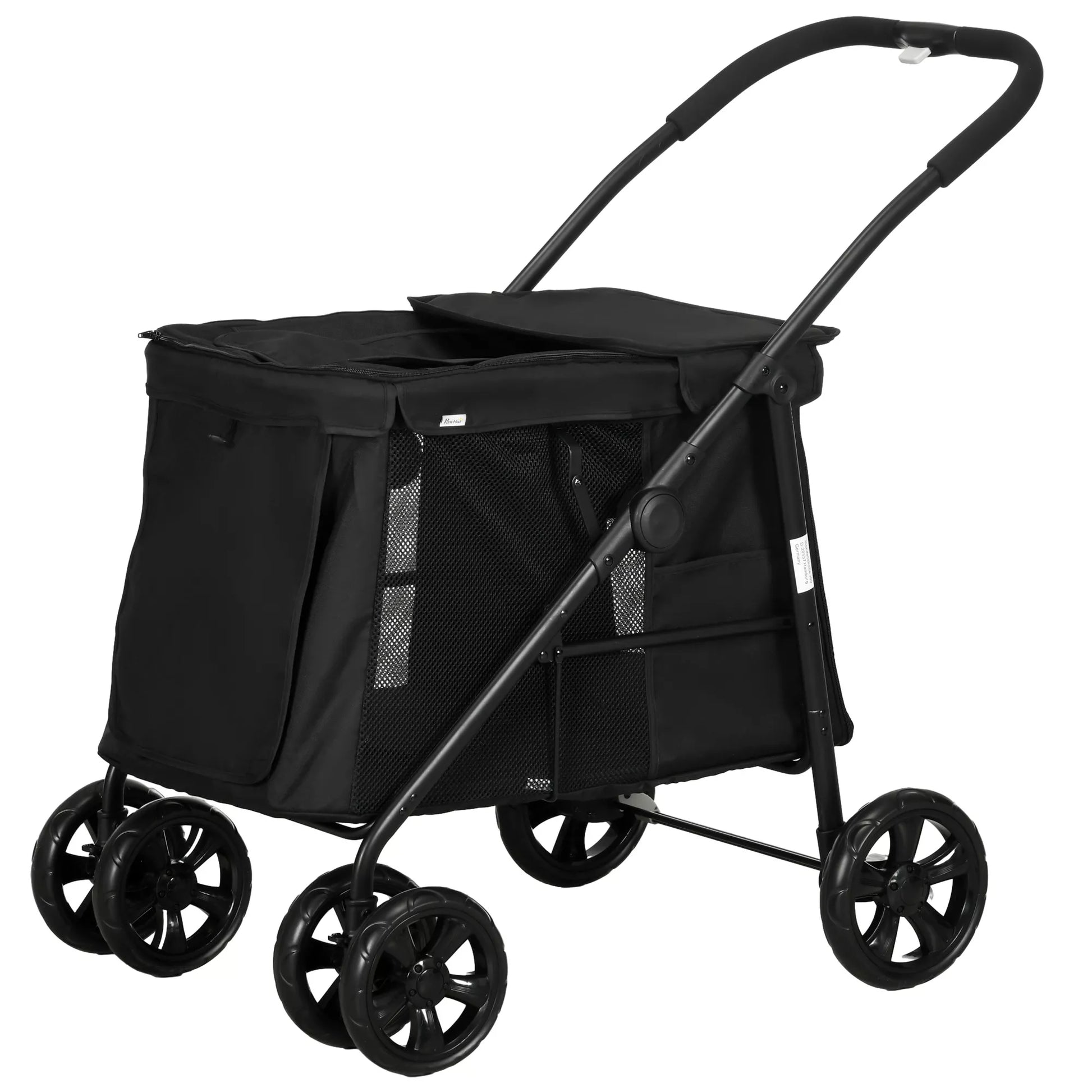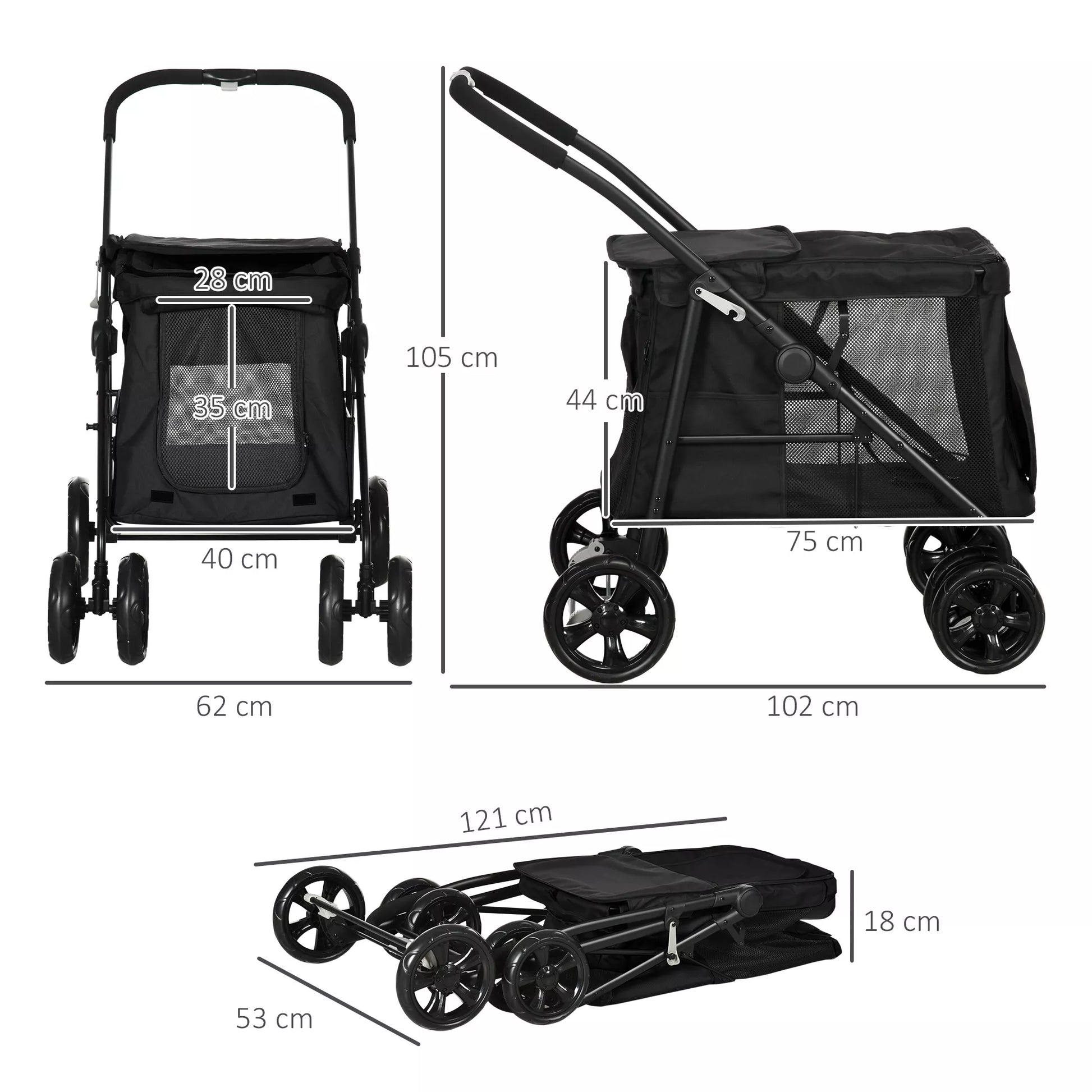 Šunų vežimėlis su pagalvėle, 3 šoninės kišenės, sulankstomas, 102 cm x 62 cm x 105 cm, juodas
