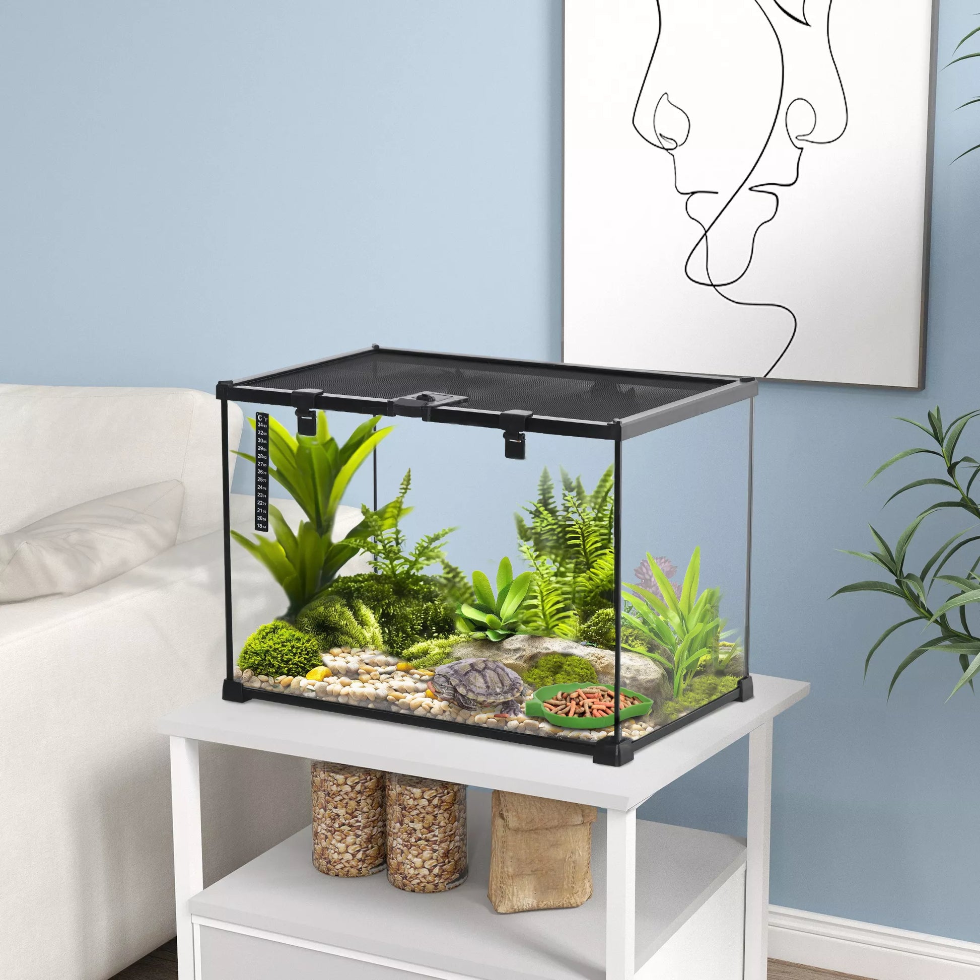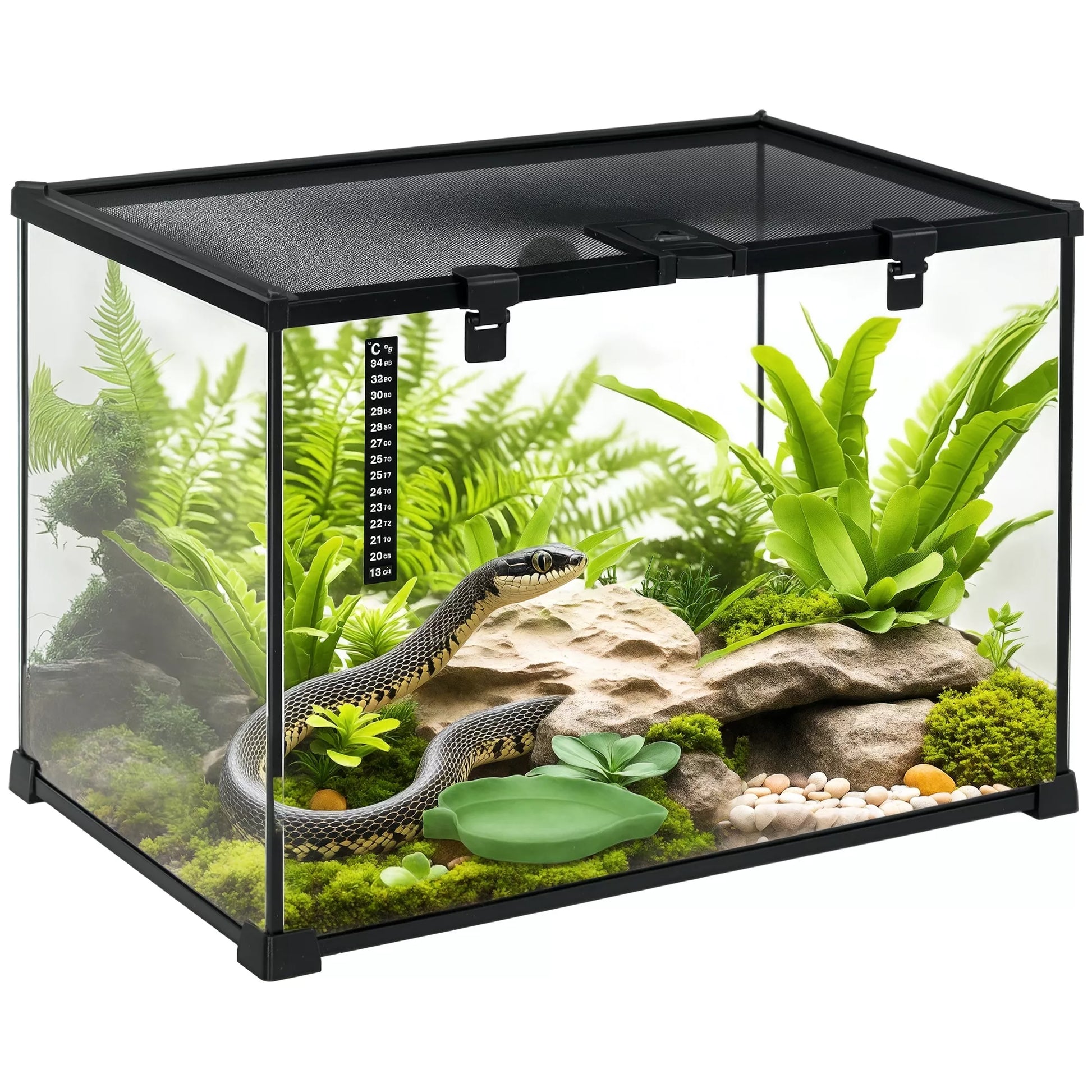 Terariumas ropliams Maitinimo dėžutė stiklinis terariumas varliagyviams, voragyviams su termometru Roplių auginimo dėžutė sraigėms, varliagyviams, vabzdžiams, vėžliams Juoda 50 x 30 x 35 cm