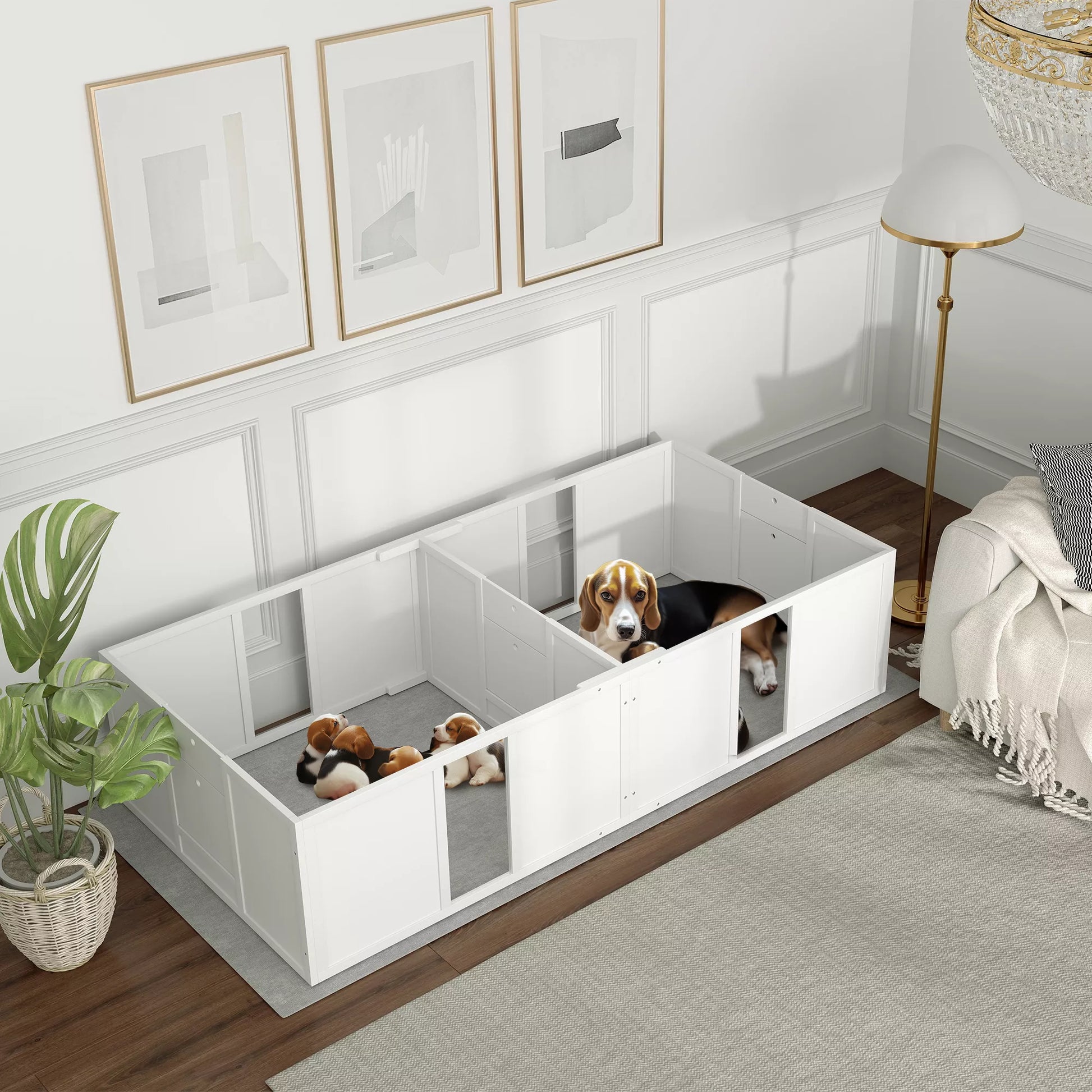 PawHut Veisimo dėžė šuniukams, dalijama į 2 skyrius, su akriliniu langeliu, 196 x 96 x 48 cm, balta