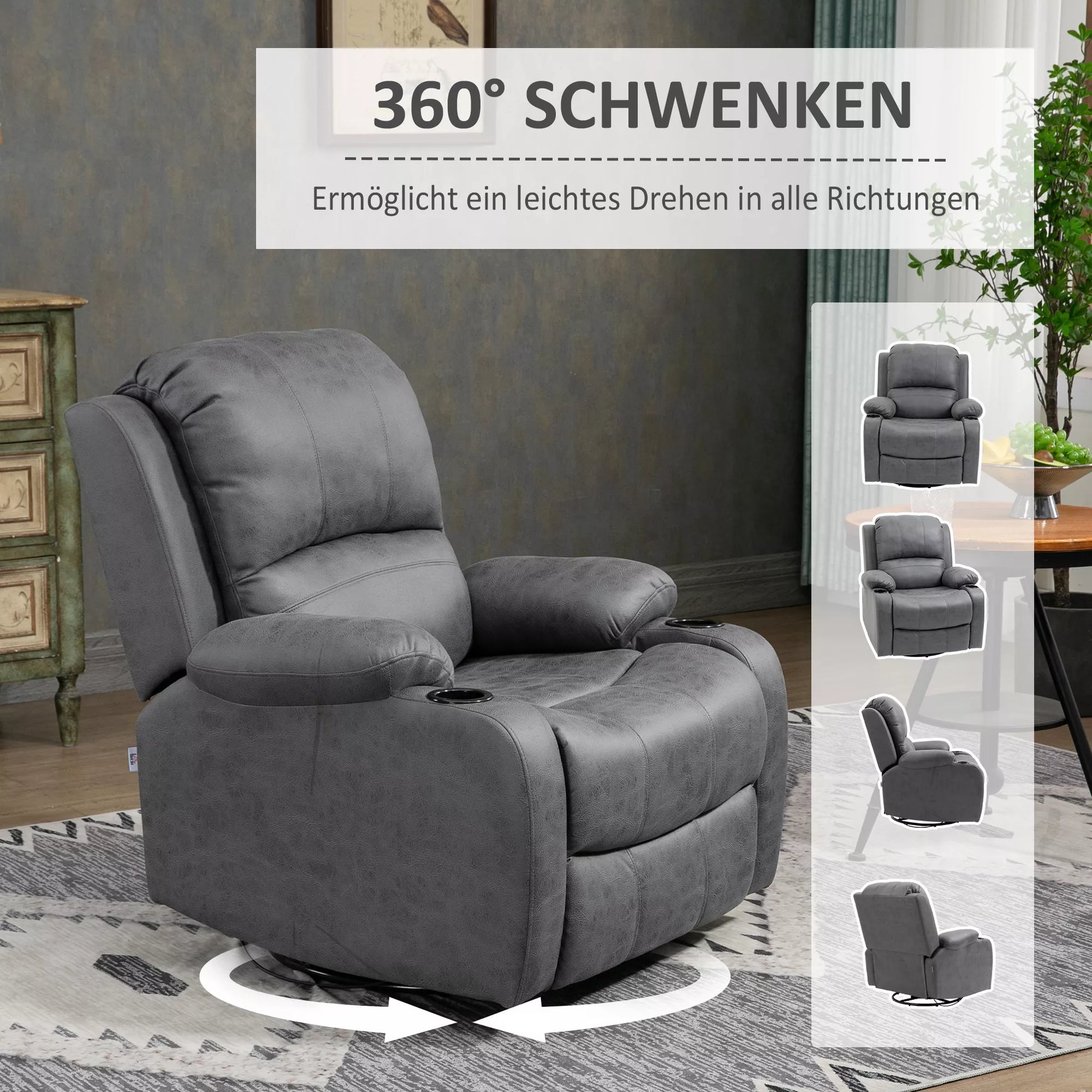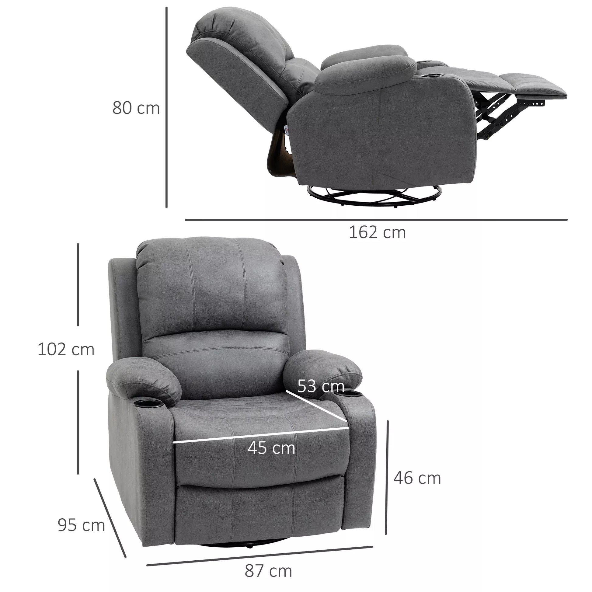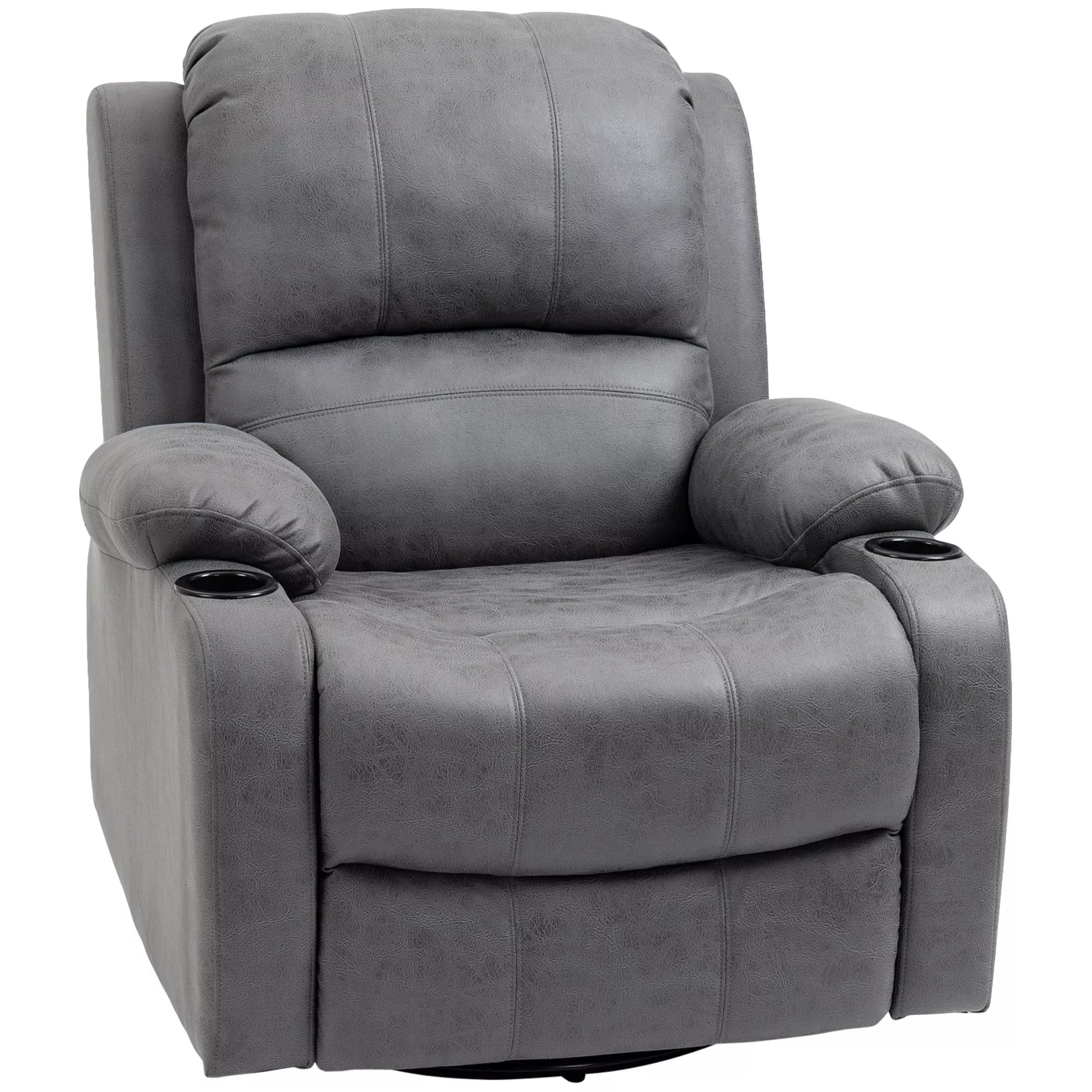 Poilsio fotelis su pakoja ir gulima funkcija, su puodelių laikikliu, TV fotelis, 87 cm x 95 cm x 102 cm, Pilkas