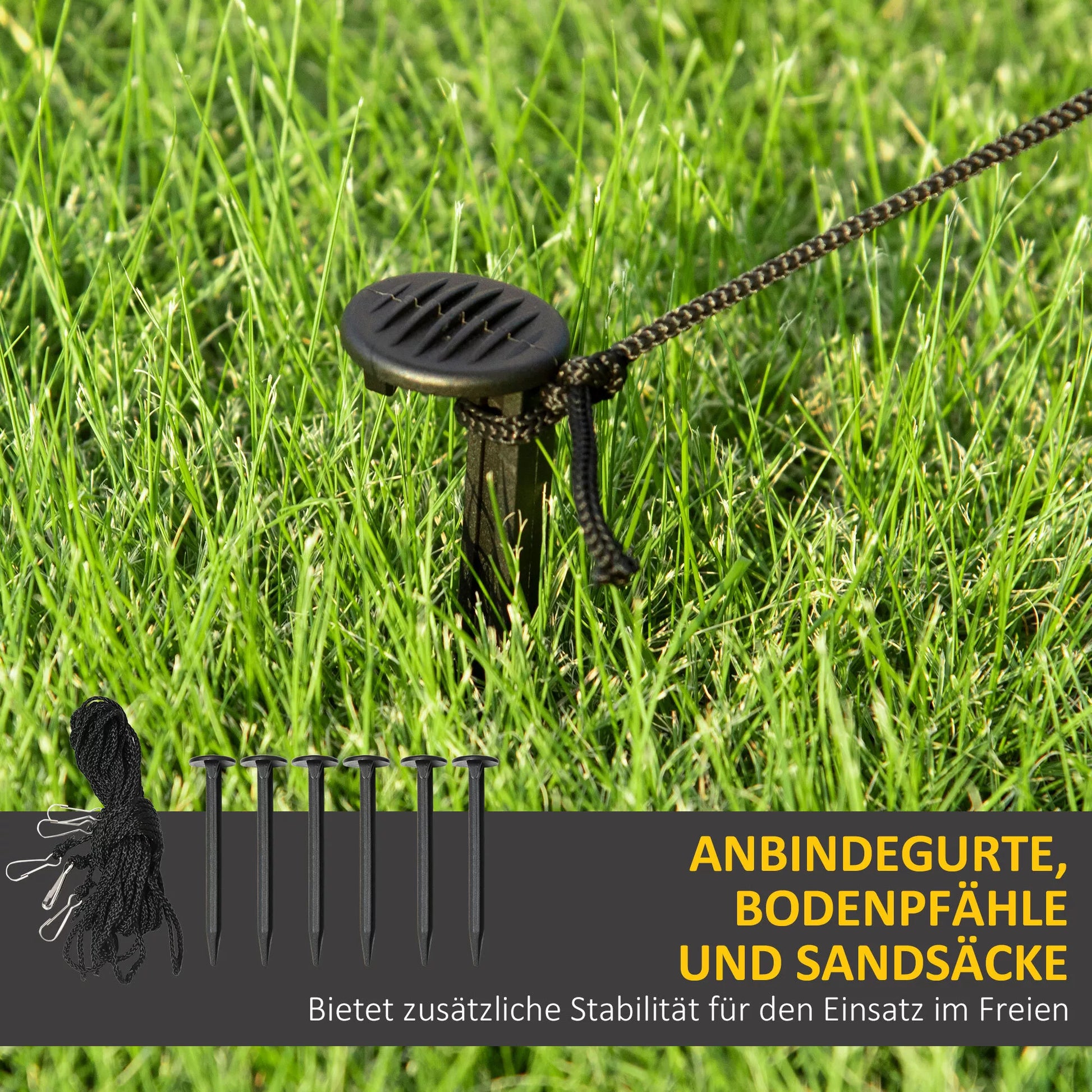 - ✔ Komplekte yra keturi kuoliukai, dvi virvės ir smėlio maišas, kad nepūstų vėjuotomis naktimis