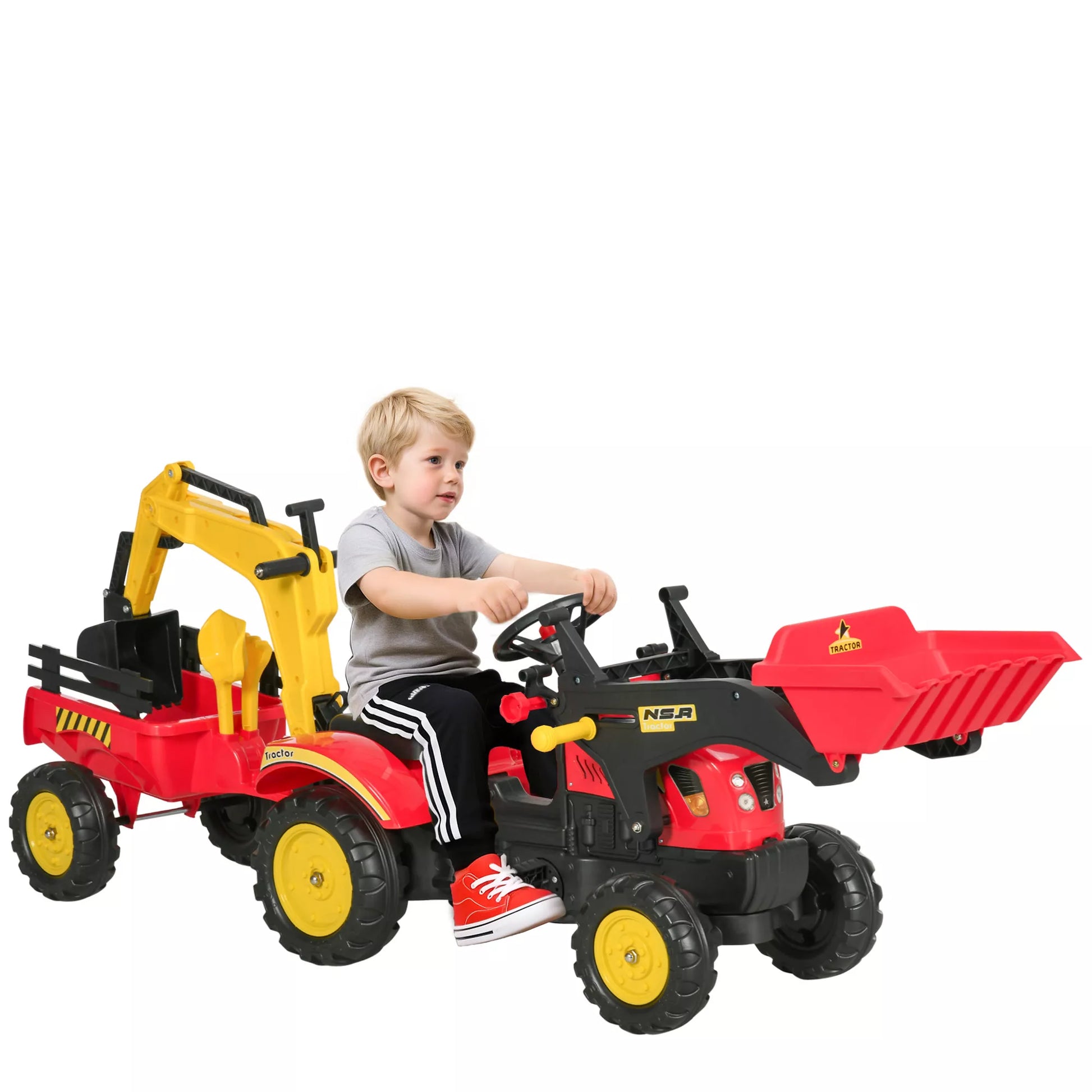 Raudonas pedalinis traktorius su priekaba, frontaliniu krautuvu ir reguliuojamu kaušu, skirtas vaikams nuo 3 metų