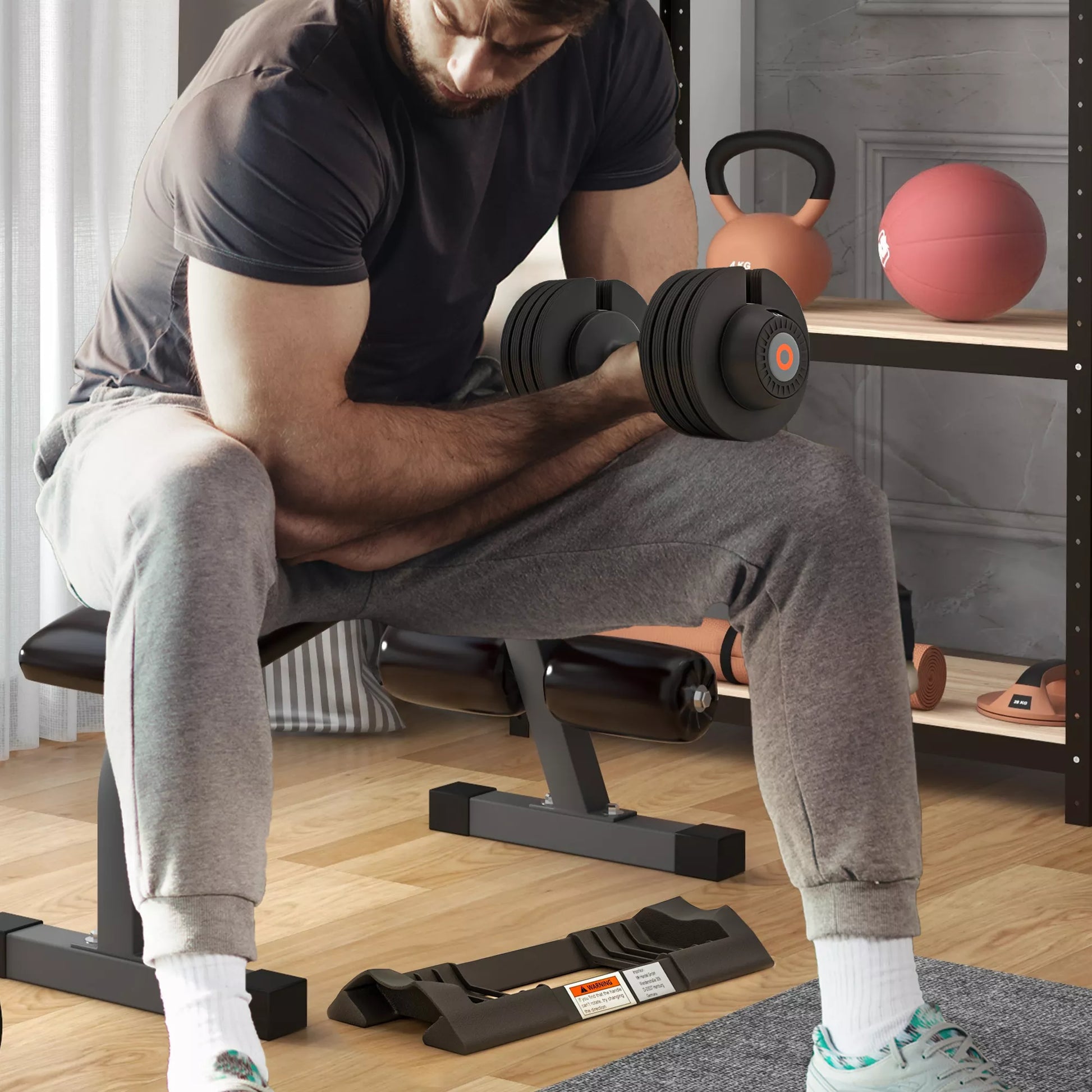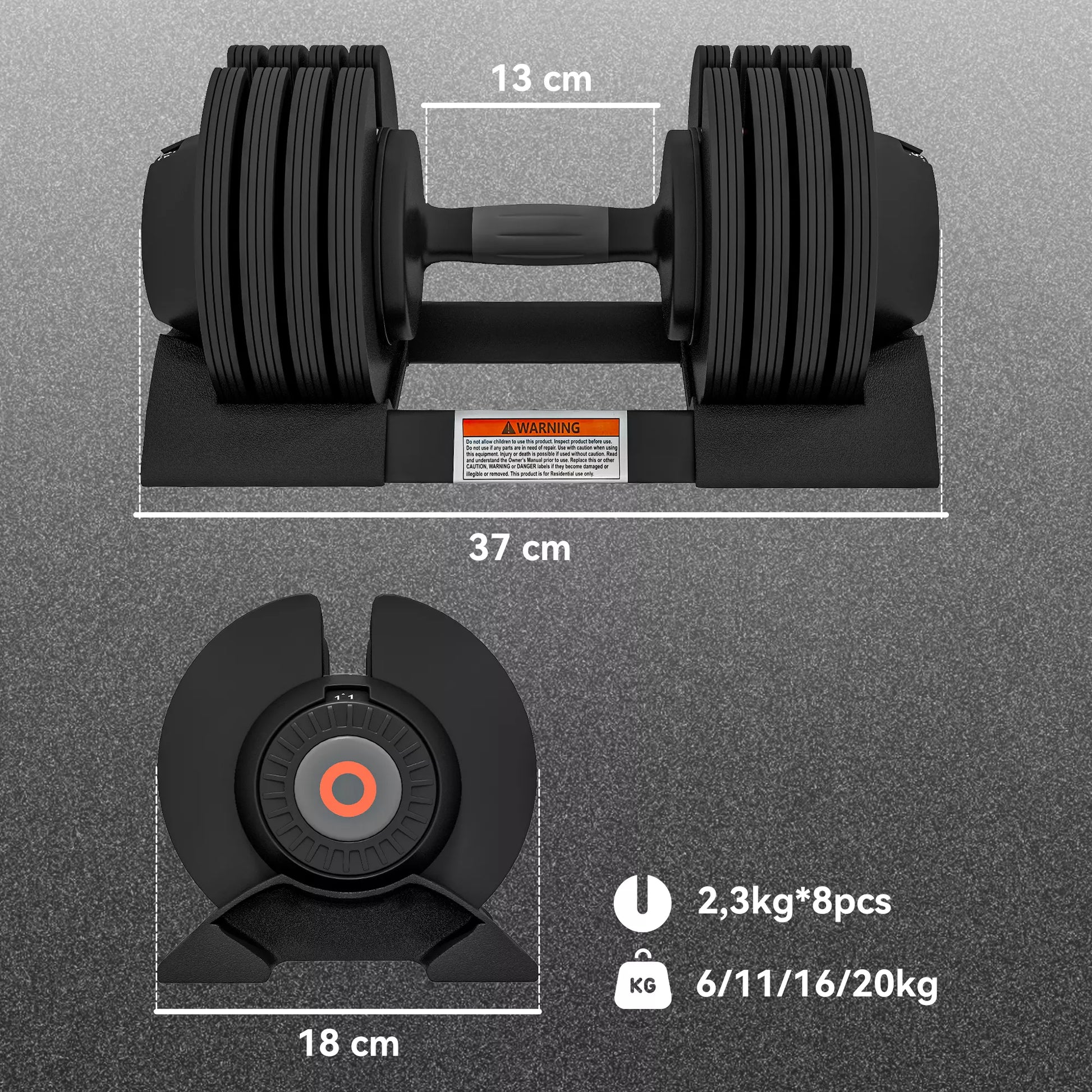 Reguliuojamas atskiras svarmenis, 6/11/16/20 kg hantelis su laikymo padėklu, neslystančiomis rankenomis, juodas