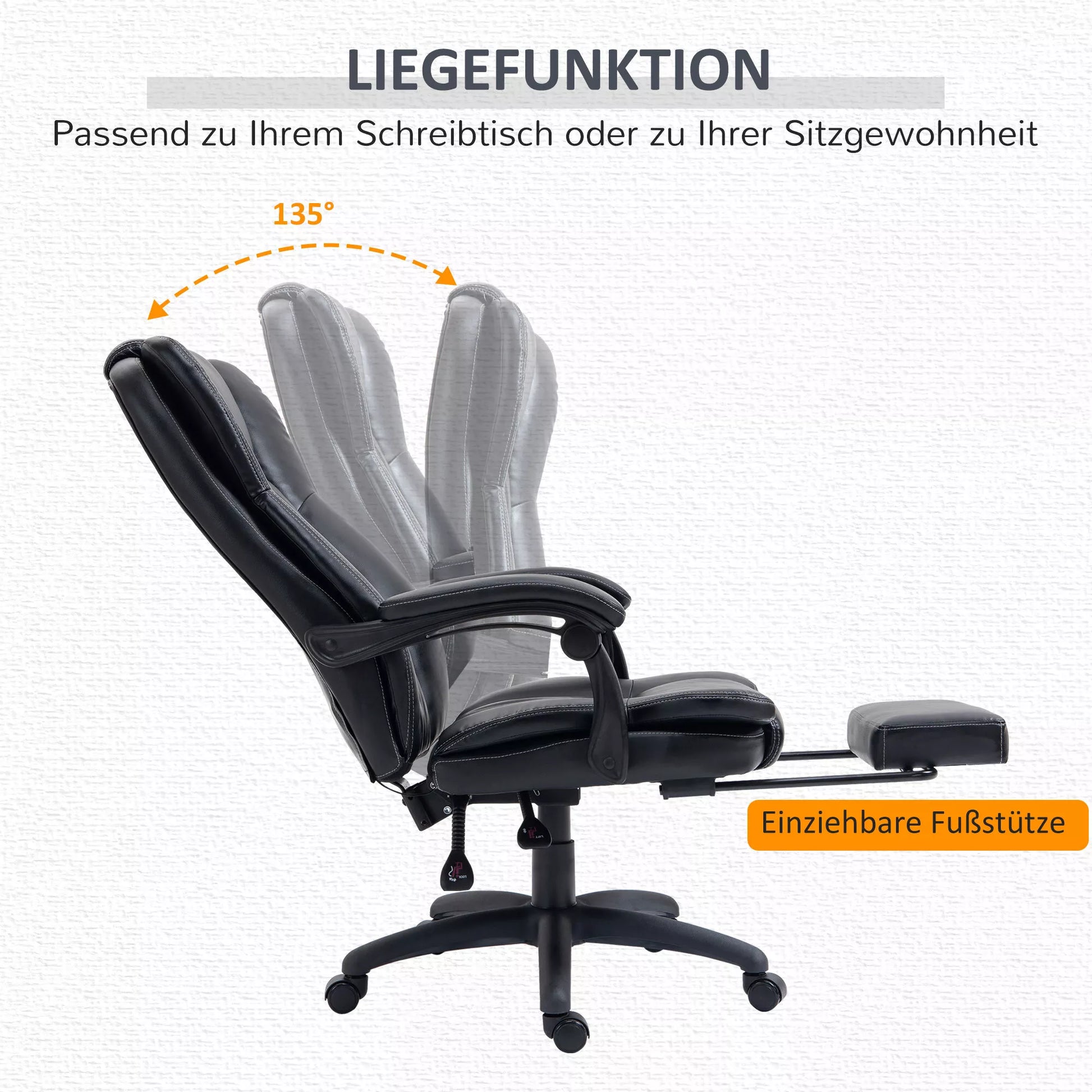 - ✔ 135 laipsnių atlošiama biuro kėdė su ištraukiama kojų atrama ir reguliuojamo aukščio sėdyne asmeniniam komfortui