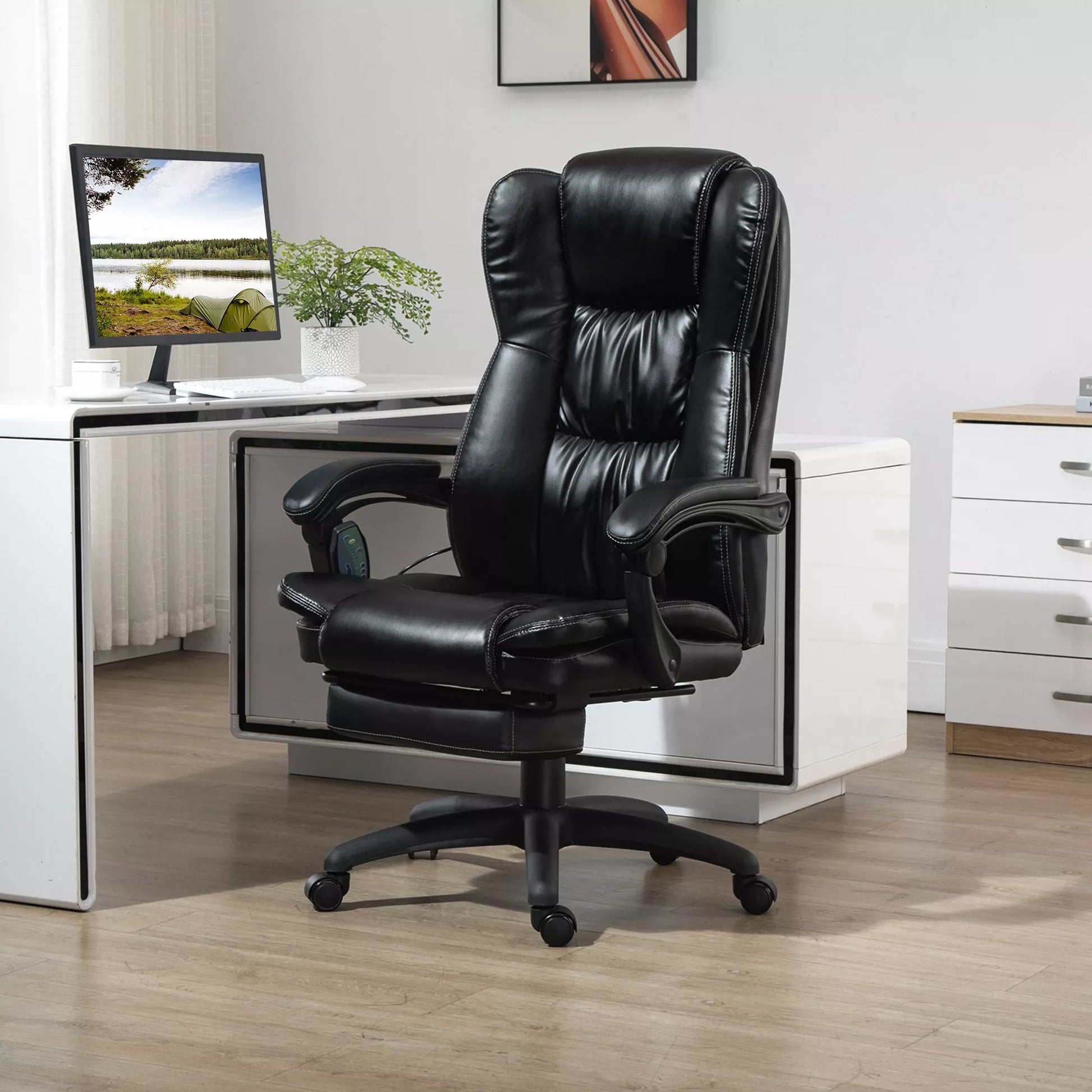 - ✔ Paminkštinti porankiai ir storas paminkštinimas ant biuro kėdės su kojų atrama suteikia jaukumo