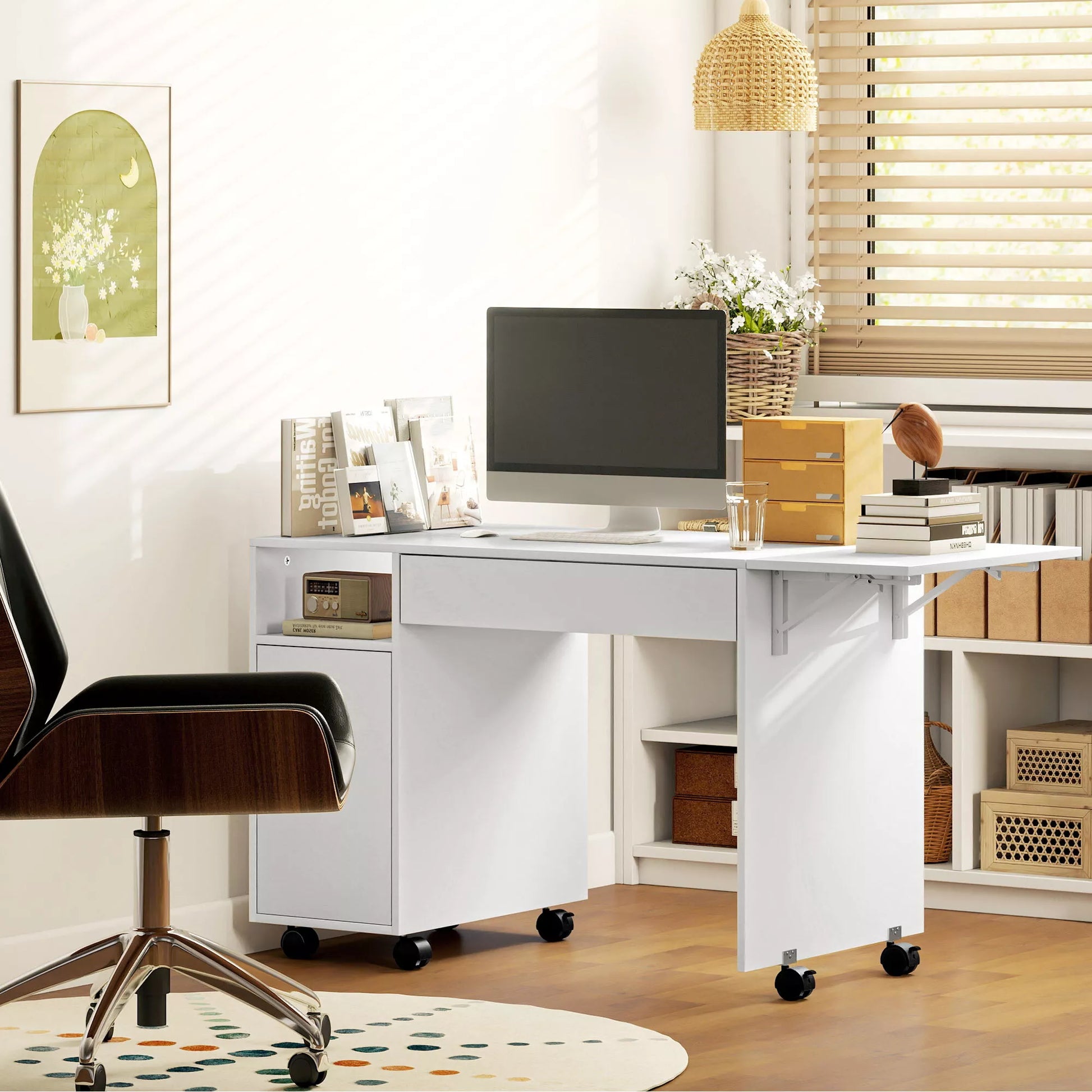 Riedžiamasis kompiuterio stalas, sulankstomas rašomasis stalas su spintele ir stalčiumi, MDP, Balta