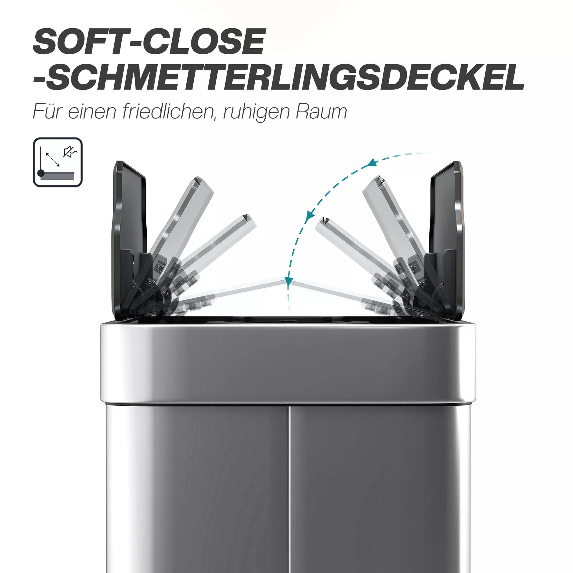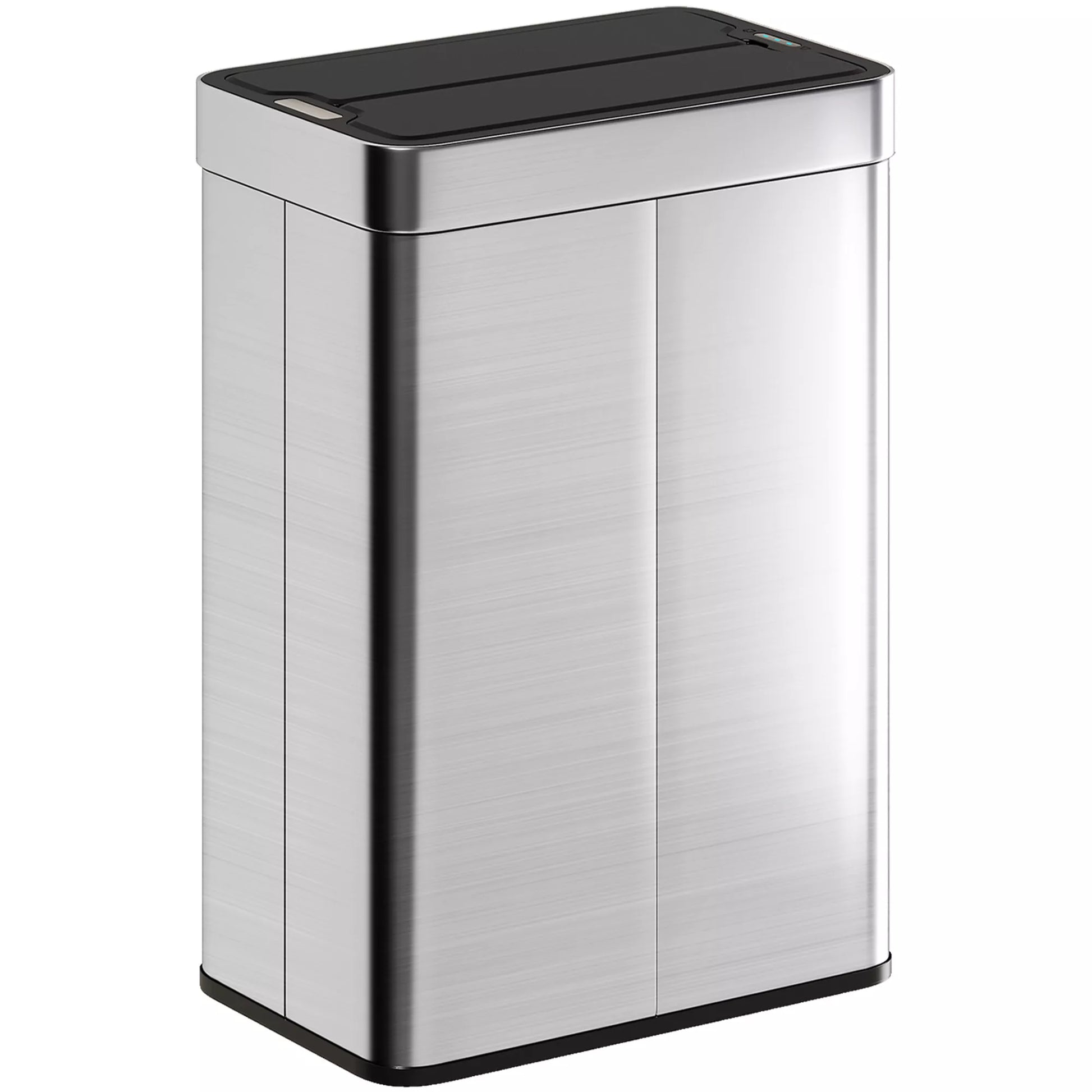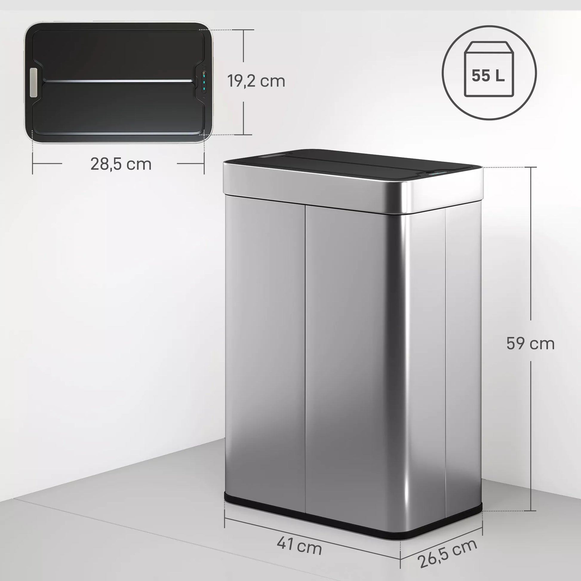 Pavargote nuo netvarkingo atliekų išvežimo ir garsiai užsidarančių dangčių, kai rankos užimtos? 55 L sensorinė šiukšliadėžė yra sprendimas: ji puikiai telpa mažuose kampeliuose, o jos didelio jautrumo jutiklis leidžia naudoti neličiant. Elektrinės šiukšliadėžės dvigubi dangčiai užsidaro tyliai, o šlifuotas nerūdijantis plienas yra atsparus nešvarumams ir lengvai valomas, užtikrinant higienišką ir ilgalaikę ramią virtuvę.