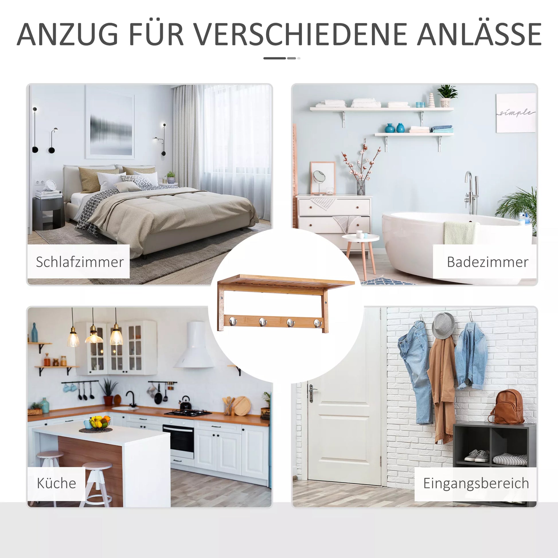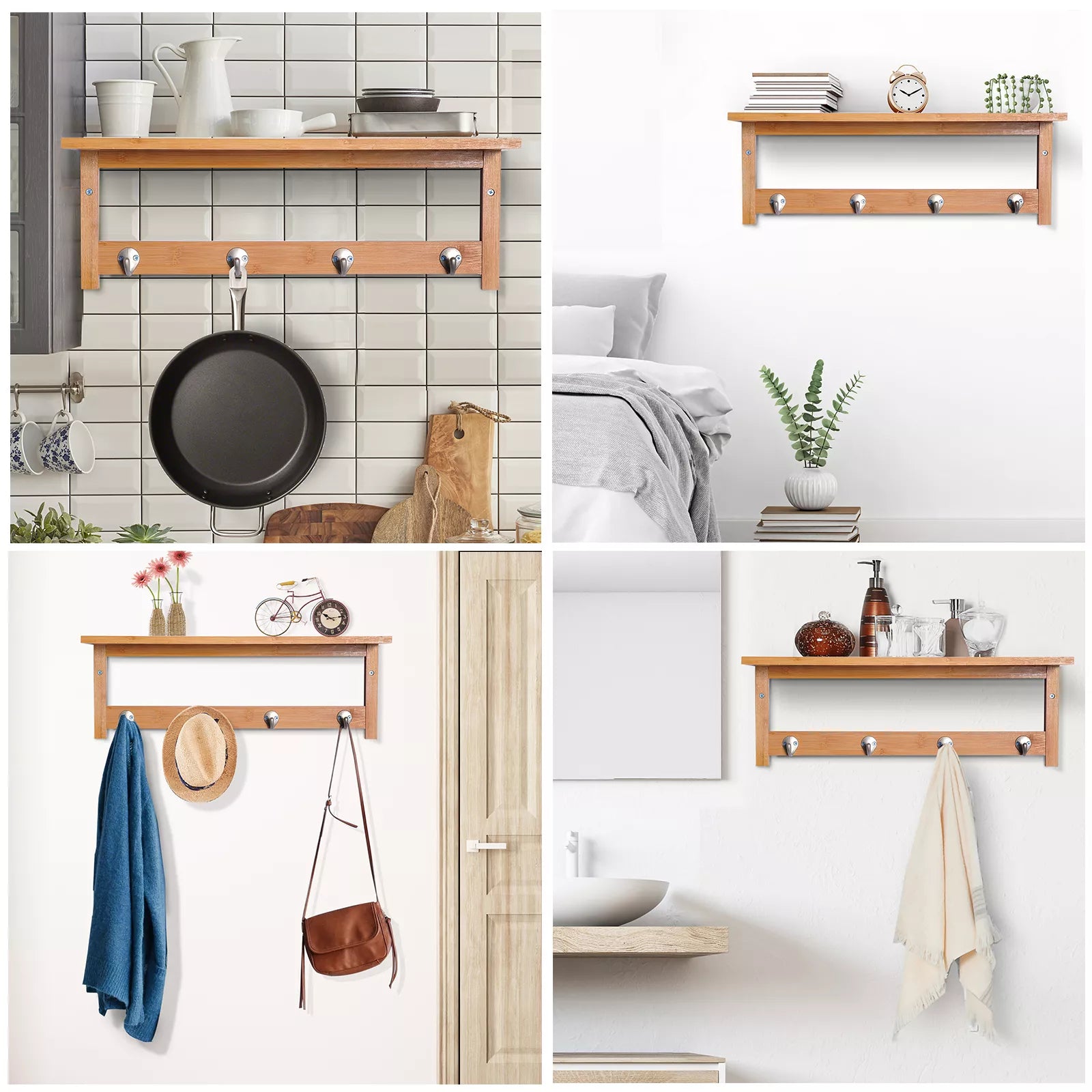 Sieninė drabužinė su kabliukais, tvirtinama prie sienos, erdvę taupanti, atlaiko iki 5 kg, 50 x 16 x 17,5 cm, natūralaus medžio