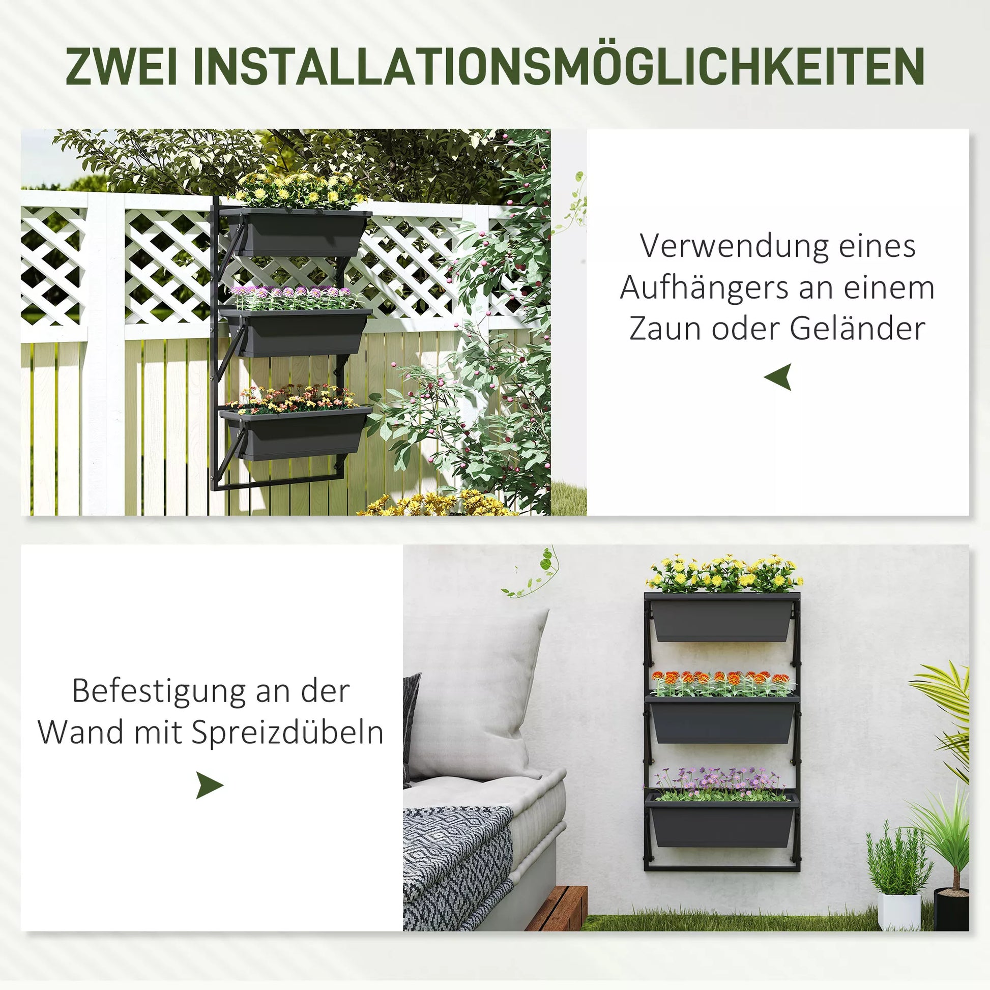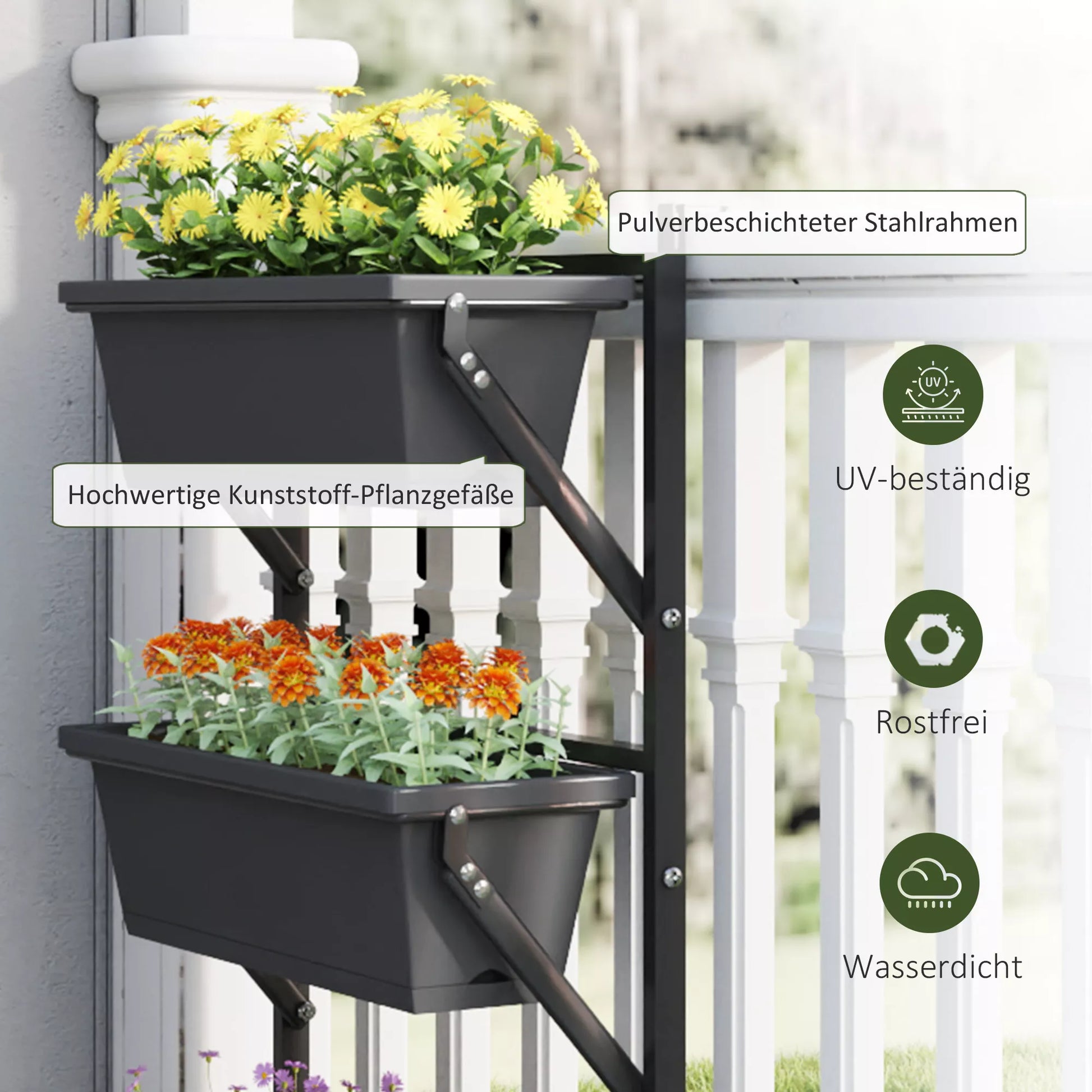 Paverskite savo terasą klestinčiu sodu su šiuo lauko gėlių vazonu! Šis trijų pakopų vertikalus sodintuvas su 10 litrų talpos indais leidžia pasodinti įvairiaspalvių gėlių, daržovių ar žolelių. Apgalvotai suprojektuotas su keliais drenažo skylutėmis, didelis vazonas apsaugo nuo vandens kaupimosi ir skatina jūsų augalų augimą. Įvairios vazono tvirtinimo galimybės leis jūsų tvorai, sienai ar turėklams sužydėti.