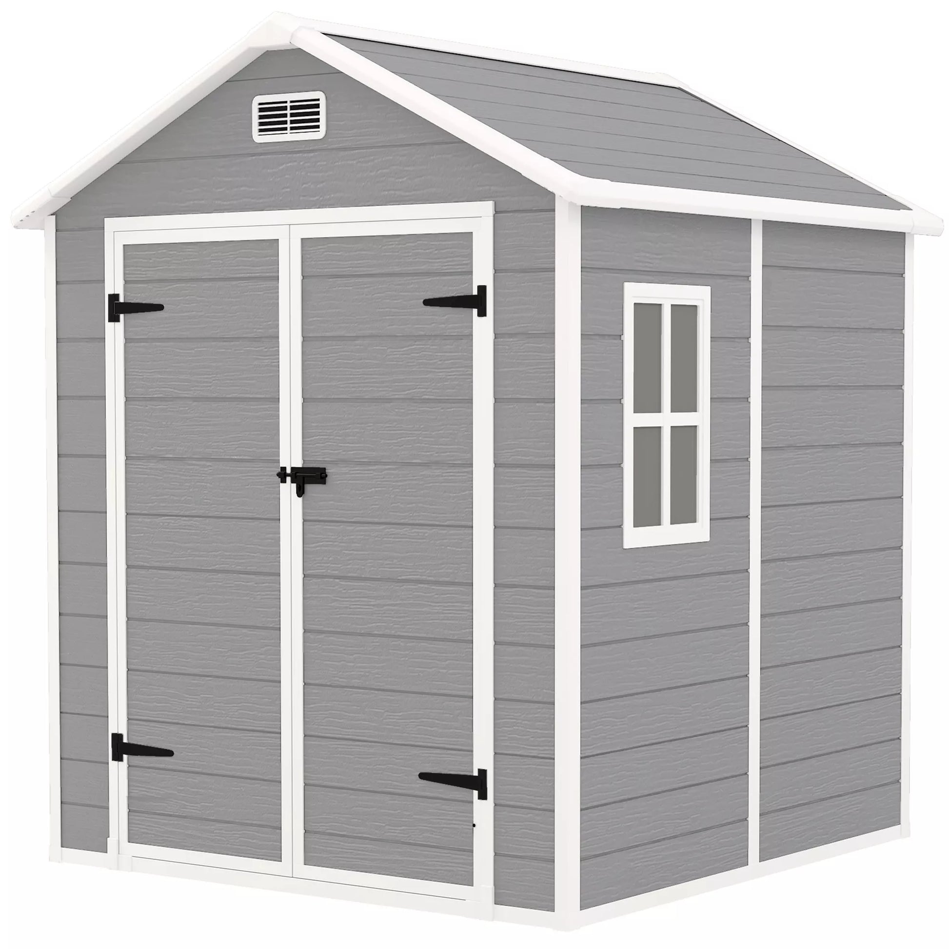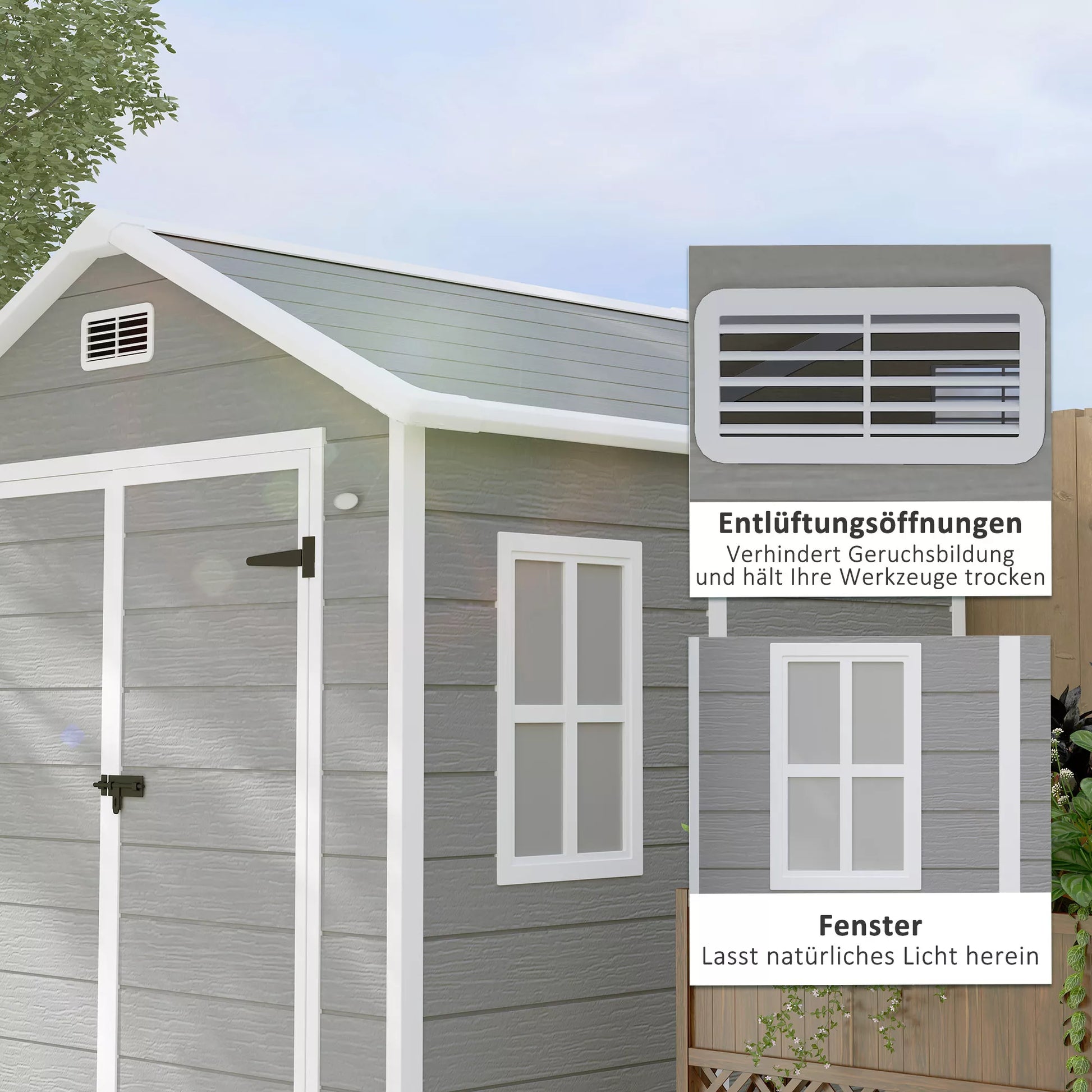 Sodo namelis, įrankių namelis su grindimis, užrakinamos durys, ventiliacijos angos, langai, medžio imitacija, plastikas, pilkos spalvos