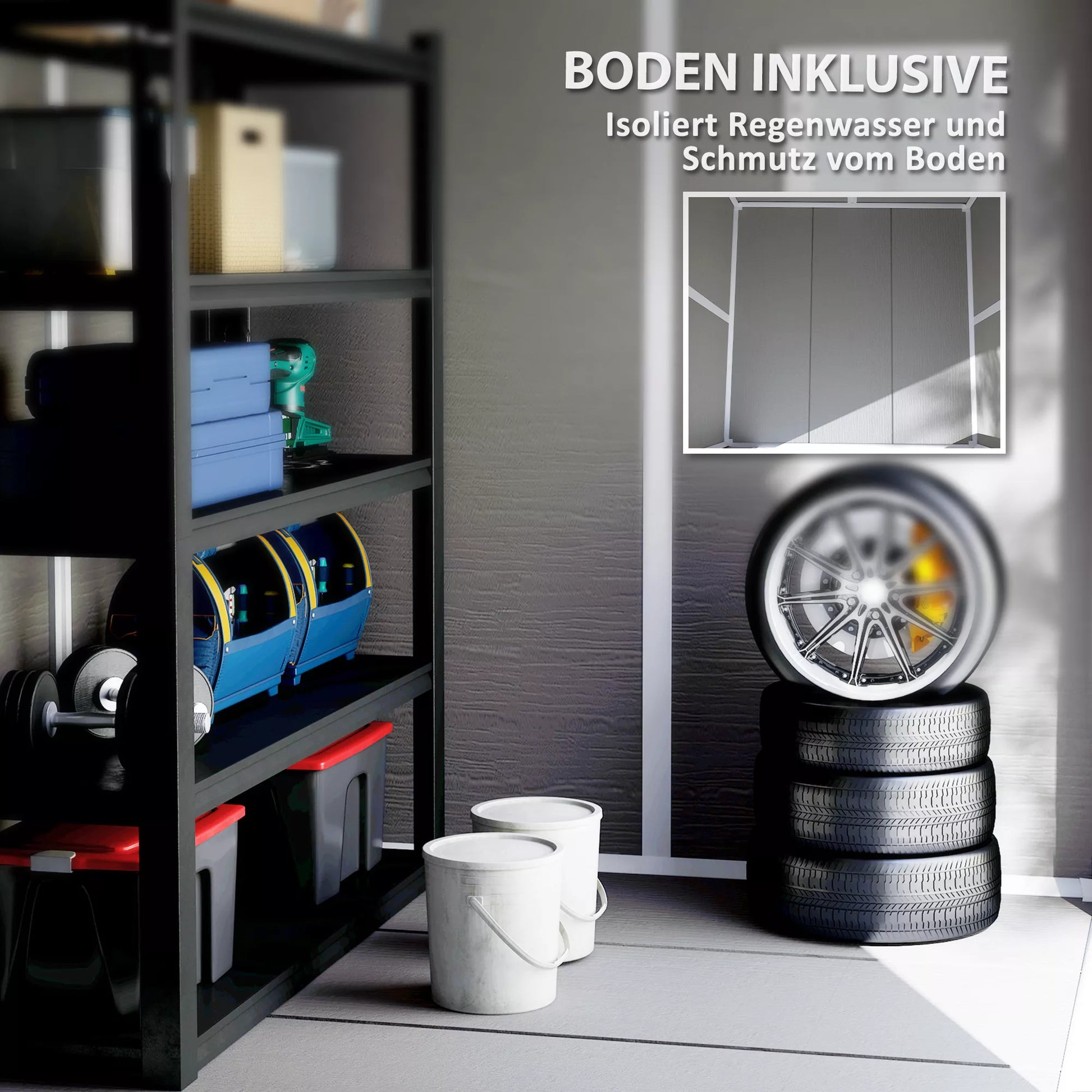 - ✔ Integruotas dviračių namelio dugnas neleidžia prasiskverbti lietaus vandeniui ir apsaugo turinį