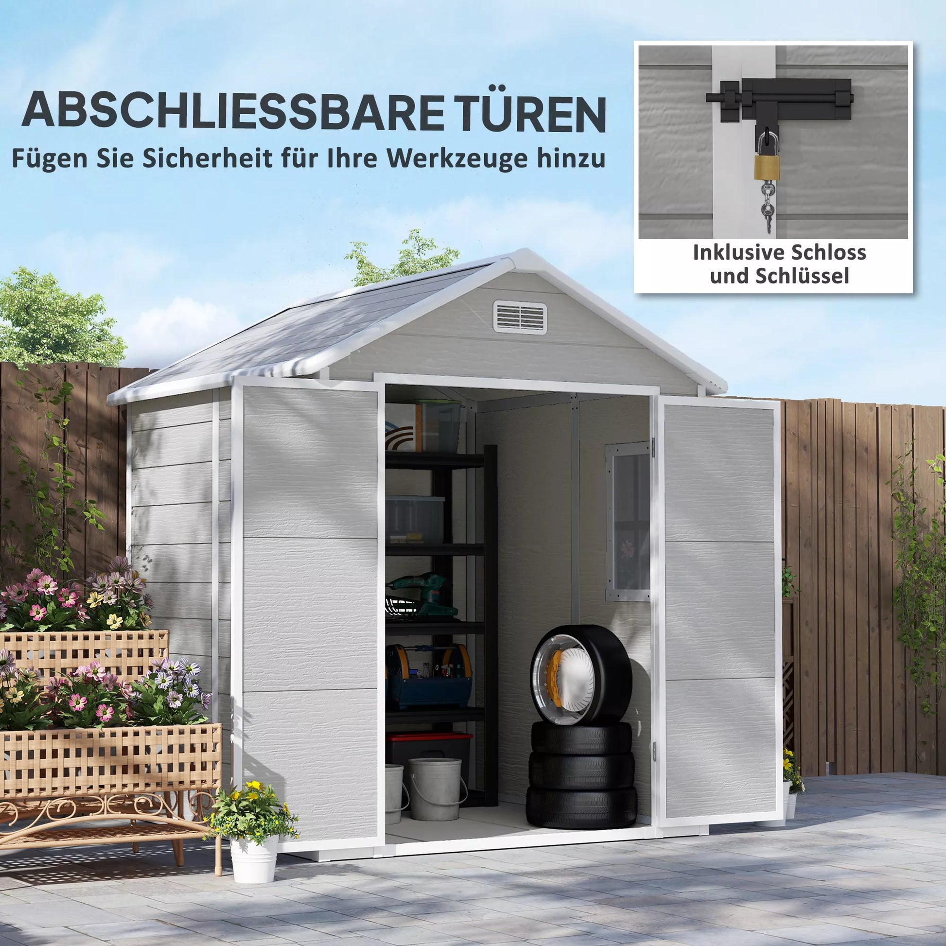 Atraskite mūsų plastikinį sodo namelį, kuriame elegancija dera su praktiškumu. Šis 182 x 151 x 219 cm dydžio dviračių namelis siūlo erdvią 162 x 131 cm vidinę erdvę. Jis pagamintas iš 12 mm storio, medžio raštą imituojančios polipropileno dervos, kuri yra atspari vandeniui ir UV spinduliams. Sodo įrankių namelio langas užtikrina natūralią šviesą, o du ventiliacijos angos garantuoja, kad jūsų daiktai išliktų sausi ir švieži.