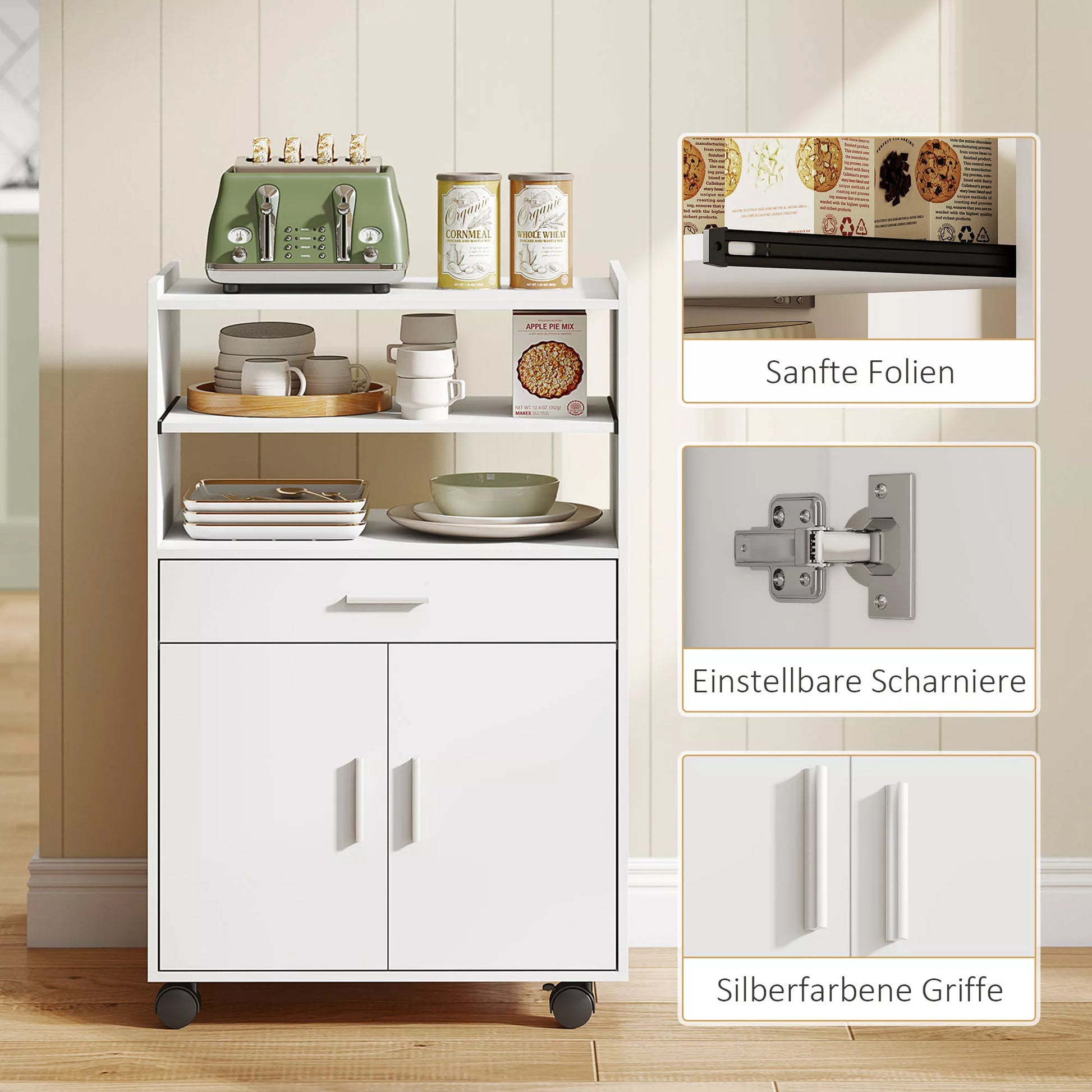 Ar vargstate dėl per mažai vietos virtuvėje? Šis mikrobangų krosnelės spintelė su erdviu stalviršiu, ištraukiama lentyna, stalčiumi ir apatine spintele sutvarkys jūsų virtuvės reikmenis. Dėl pasukamų ratukų virtuvės spintelę lengva perkelti, ji optimizuoja virtuvės išdėstymą ir užtikrina saugų mikrobangų krosnelės bei kitų prietaisų laikymą. Šis virtuvės bufetas užtikrina visišką saugumą tikrai funkcionalioje ir saugioje virtuvėje.