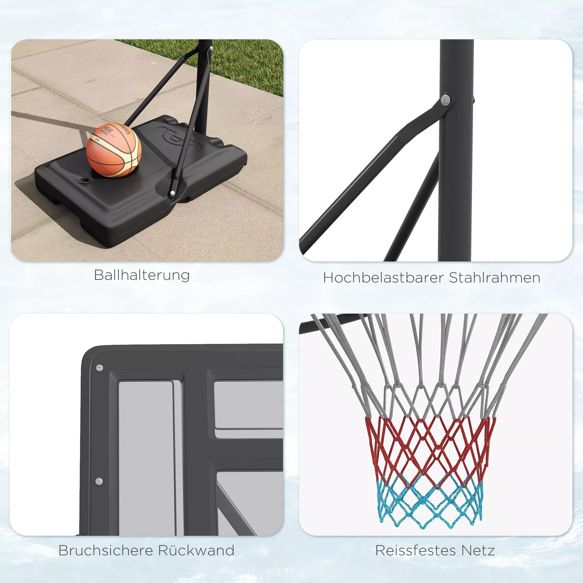- ✔ Pagrinde yra įduba krepšiniui, neleidžia jam nuristi, kai nenaudojamas