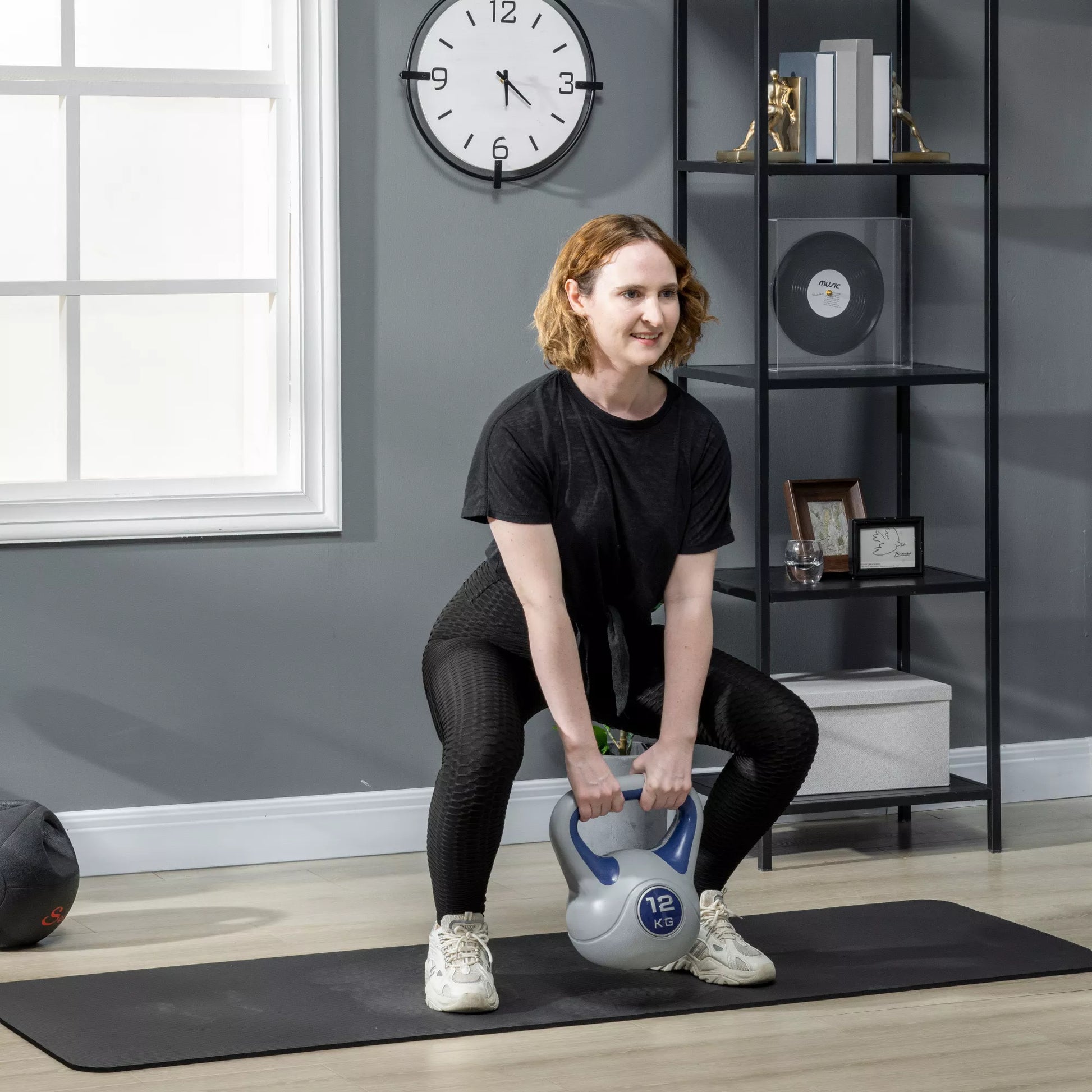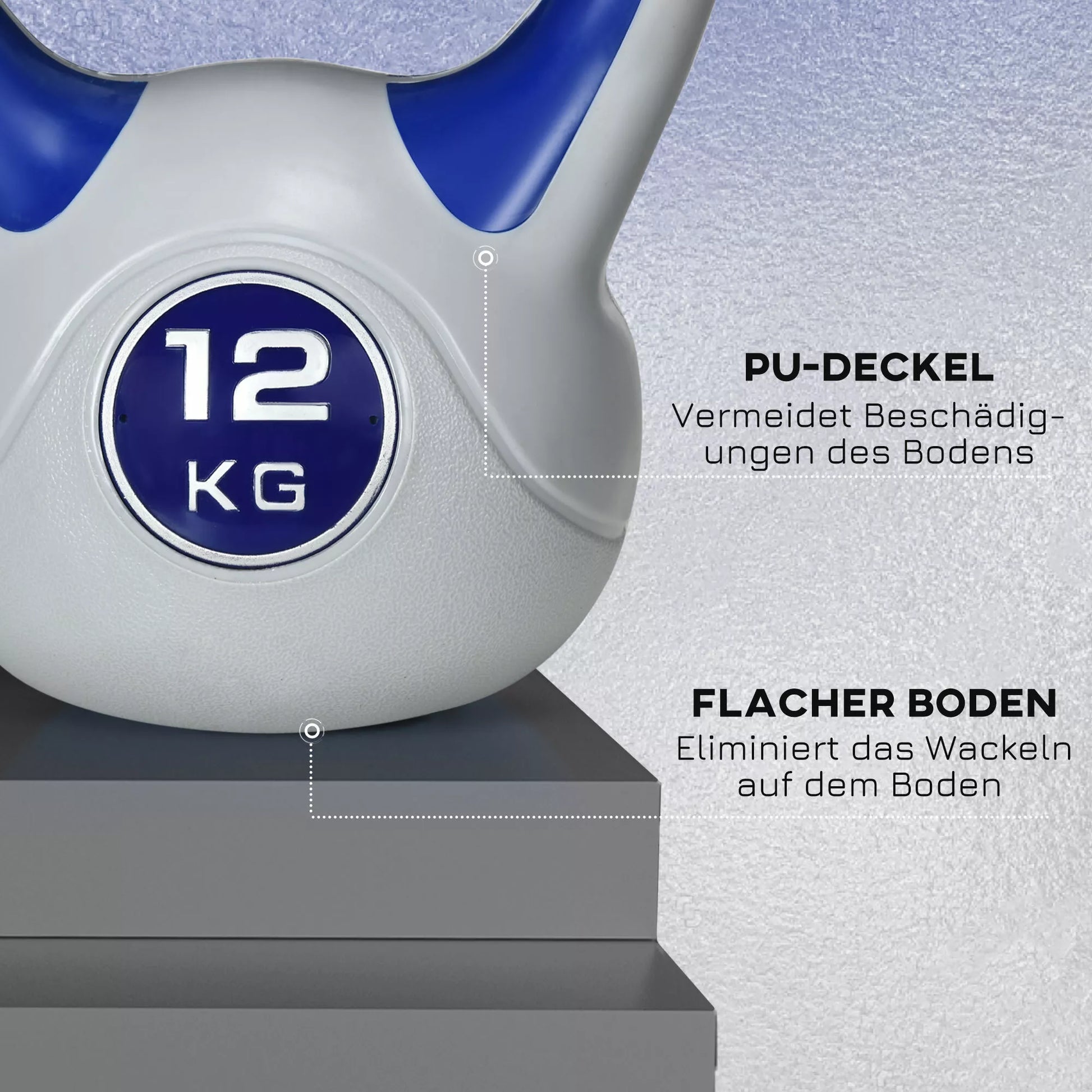Kettlebelis, 12 kg, plokščias pagrindas, didelė rankena, plastiko danga, mėlyna, 24 x 17 x 28 cm