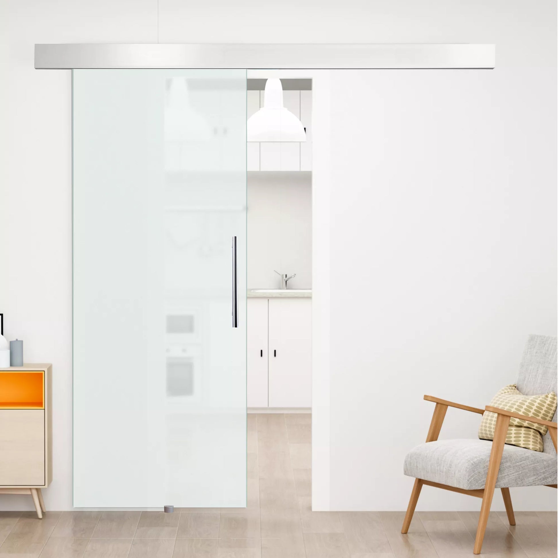 Nesvarbu, ar kaip erdvės daliklis, įėjimo durys ar modernios biuro durys: šių stumdomųjų durų pritaikymo galimybės yra įvairios. Jos pagamintos iš aukštos kokybės stiklo, tvirtos ir stabilios, o dėl matinės išvaizdos suteikia jūsų erdvei atviresnį pojūtį. Jos tvirtinamos prie aliuminio pakabinamos sistemos. Dėl to jas galima stumti maloniai tyliai, visiškai be papildomo kreipiamojo bėgio grindyse. Durys tiekiamos kaip pilnas komplektas, todėl net neturint rankinių įgūdžių jas galima lengvai sumontuoti.