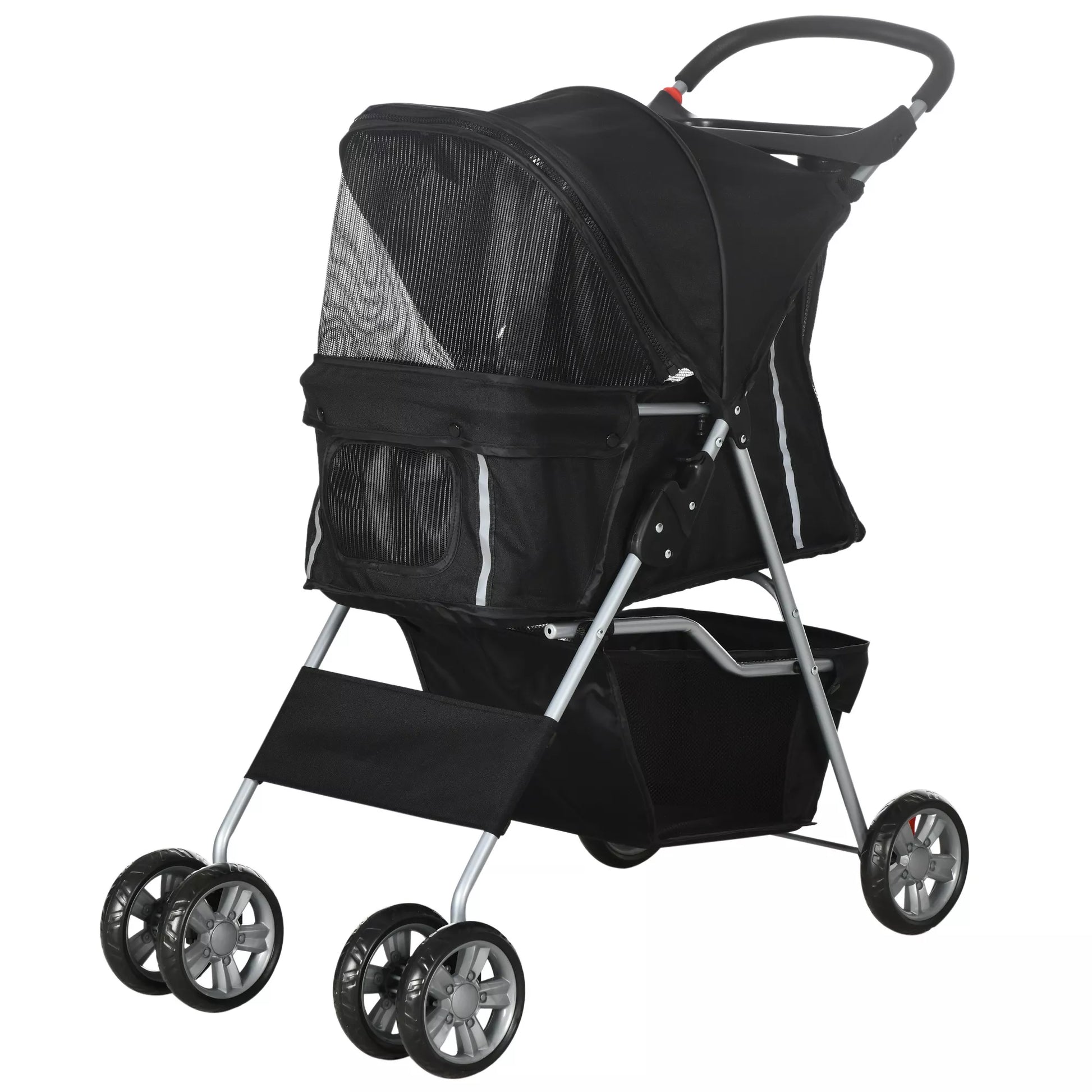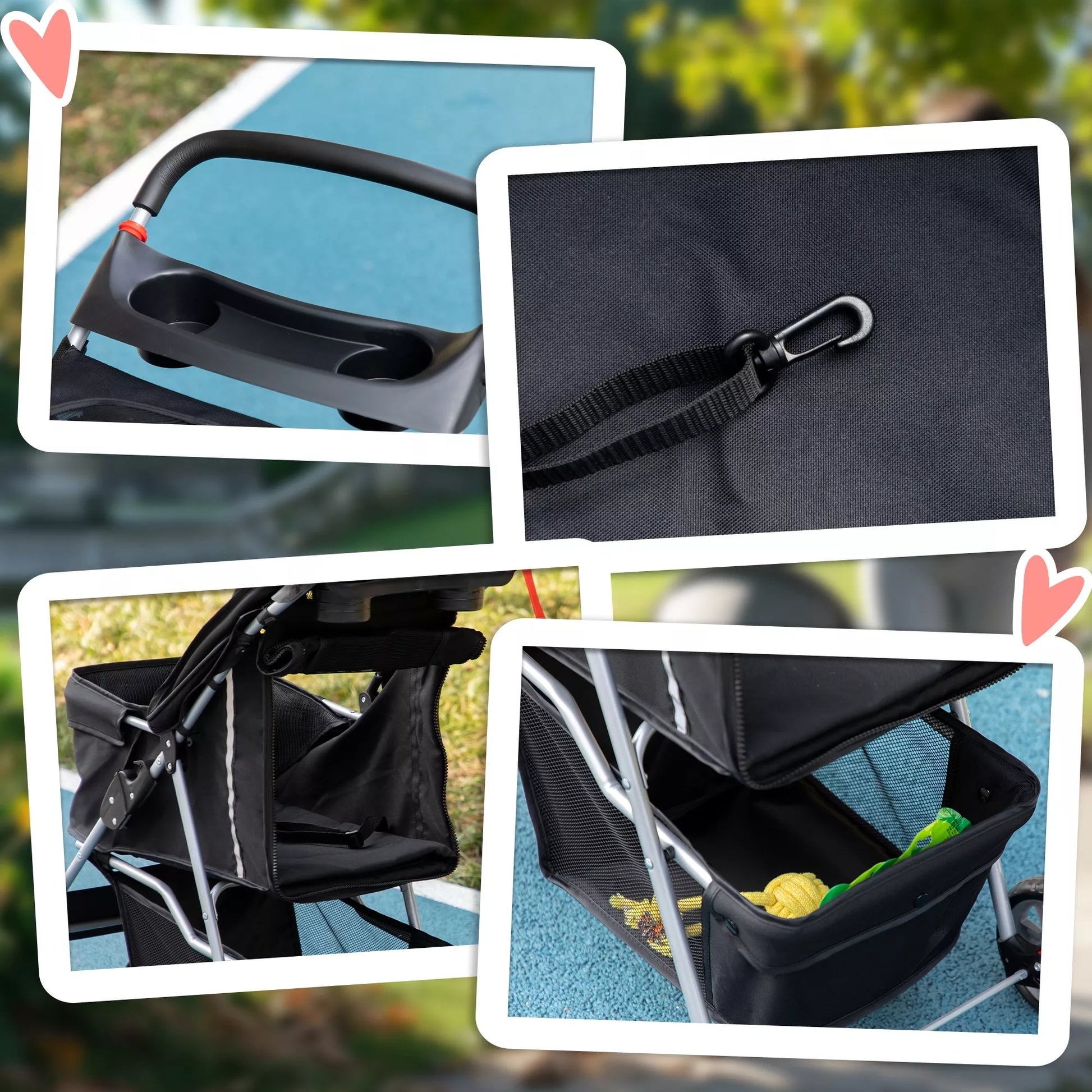 Sulankstomas šunų vežimėlis su puodelio laikikliu ir stogeliu nuo saulės, juodas