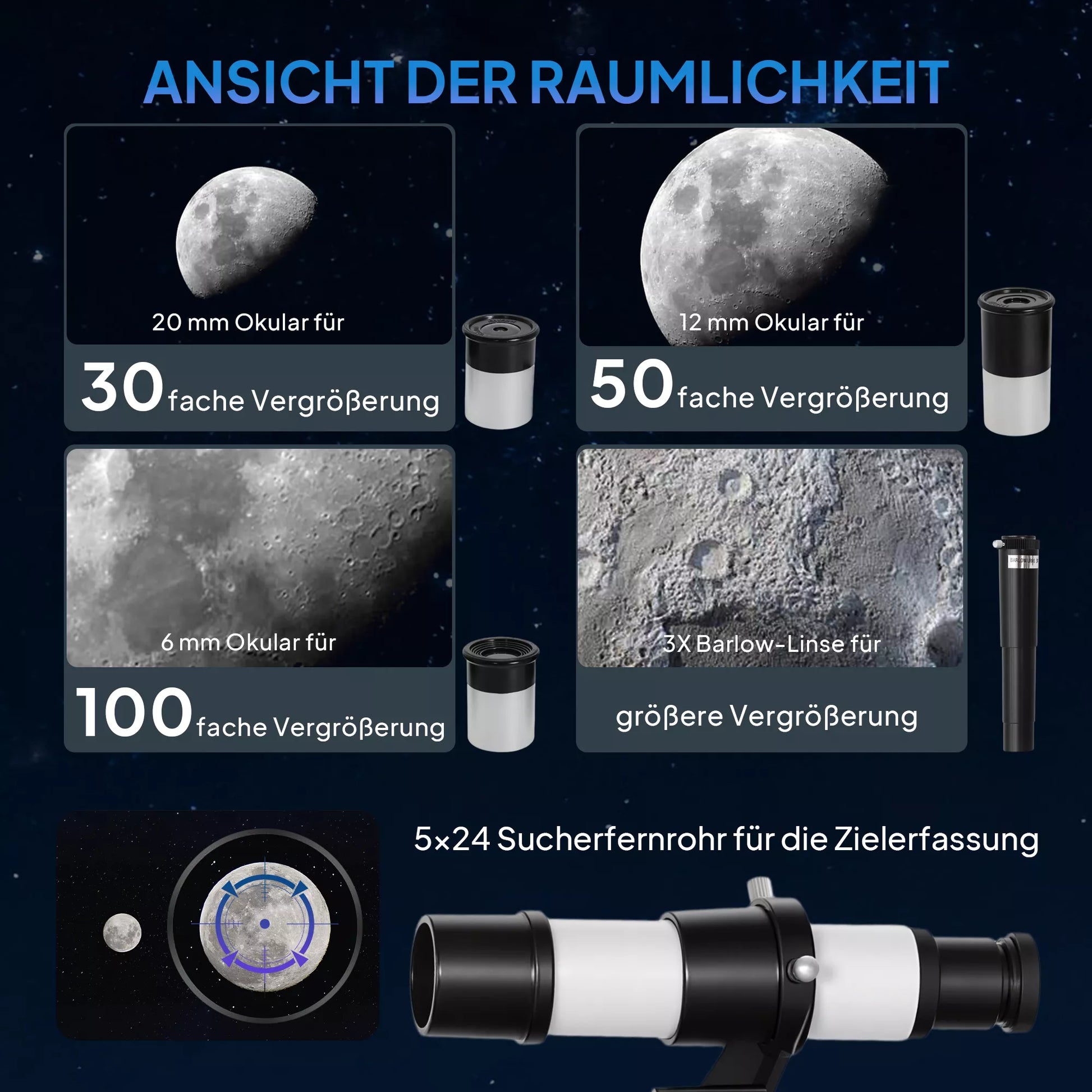 - ✔ Teleskopo 3X Barlow lęšis trigubai padidina vaizdą gilesniam tyrinėjimui