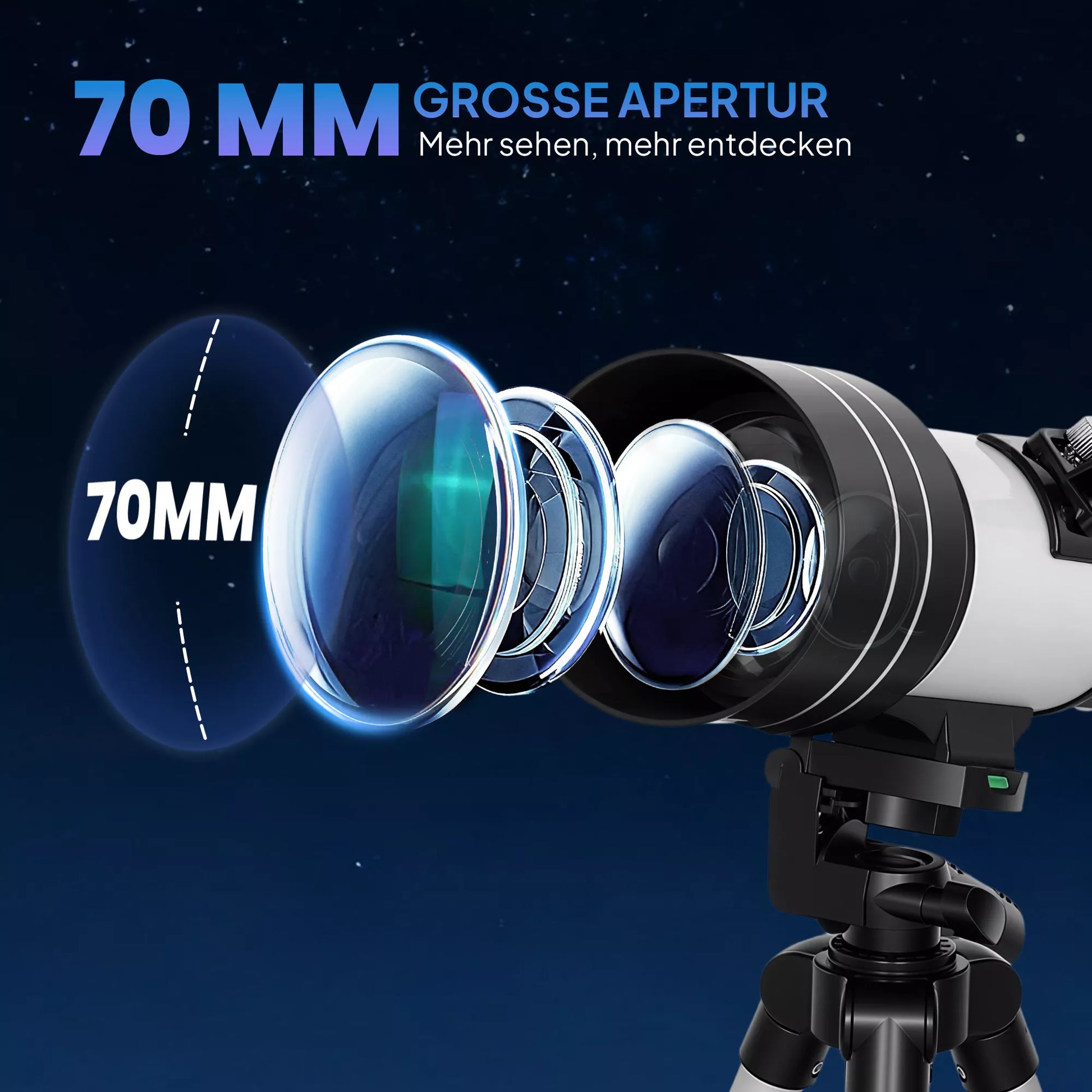- ✔ 70 mm objektyvas leidžia matyti platesnį kosminių objektų vaizdą