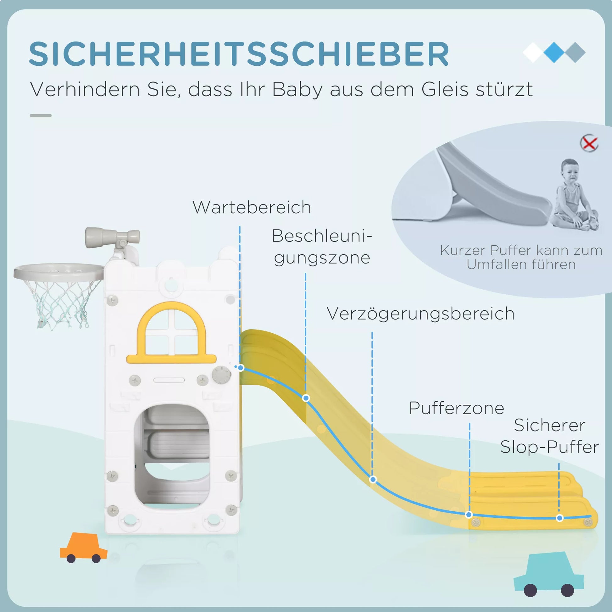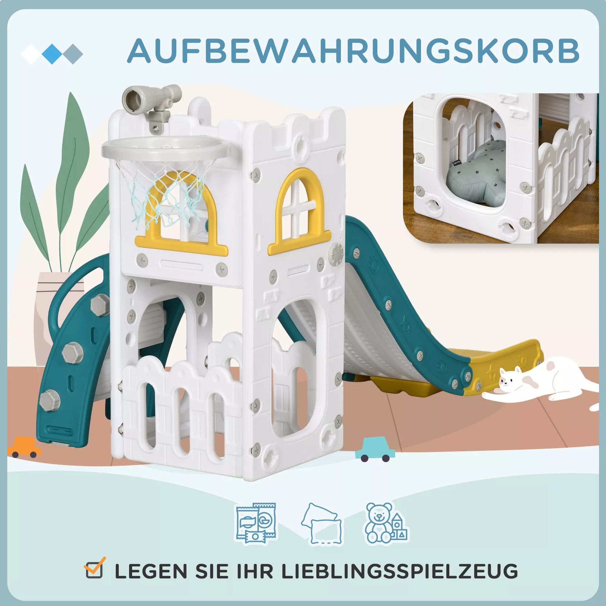 Patirkite begalinį džiaugsmą su vaikiška čiuožykla! Mūsų 5-in-1 mažylių čiuožykla turi jaudinančią čiuožyklą su greitėjimo ir lėtėjimo zonomis bei saugos buferiu. Papildomai integruotas krepšinio lankas ir teleskopas nuotykių kupiniems žaidimams. Su uždaromis pakopomis, apsaugančiomis nuo slydimo, idealiai tinka mažiems tyrinėtojams nuo 1-3 metų.