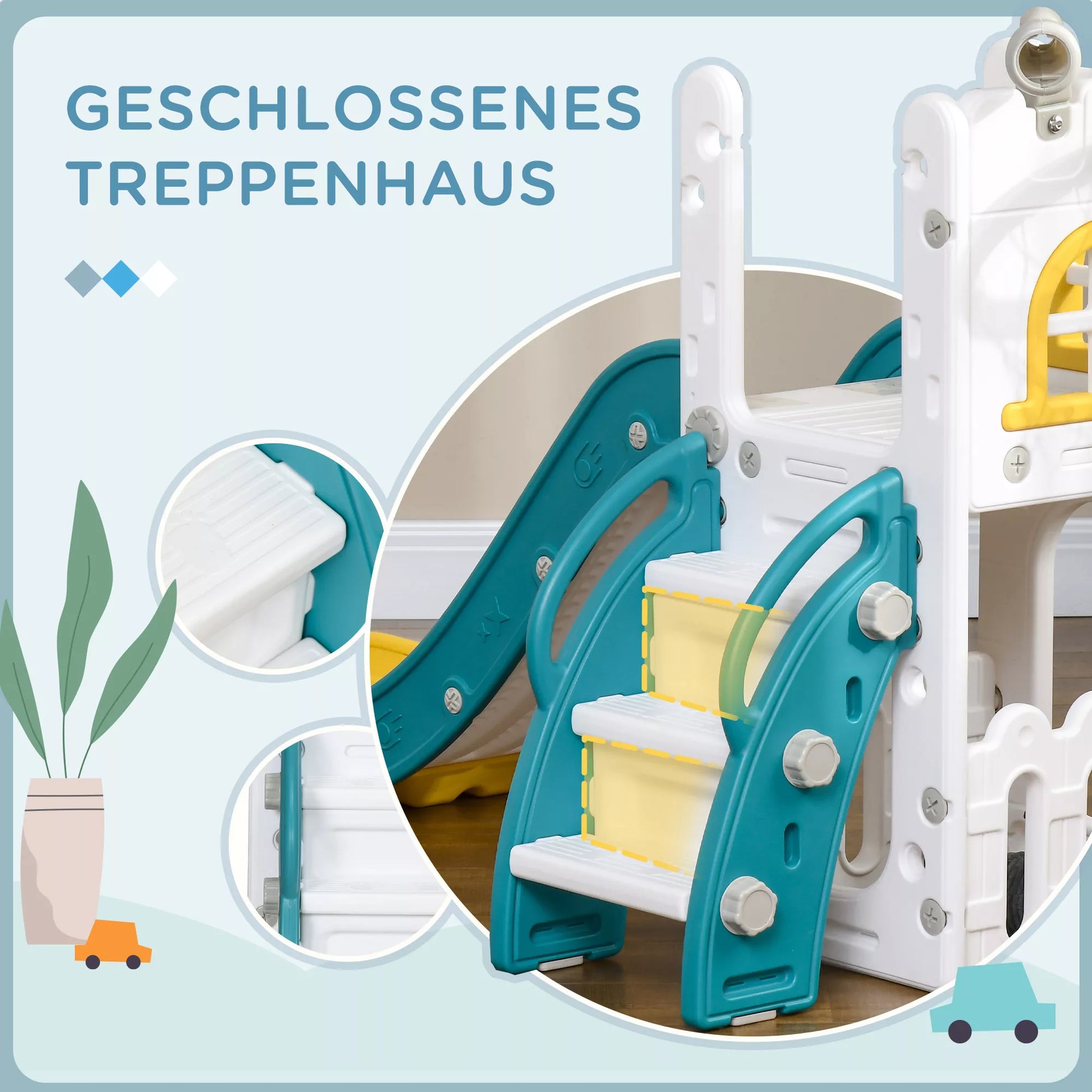 - ✔ Uždaro tipo neslystančios pakopos didina vaikiškos čiuožyklos saugumą ir stabilumą