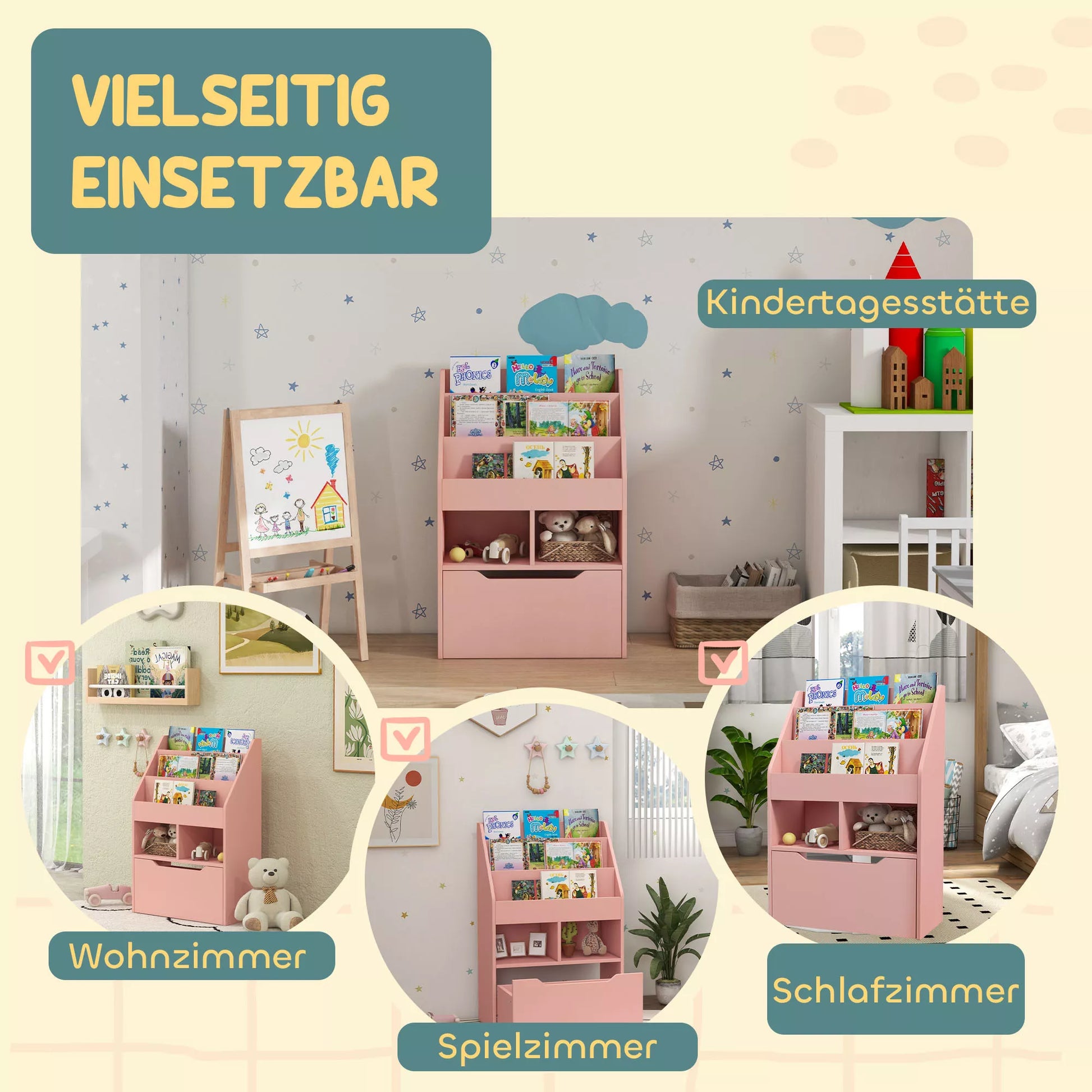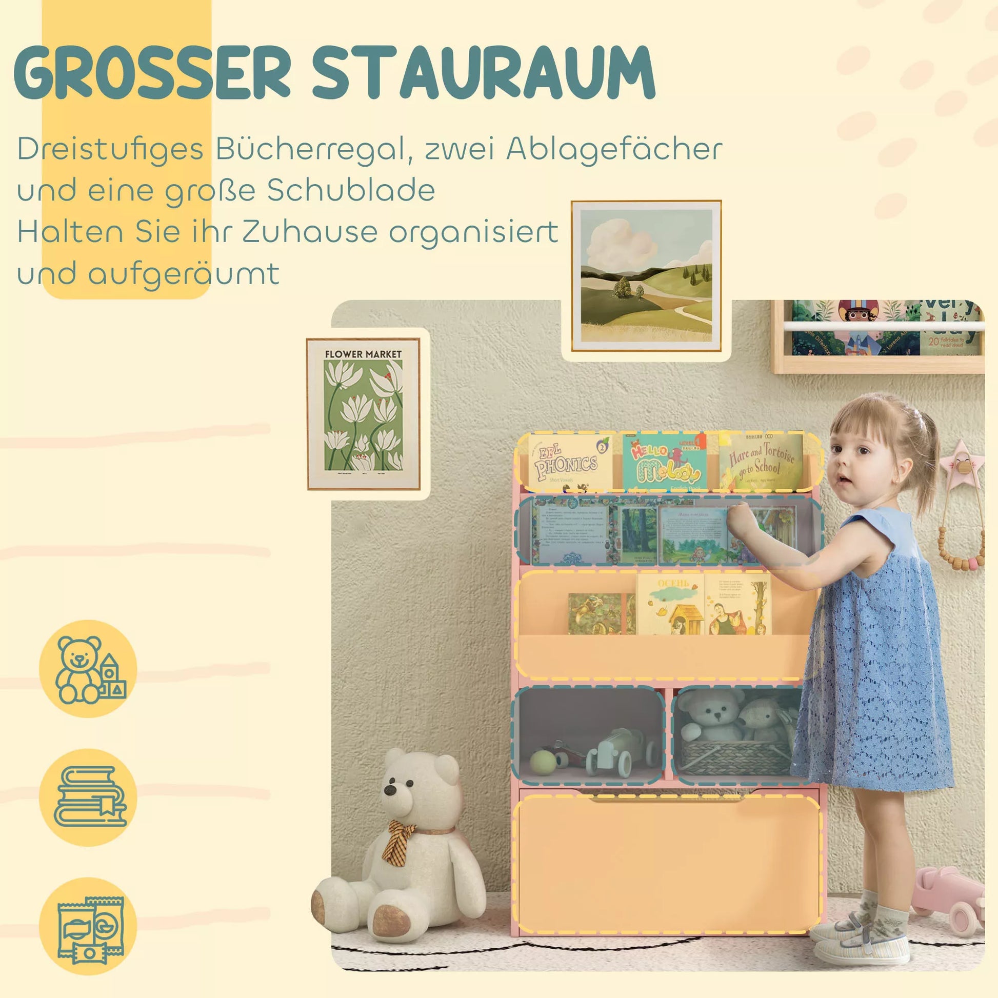 Neatsispiriamas šios [BRAND NAME] vaikiškos knygų lentynos žavesys puikiai atrodys bet kuriame kambaryje. Paprastas šios vaikiškos lentynos dizainas dera prie daugelio interjerų. Dvi lentynėlės, didelė stalčius ir spintelė padės jūsų vaikams palaikyti tvarką. Su šia knygų lentyna tvarkytis bus lengva.