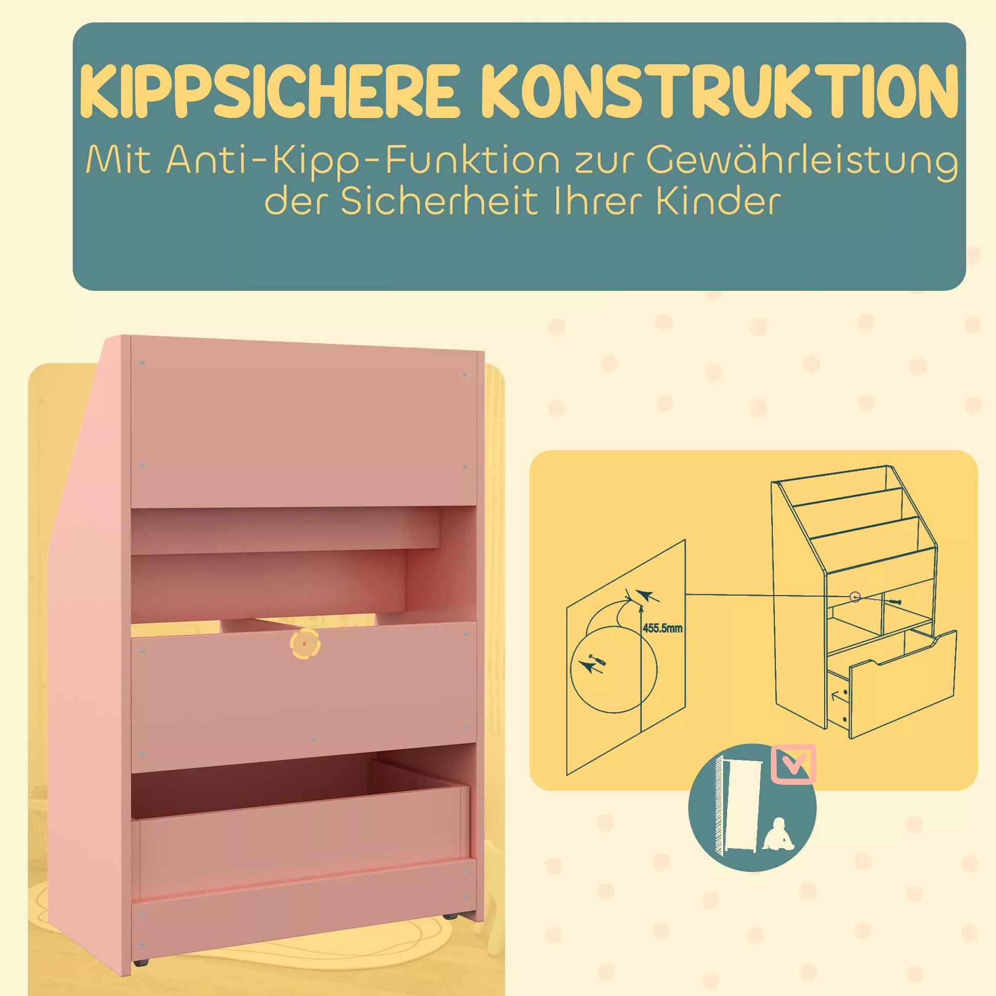 - ✔ Žaislų lentynos apsauga nuo apvirtimo užtikrina didesnį saugumą ir stabilumą