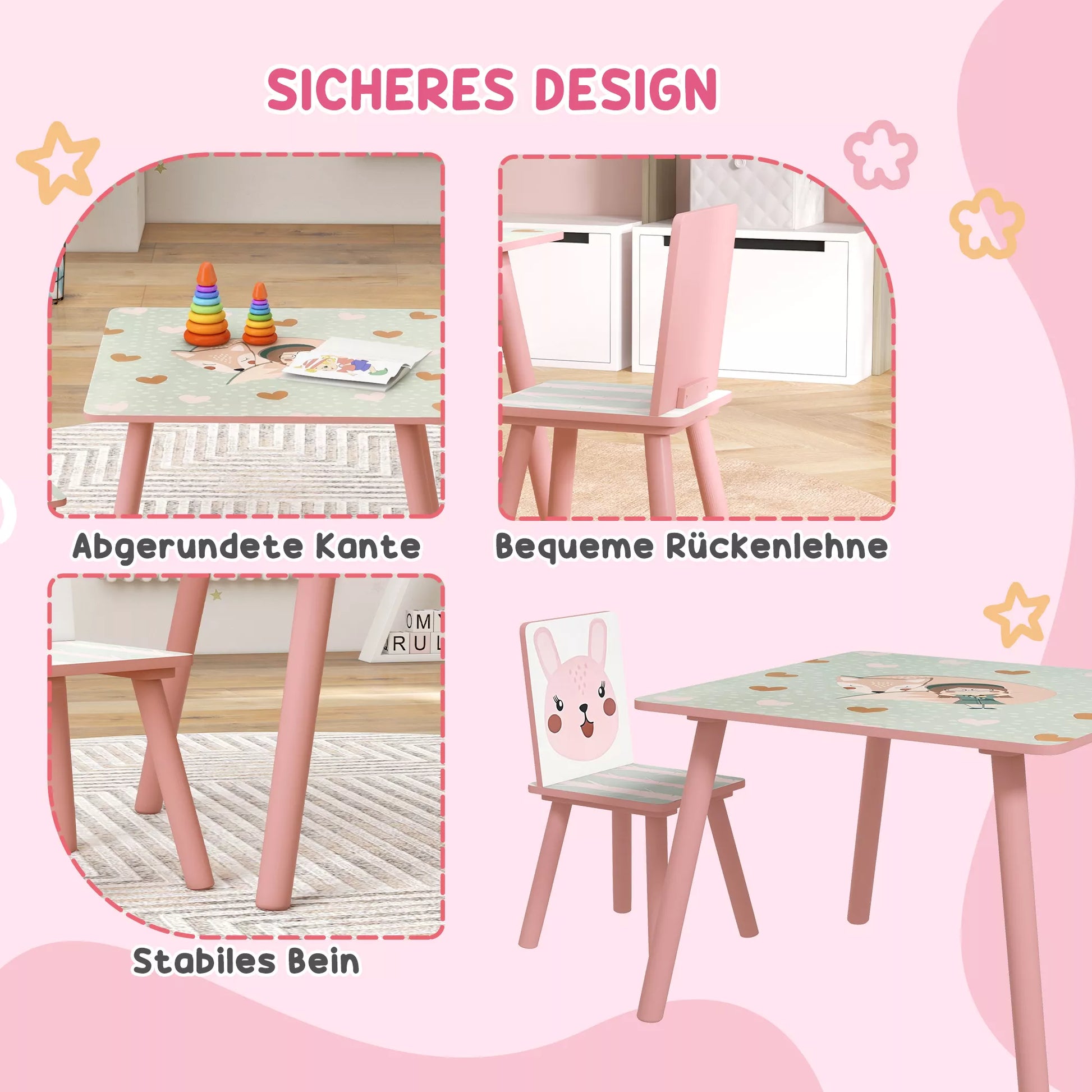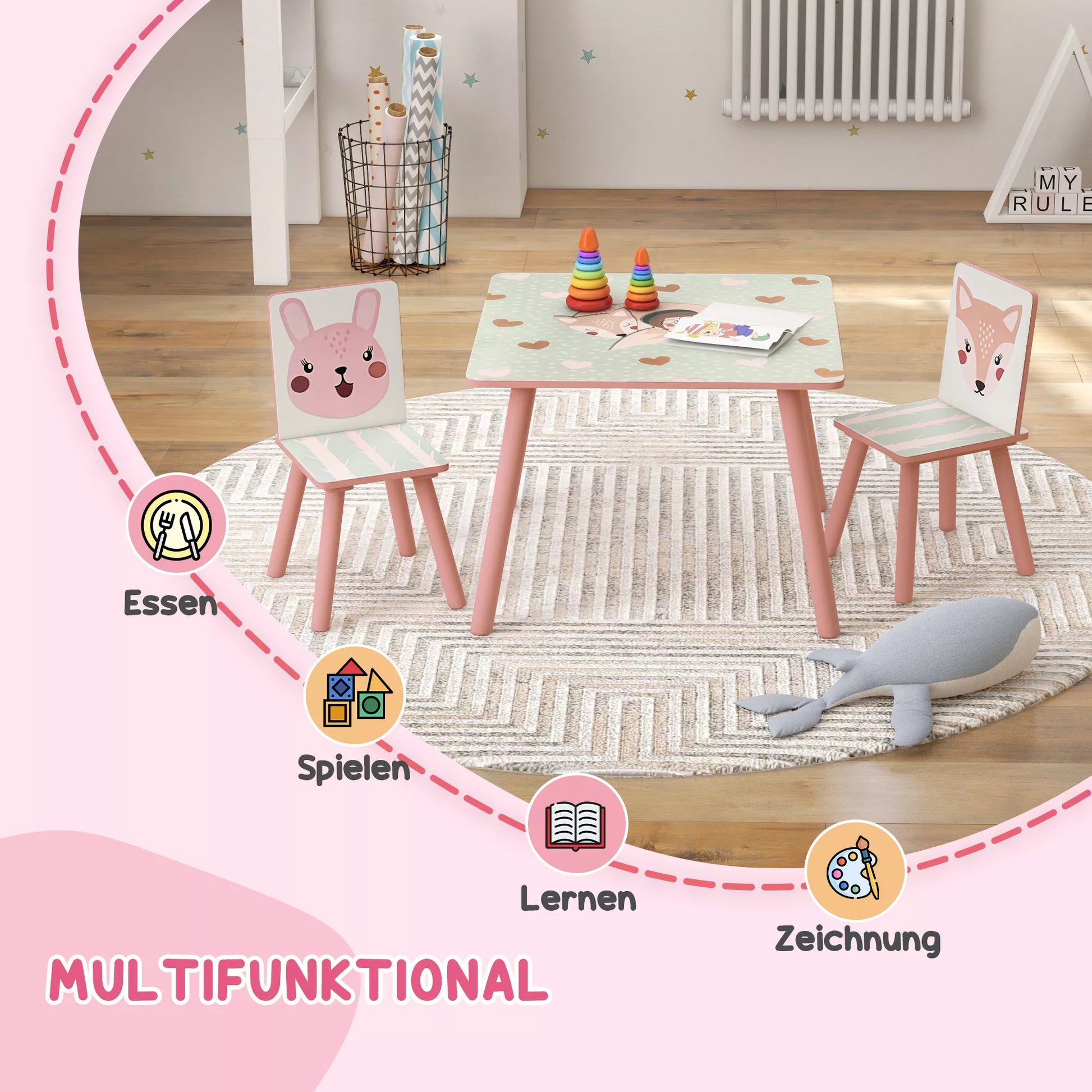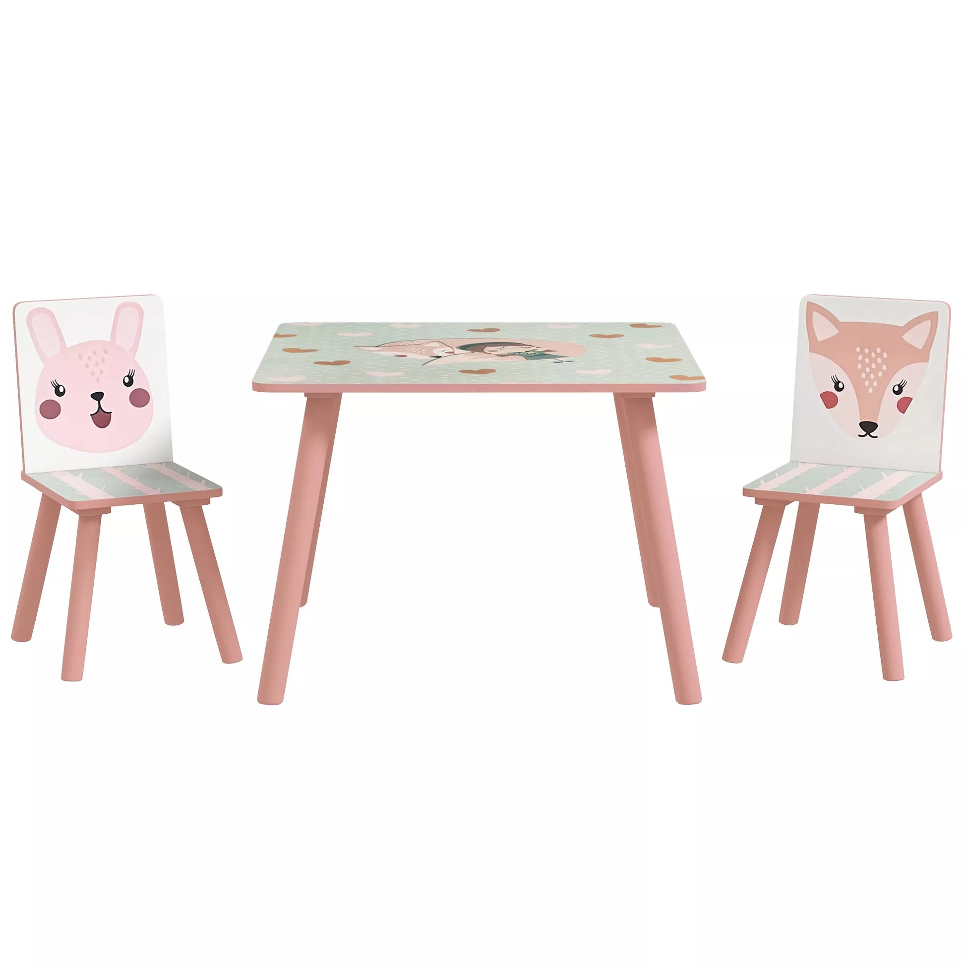 Vaikiška sėdimoji grupė iš pušies medienos, stalas su 2 kėdutėmis, gyvūnų motyvas, skirta vaikų kambariui, 3-8 metai, rožinė