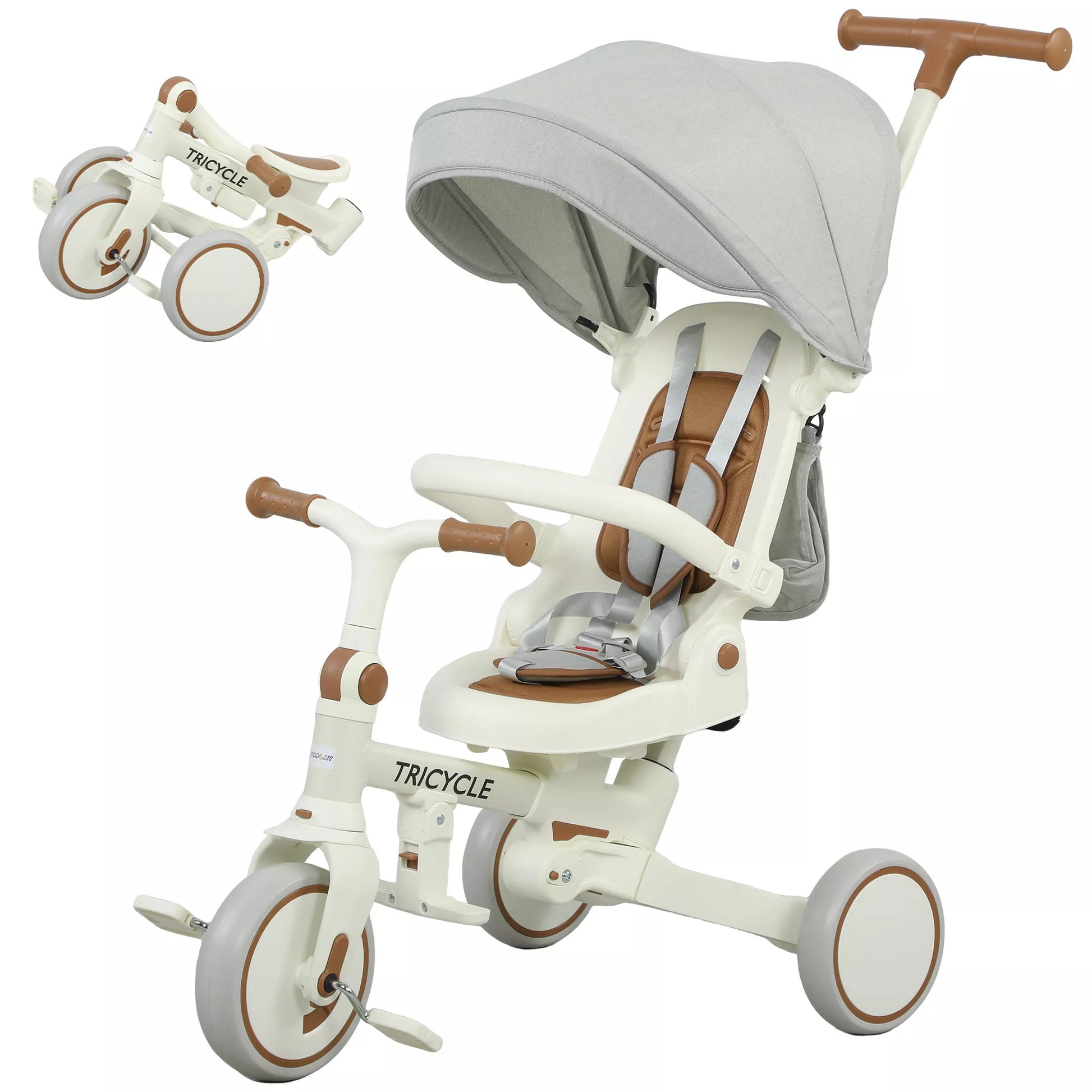 Vaikiškas triratis, transformuojamas vežimėlis, 5-in-1 dizainas, nuimama reguliuojama stūmimo rankena, saugos diržas, daiktų krepšys, 1-3 metai, kreminės baltos spalvos