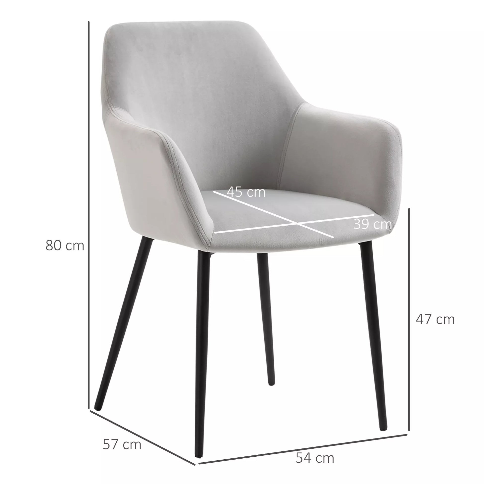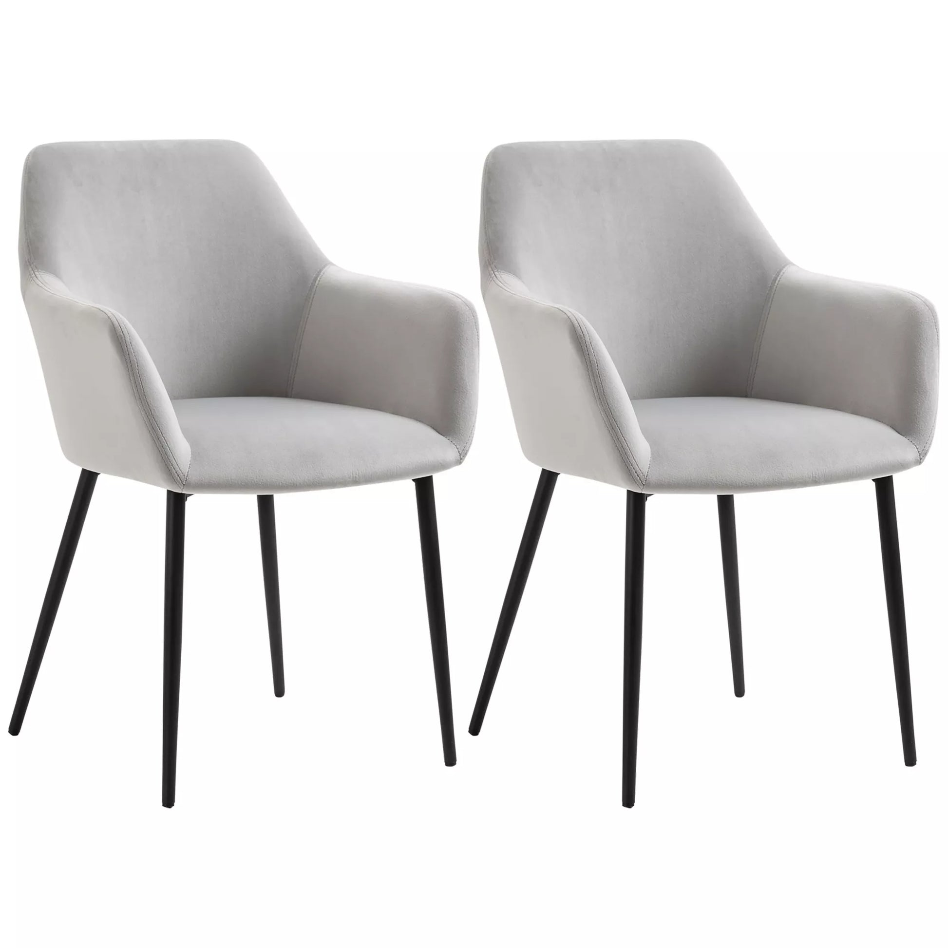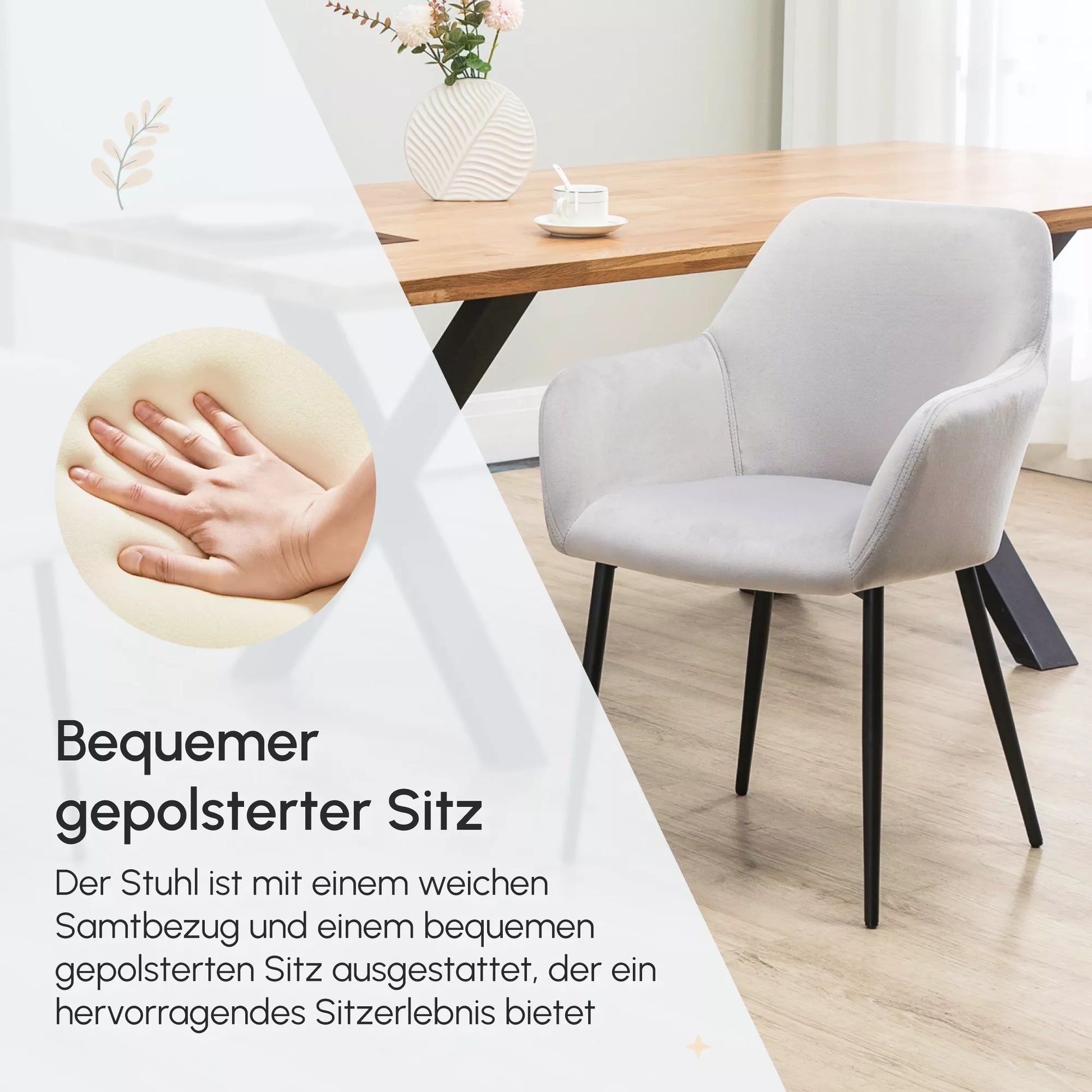 Paryškinkite virtuvės stalviršį arba pasitikite svečius su šiuo 2 valgomojo kėdžių komplektu. Klasikinė ir paprasta išvaizda tinka daugeliui elegantiškų aplinkų. Patogios ir gražios virtuvės kėdės pasižymi lenkta atlošą, gausia apmušalų, plačia sėdyne ir keturiomis ilgomis, kampuotomis plieninėmis kojomis stabilumui užtikrinti. Švelnus aksominis audinys yra minkštas ir lygus.