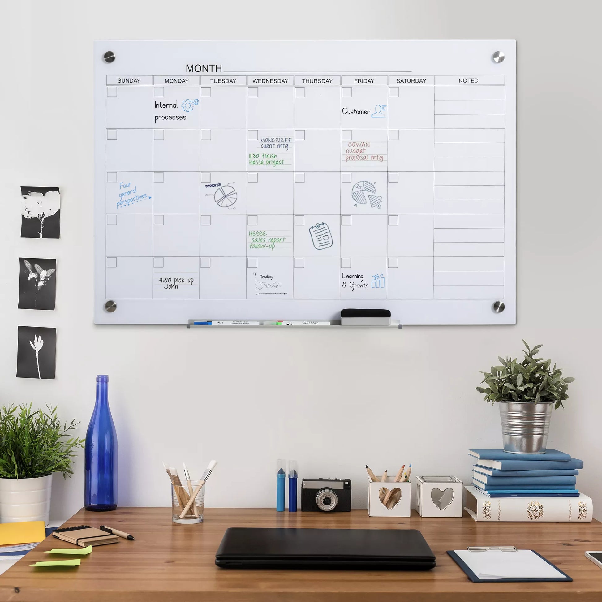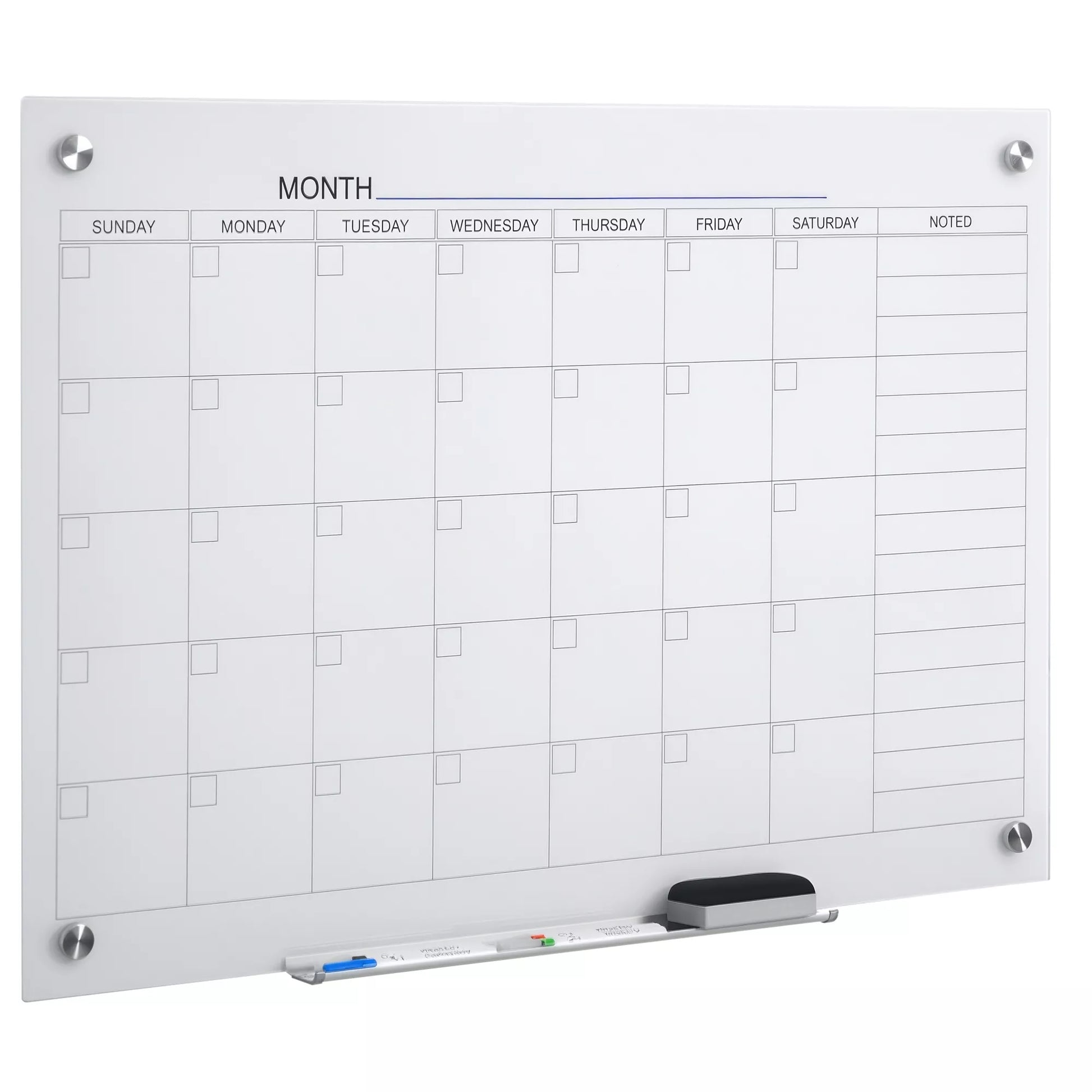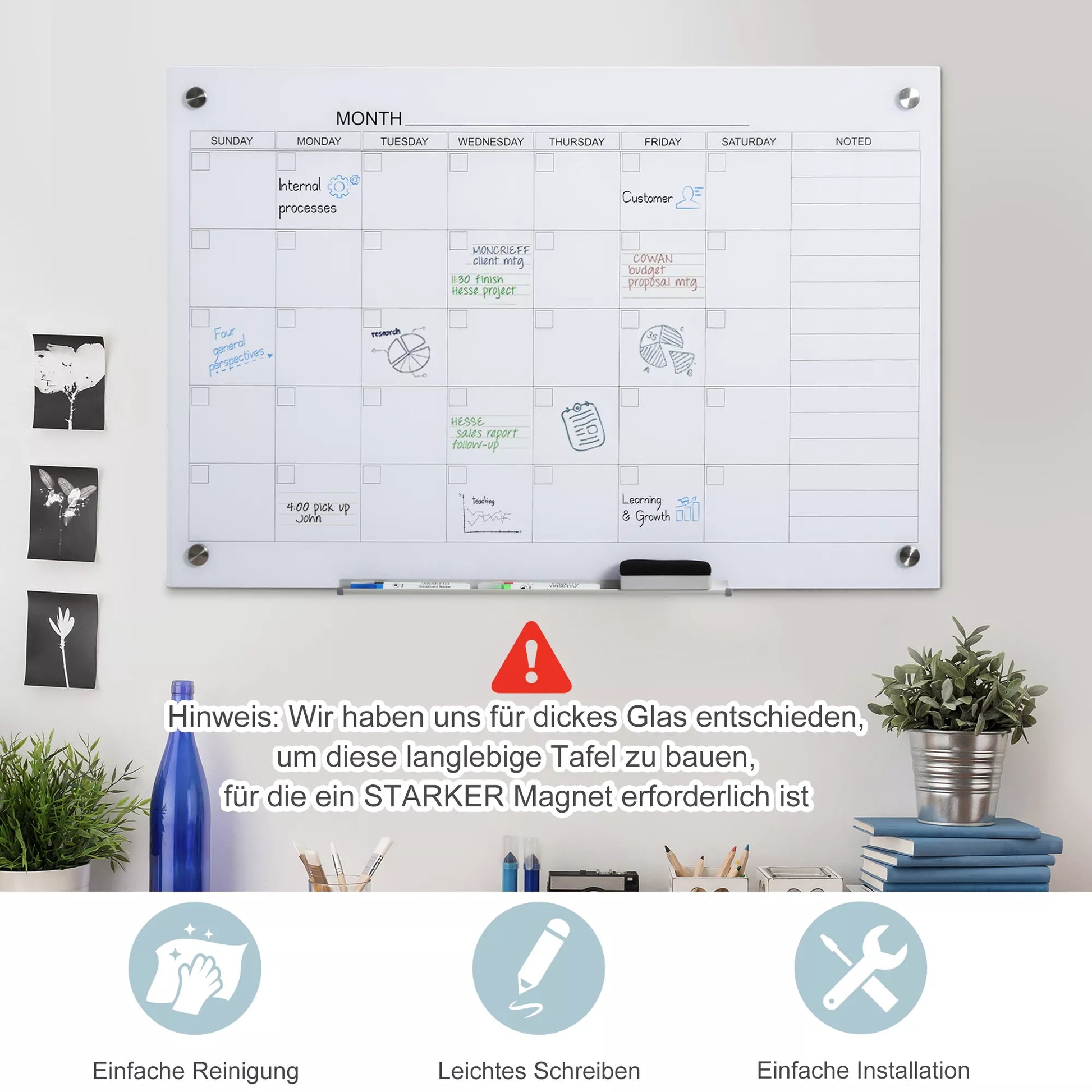 Ši kalendoriaus lenta ne tik atrodo gerai, bet ir yra itin praktiška. Su keturiomis stiklo spaustukėmis lengva pritvirtinti užrašus prie stiklo sienelės. Papildoma lentynėlė suteikia daug vietos priedams. Su pridedamais žymekliais lengva palikti užrašus ant sienos. Ši praktiška stiklo lenta tinka naudoti namuose, biuruose, mokyklose ir daug kur kitur.