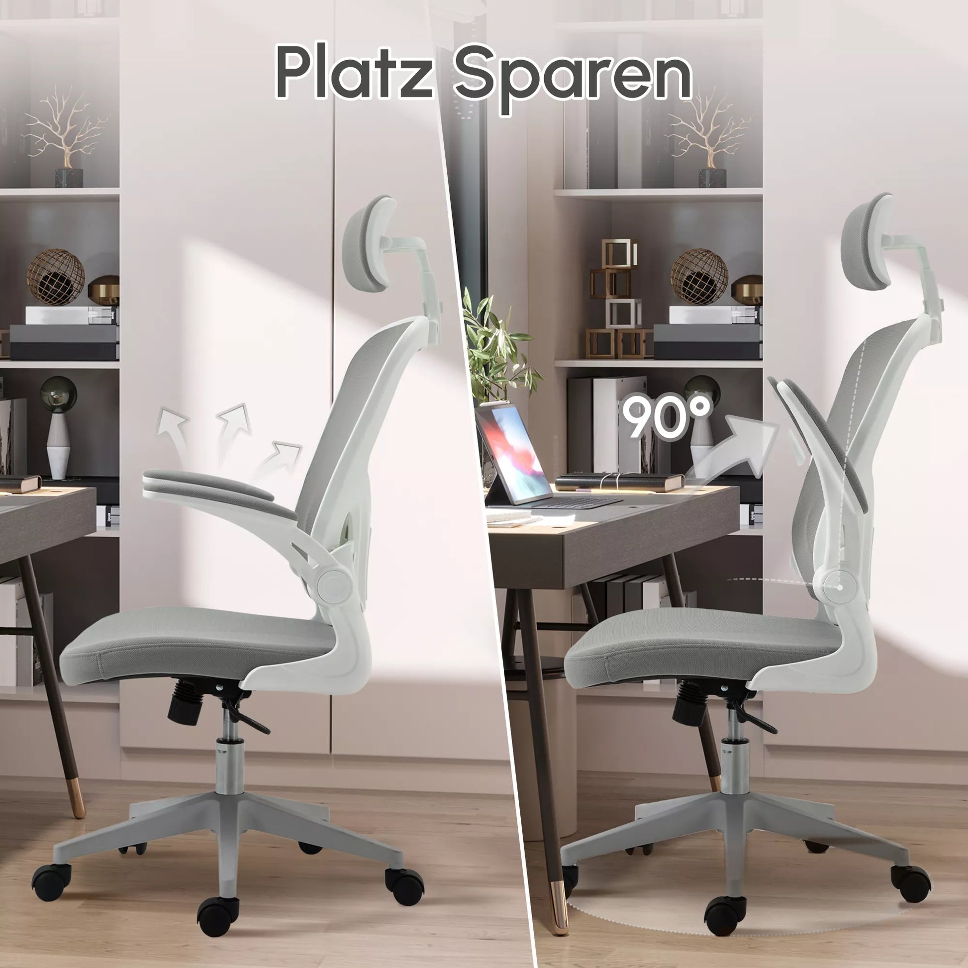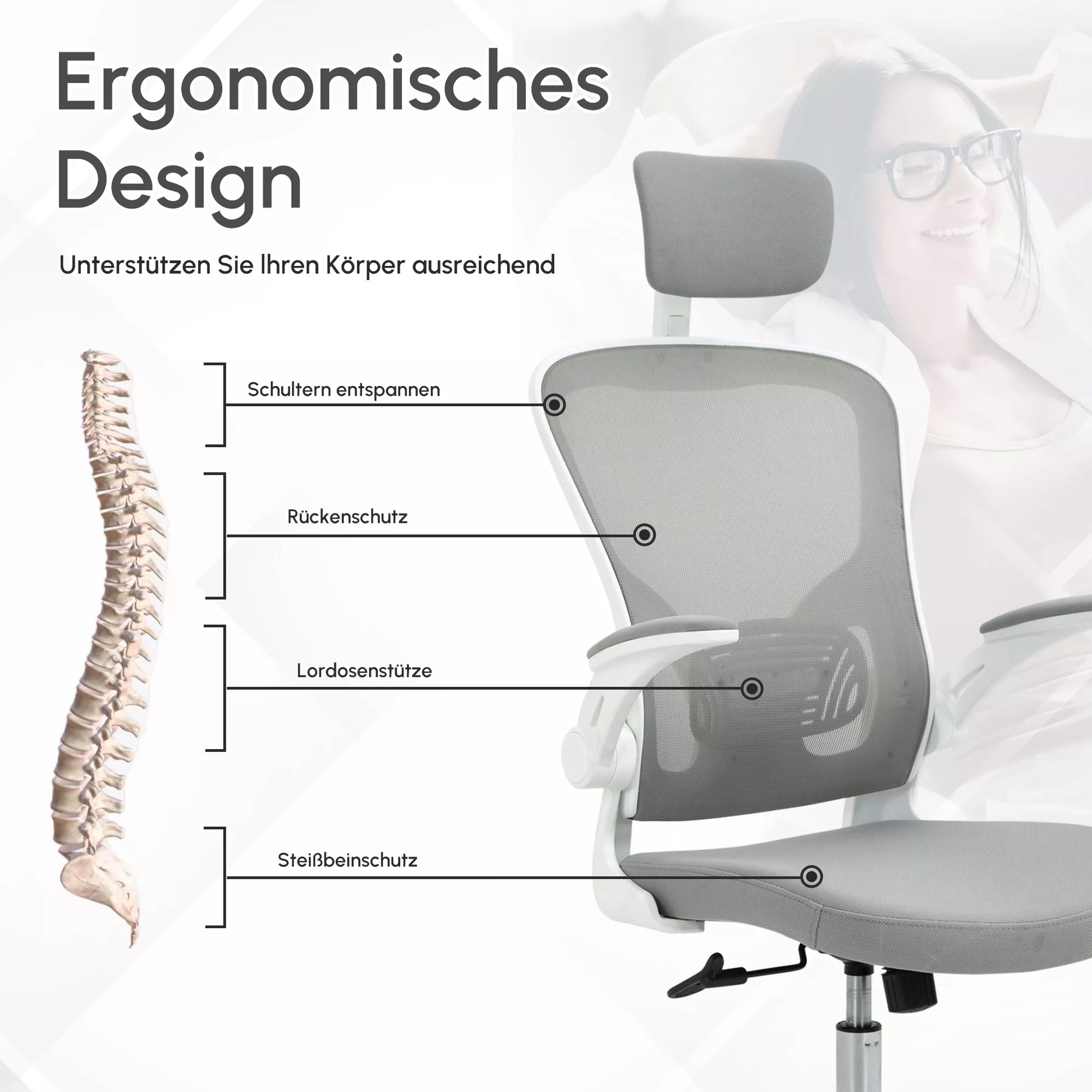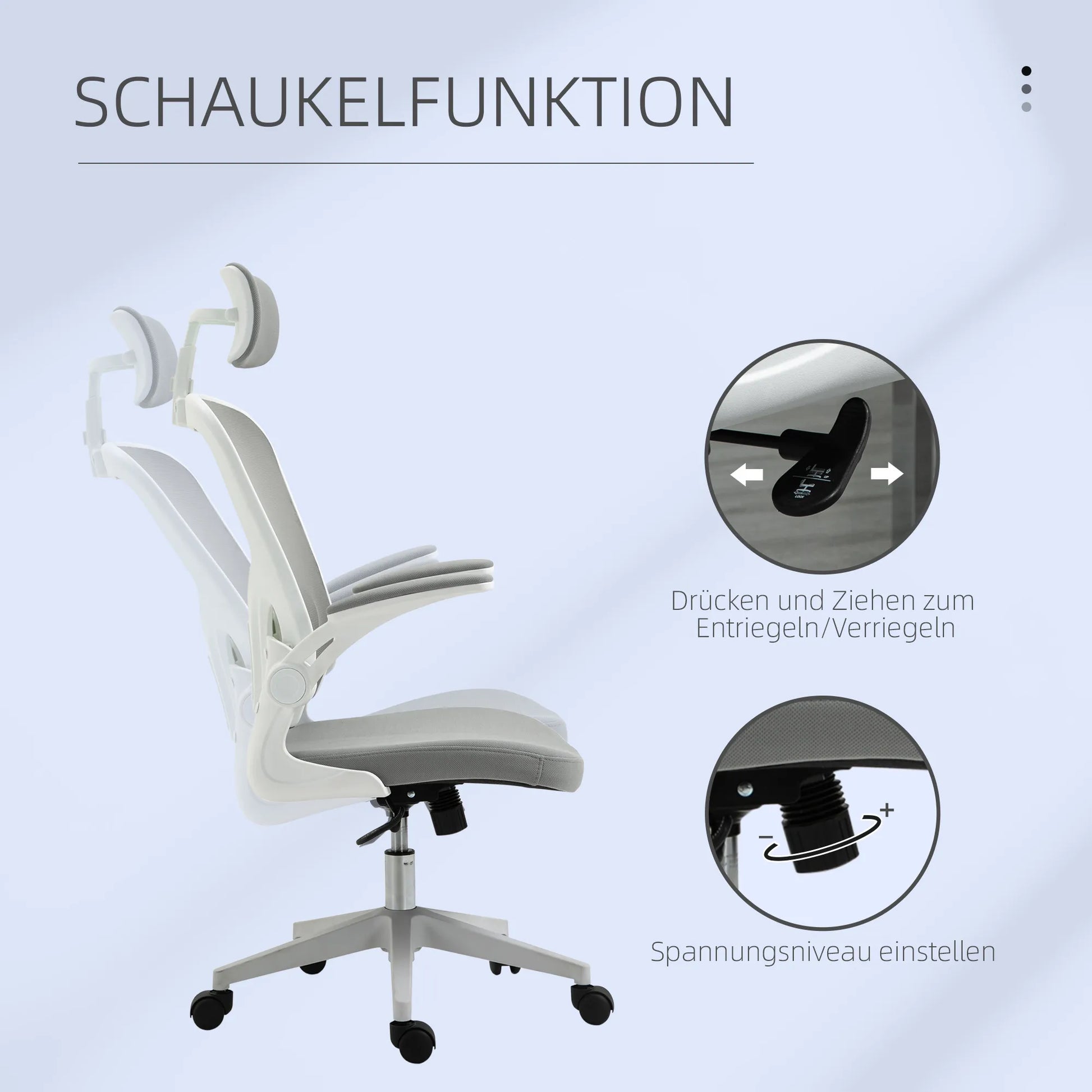 Ergonomiška biuro kėdė su svyravimo funkcija, aukštu atlošu, juosmens atrama, galvos atrama, atlenkiamais porankiais, namų biurui, pilka 65 x 64 x 114-122 cm