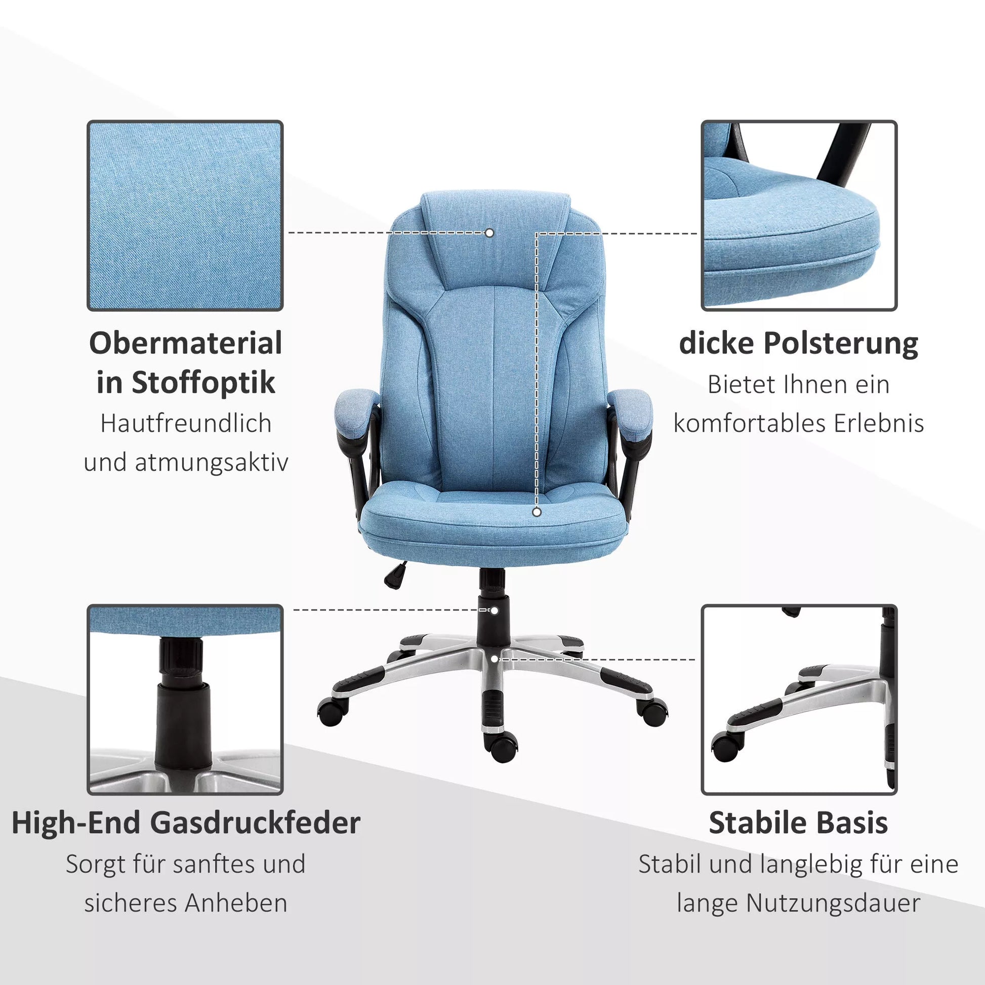 Biuro kėdė, kompiuterinė kėdė, pasukama kėdė, reguliuojamo aukščio, su svyravimo funkcija, galvos atrama ir paminkštintais porankiais, ergonomiška, šviesiai mėlyna, linas, 66 x 75 x 110–120 cm