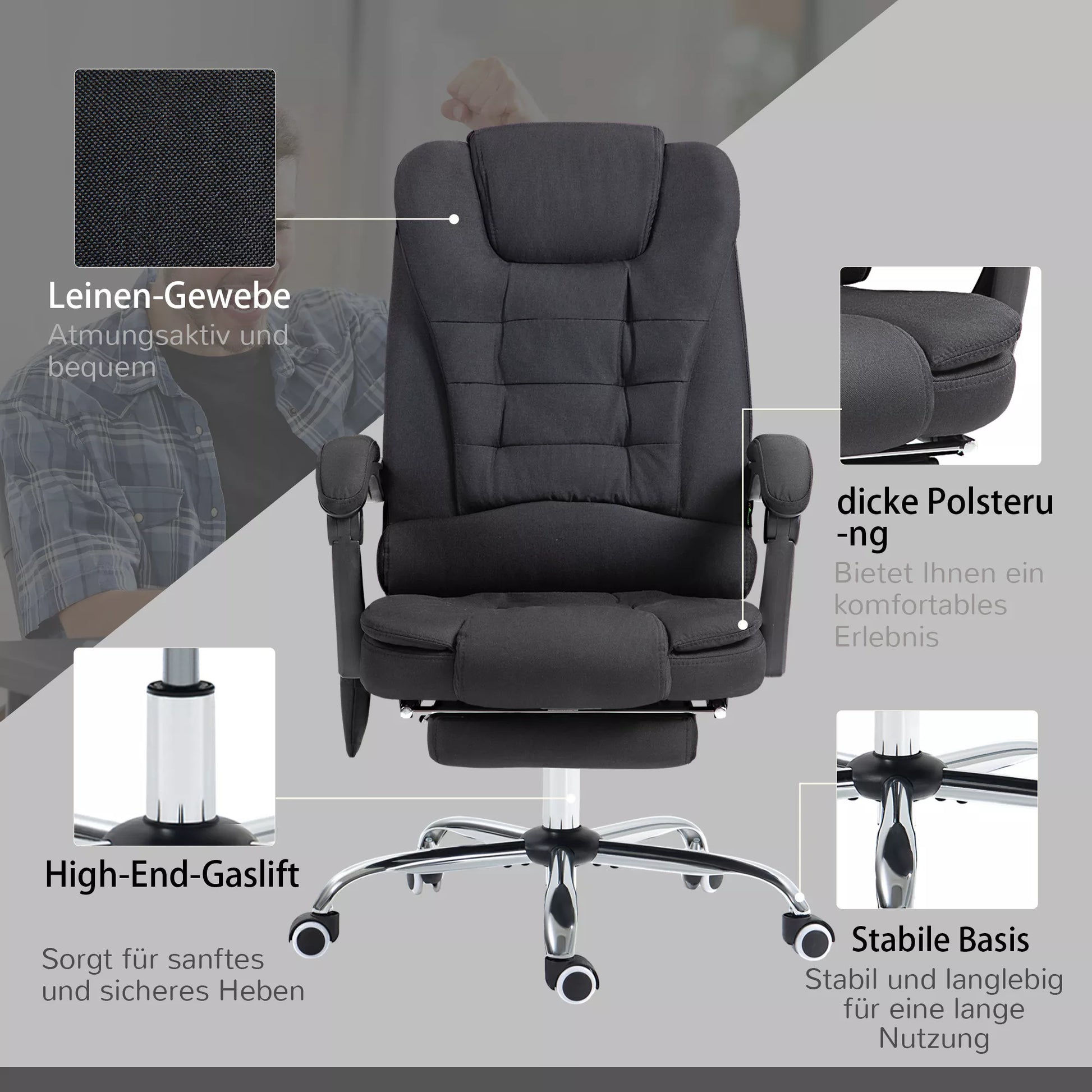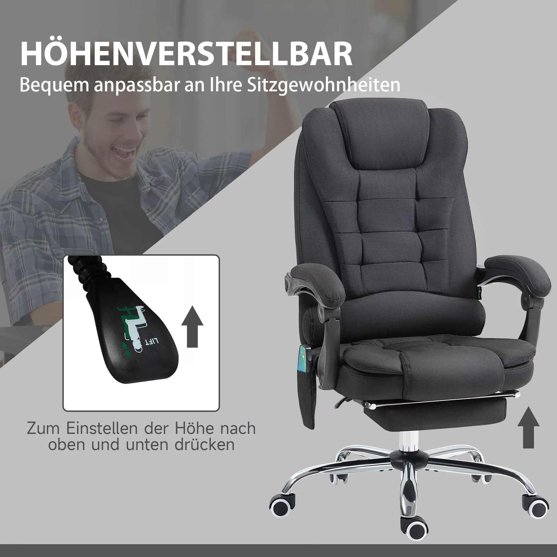 Paverskite savo biurą poilsio oaze su biuro kėde su masažo funkcija. Šis biuro krėslas aptrauktas minkštu audiniu ir derina stilingą komfortą su funkcionalumu. Su šešiais šildymo ir masažo taškais, keturiais nugaros ir dviem sėdynės srityje, valdomais nuotolinio valdymo pulteliu, jis suteikia optimalų atsipalaidavimą. Be to, iki 135° atlenkiama nugaros atrama ir rankiniu būdu reguliuojama kojų atrama leidžia pasiekti tobulą gulimą padėtį.