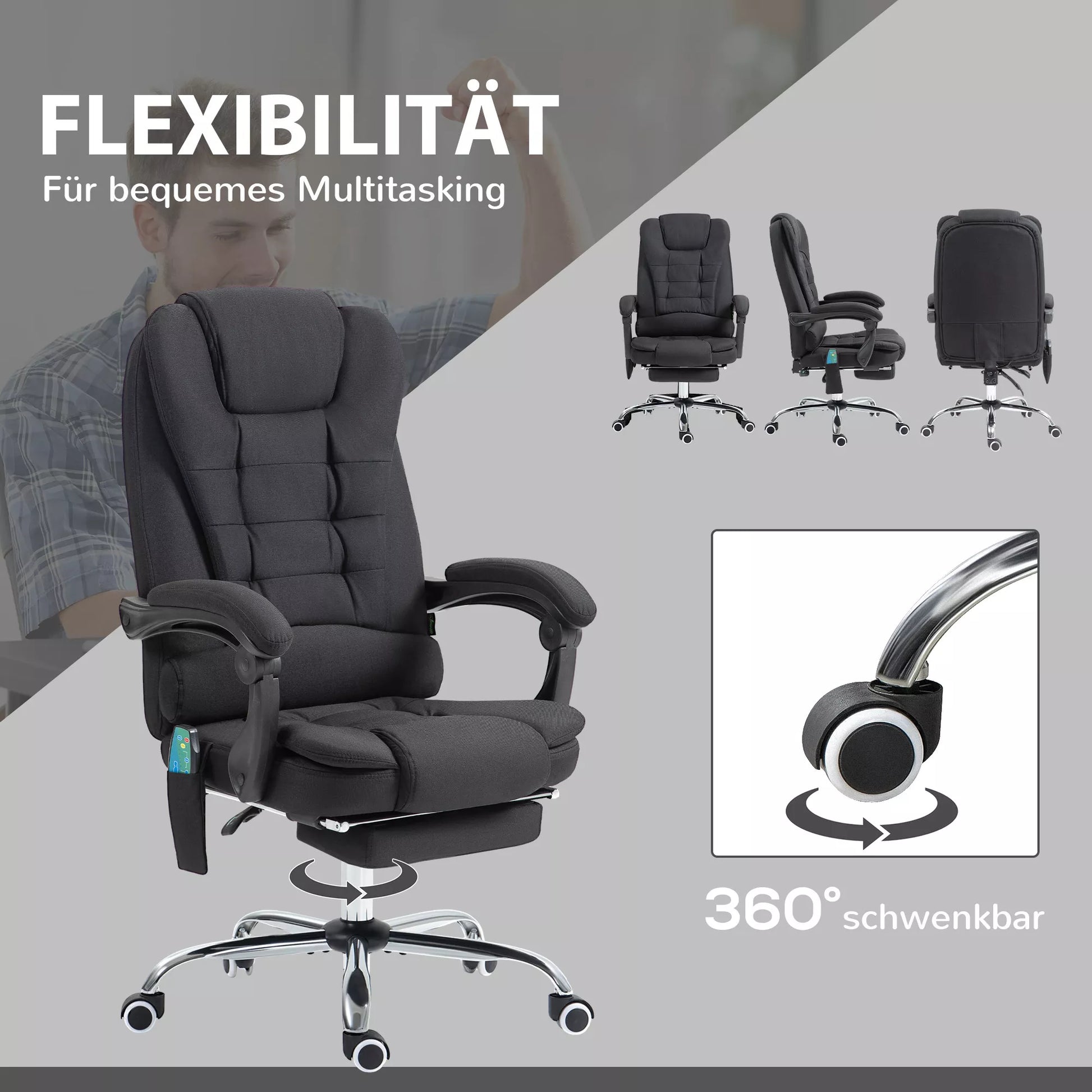 - ✔ 360 laipsnių besisukantis ergonomiškos biuro kėdės su kojų atrama sėdynė užtikrina lankstų judėjimą darbo vietoje