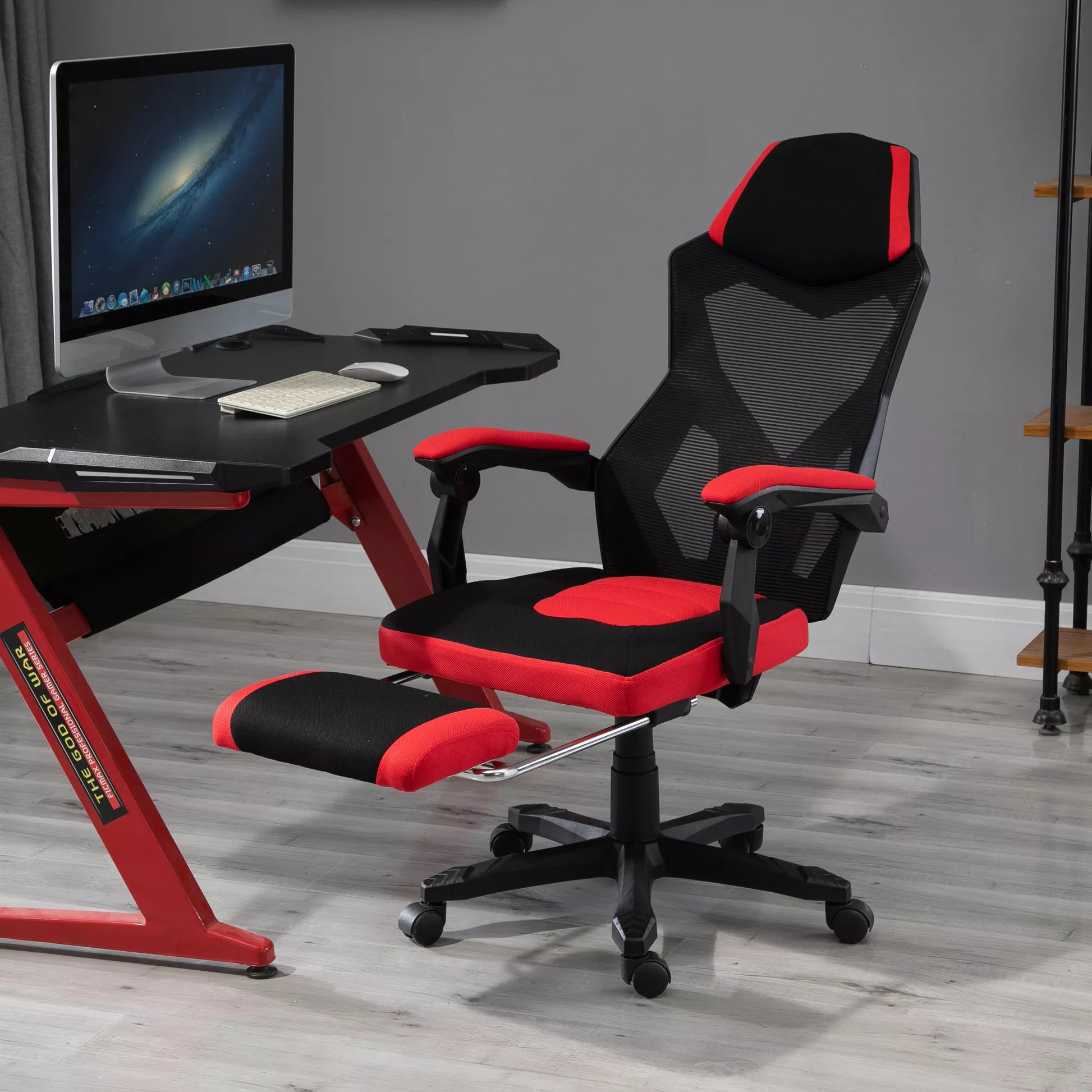 Ergonomiška biuro kėdė, žaidimų kėdė, pasukama kėdė su ištraukiama atrama kojoms, kompiuterio kėdė, vadovo kėdė, aukštis reguliuojamas, poliesteris, juoda+raudona, 58 x 63 x 112-122 cm