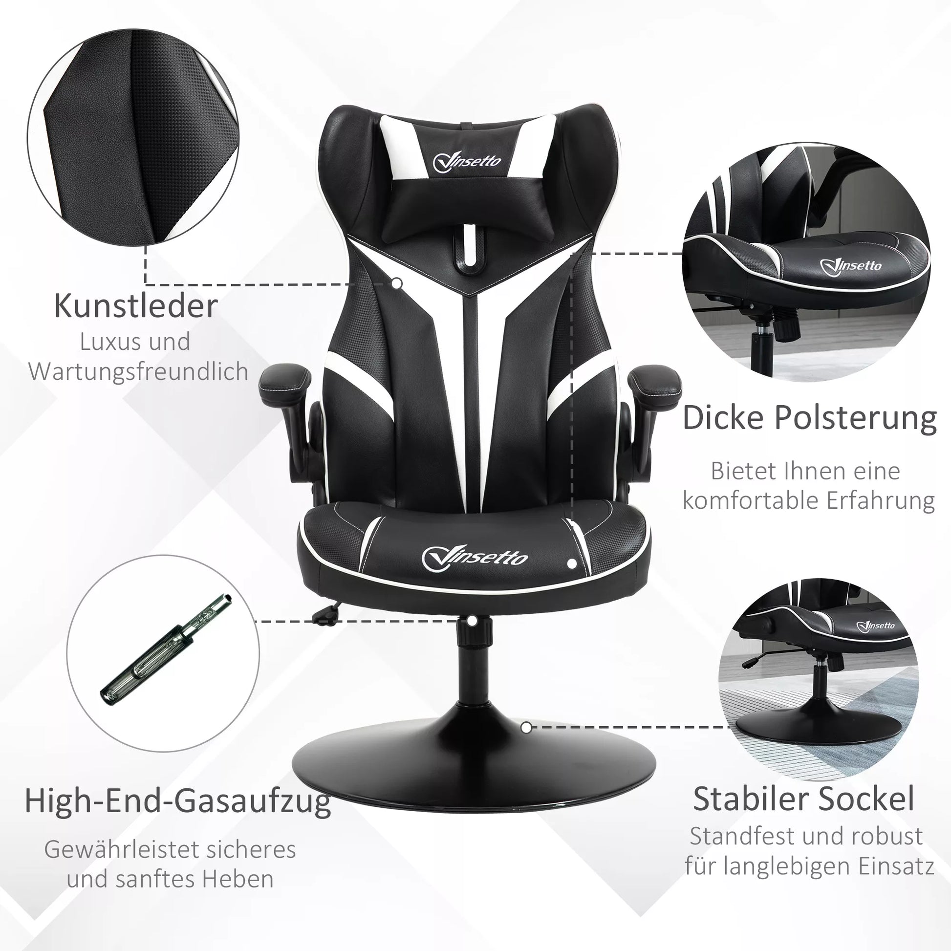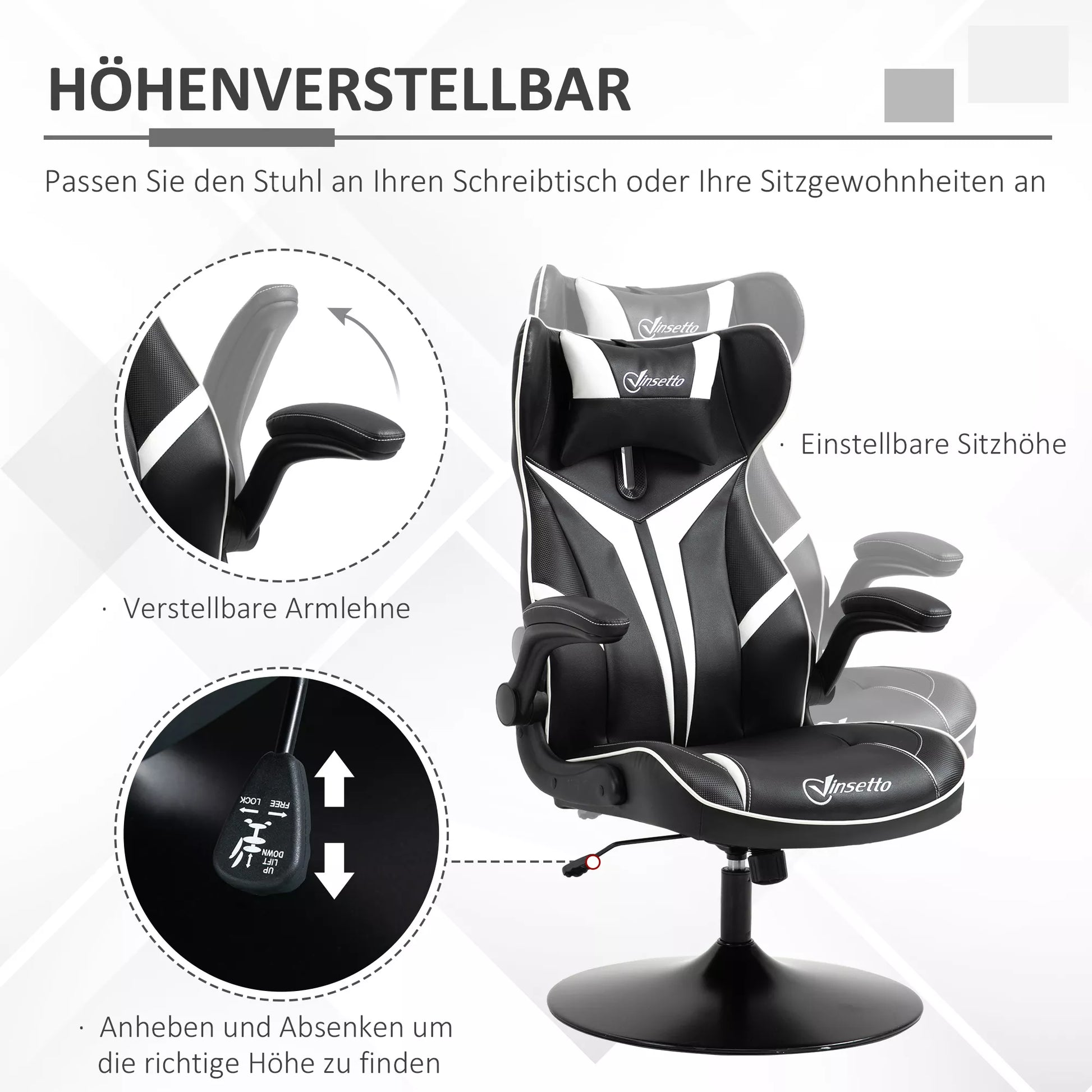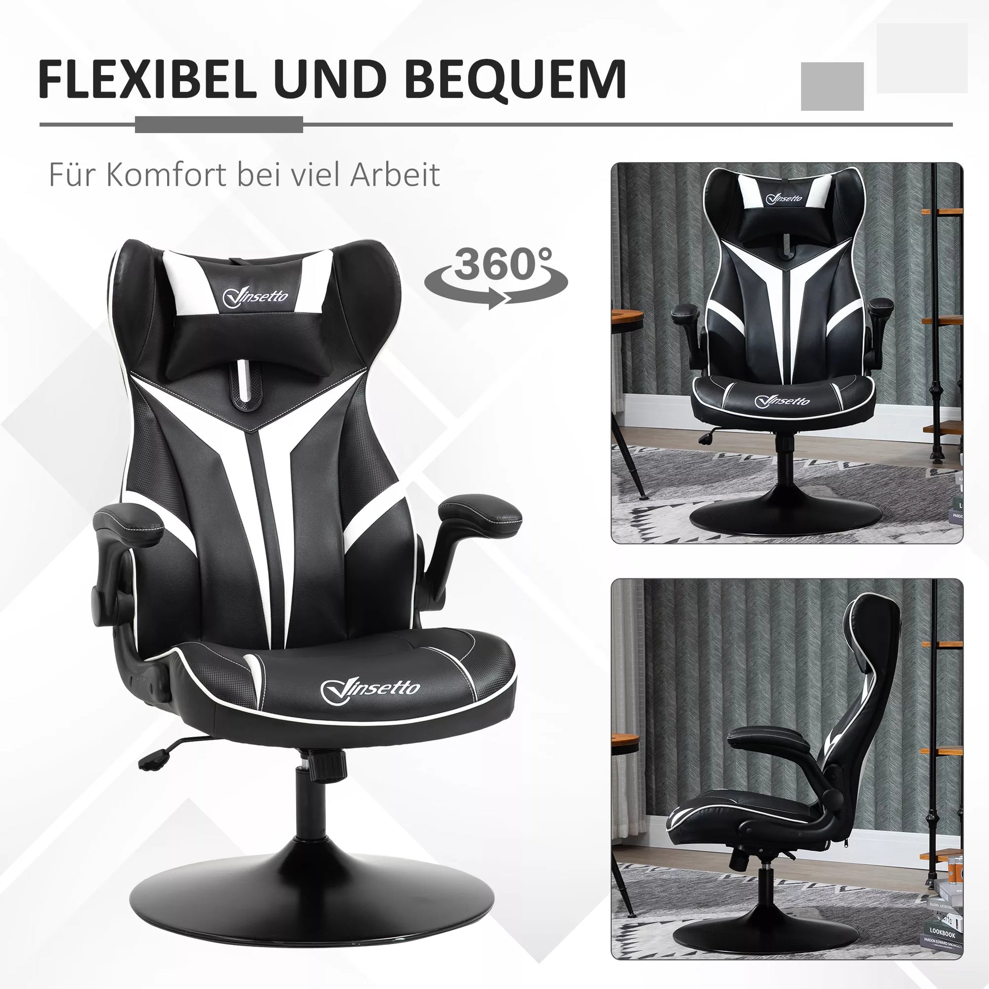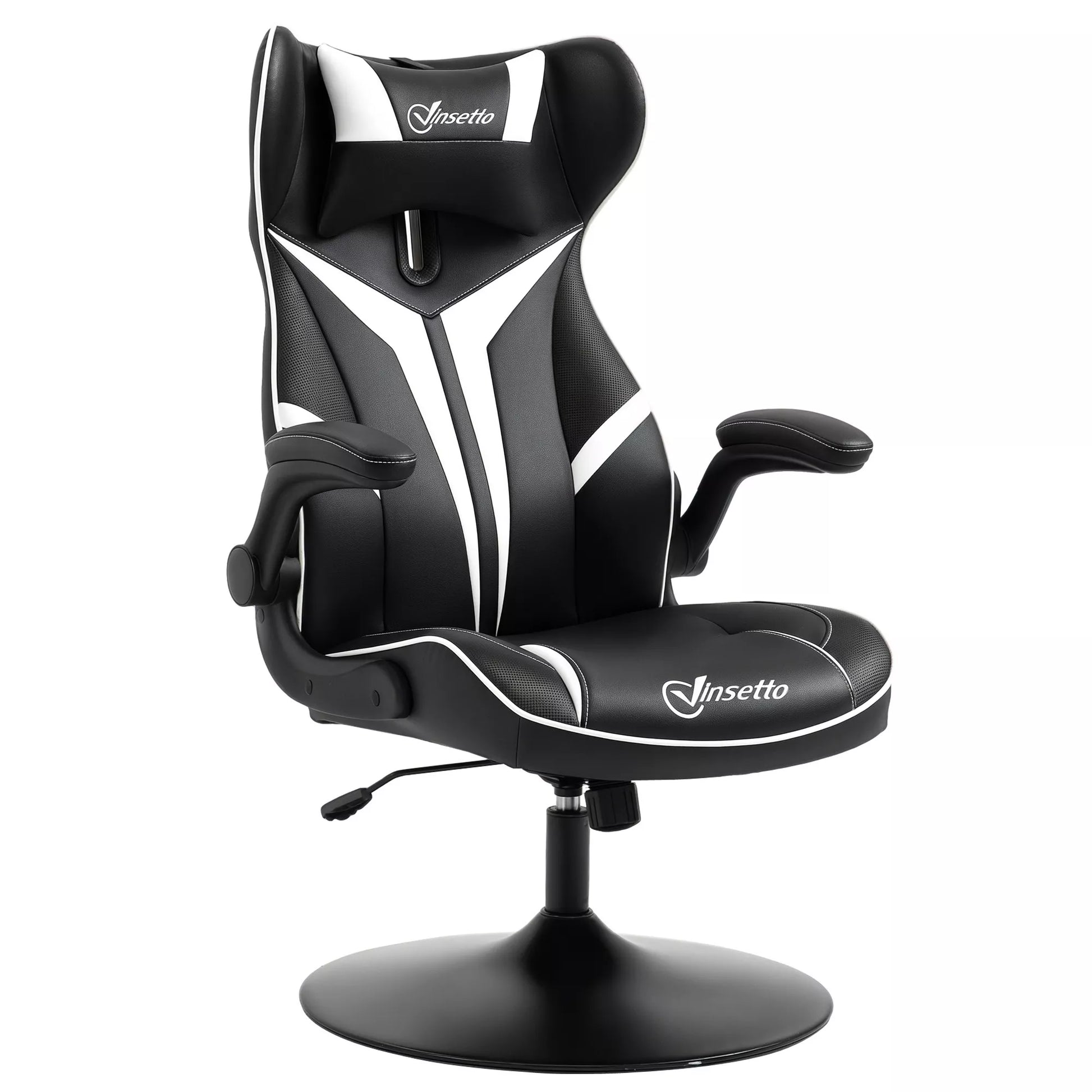 Žaidimų kėdė, ergonomiška kompiuterio kėdė su svyravimo funkcija, pasukama kėdė, reguliuojamo aukščio, plieninė, juoda+balta, 67 x 70 x 106-112 cm