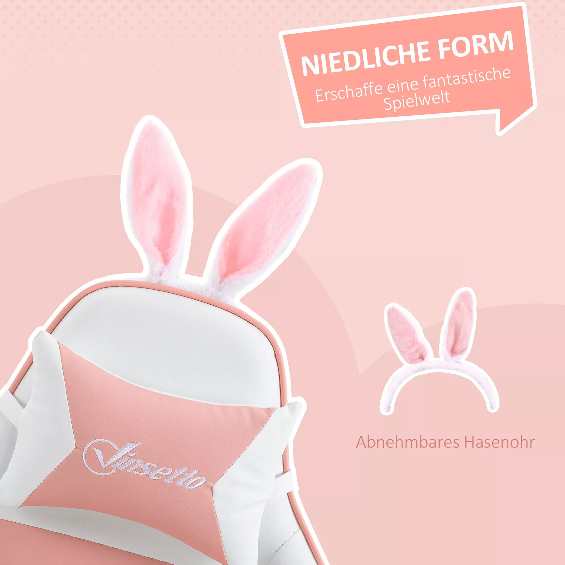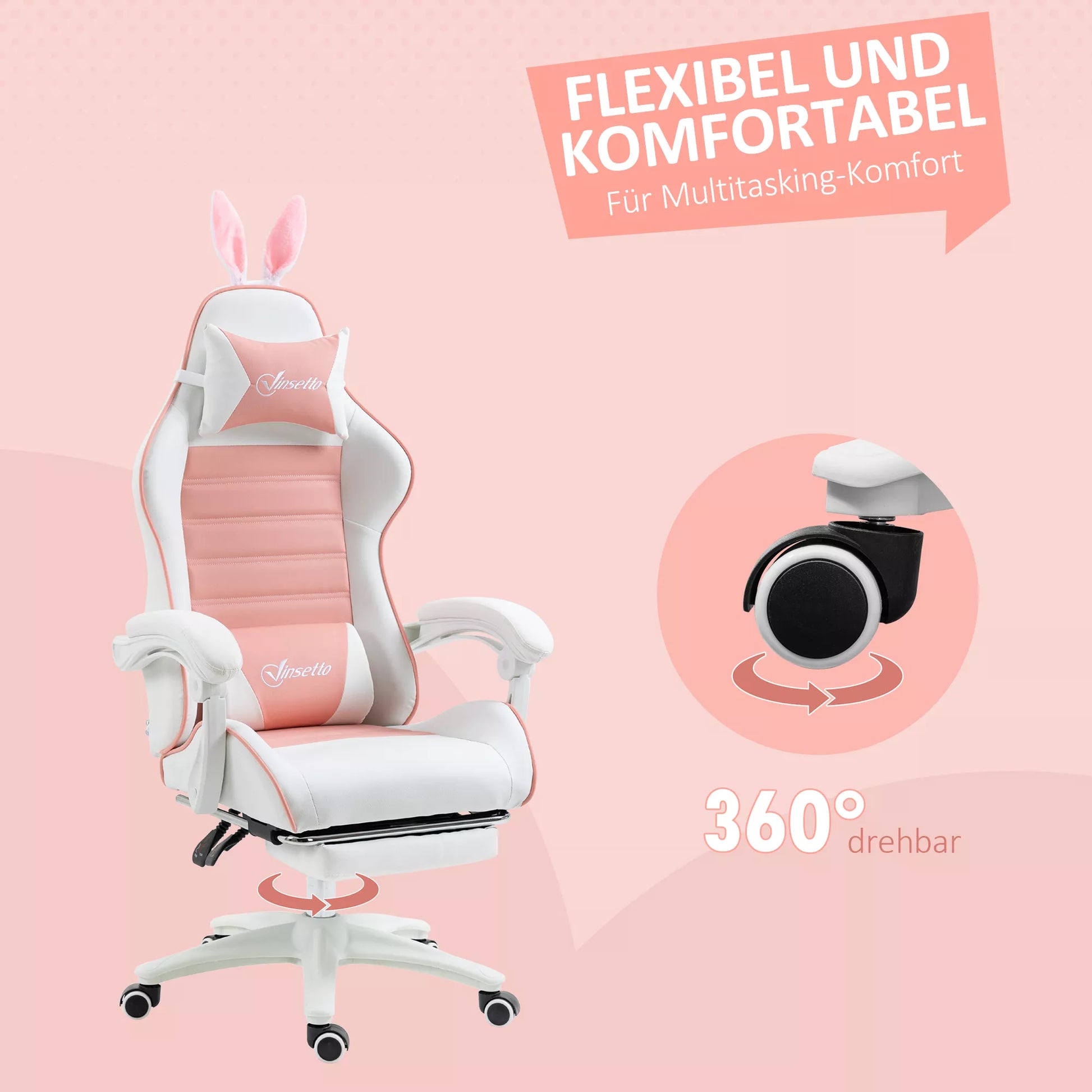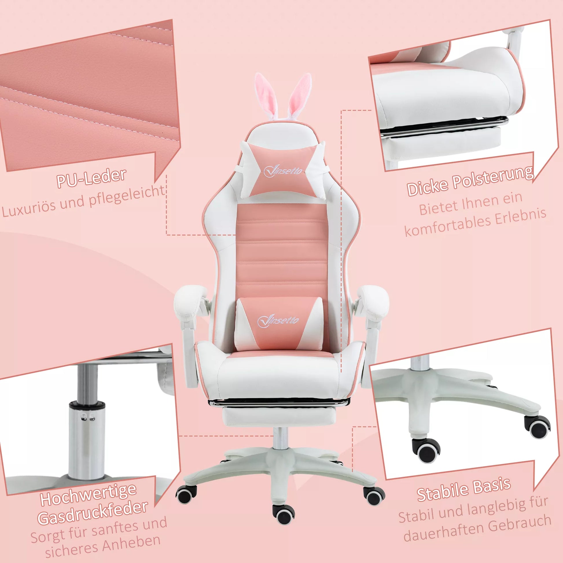Ergonomiška žaidimų kėdė su juosmens atrama, kojų atrama, rožine galvos pagalvėle su zuikio ausimis