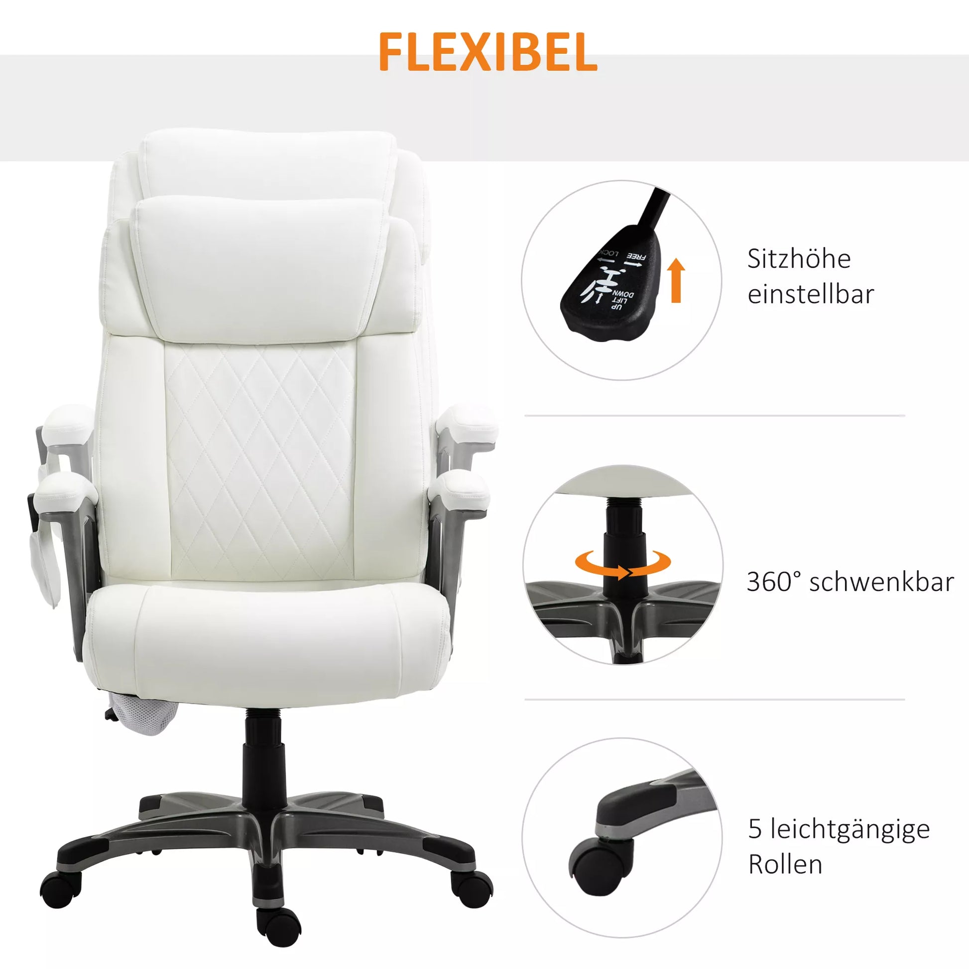 Masažinė biuro kėdė, 6 taškų masažinis pasukamas krėslas, ergonomiška, reguliuojama, dirbtinės odos, su lenkta galvos atrama ir porankiu, balta 70 x 76,5 x 114-124 cm