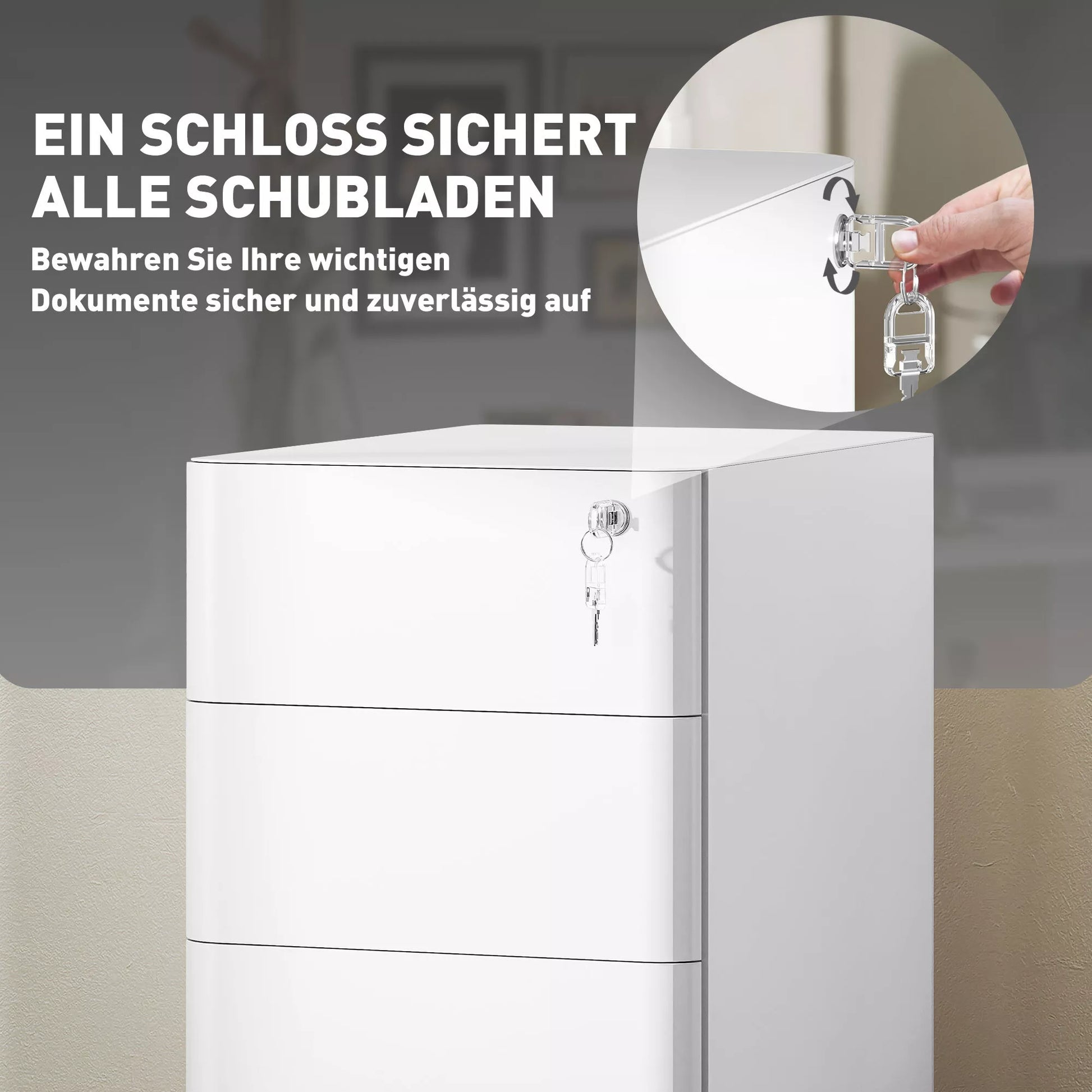 - ✔ Centrinis užraktas apsaugo visus stalčius, kad būtų saugomi konfidencialūs dokumentai, pridedami du raktai
