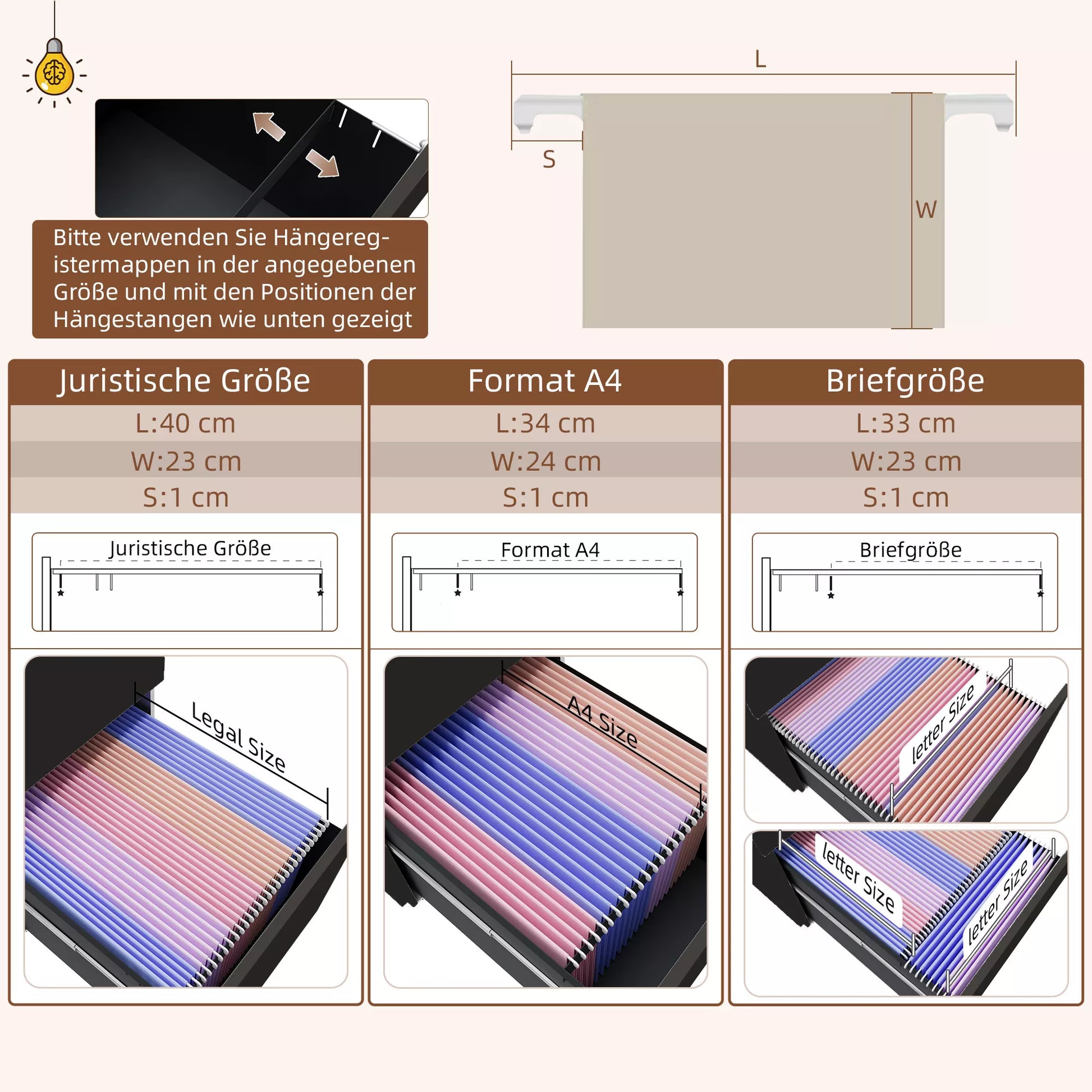 - ✔ Reguliuojama pakabinama strypas laiškams, A4 ir Legal formato byloms