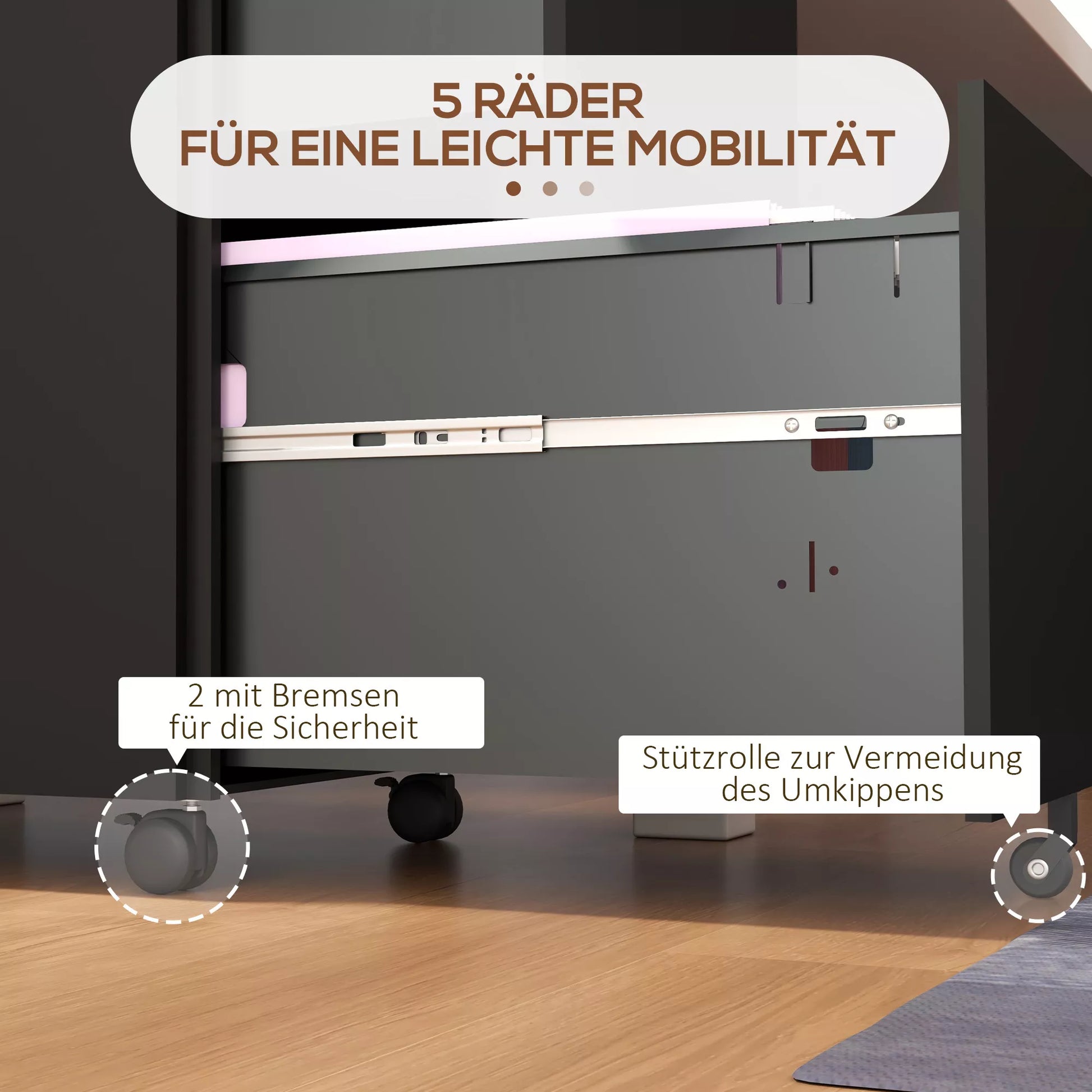 - ✔ Ratukų konteinerio stalviršis gali atlaikyti spausdintuvą, skaitytuvą ar asmeninius daiktus