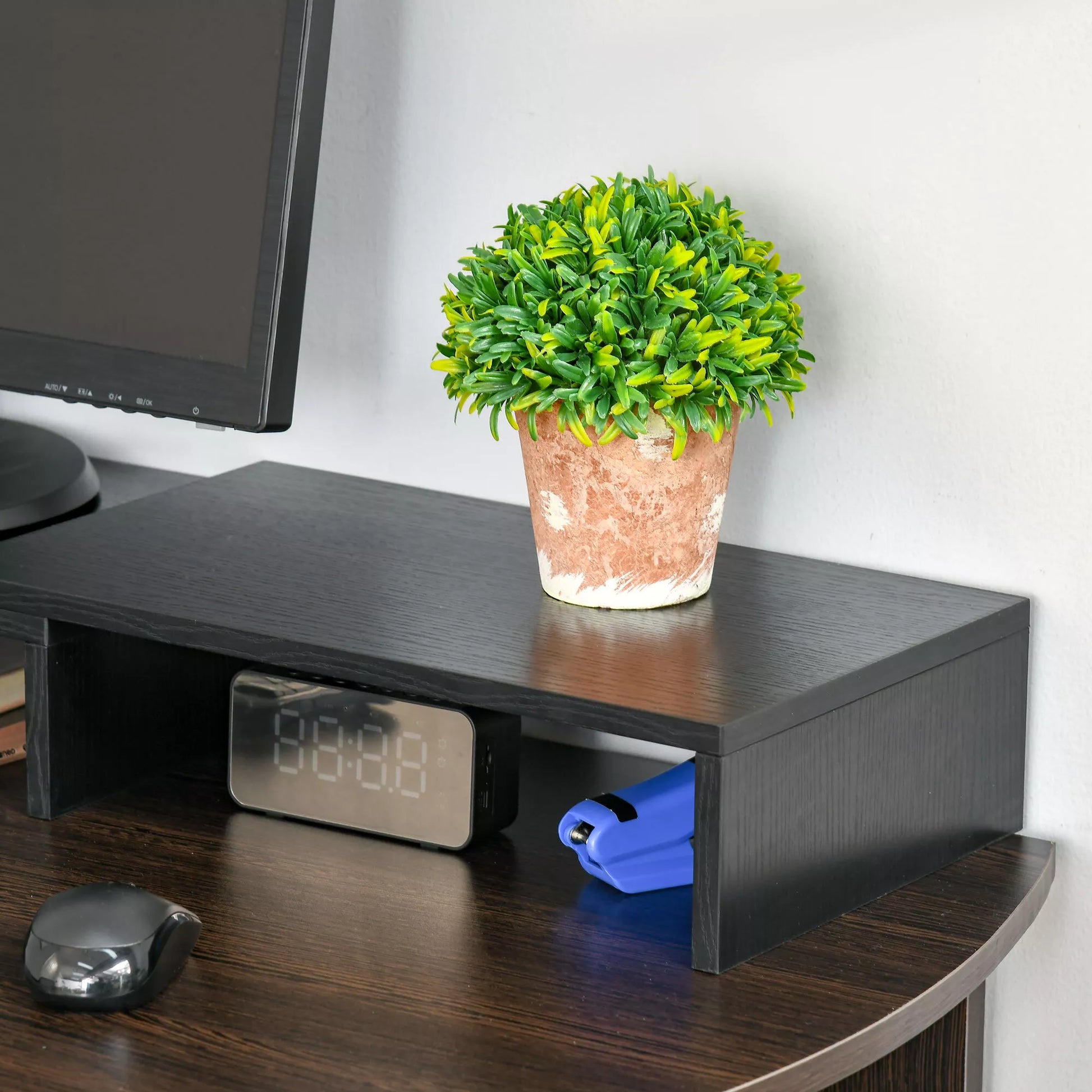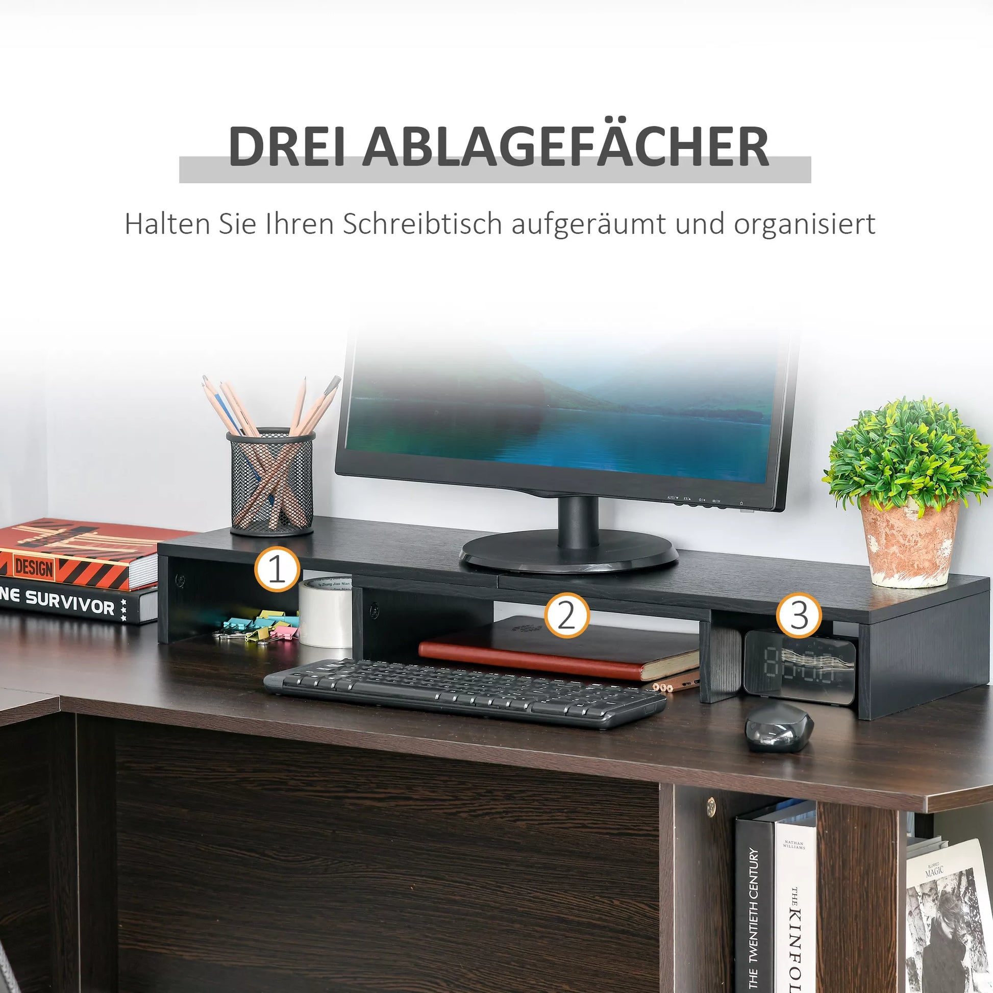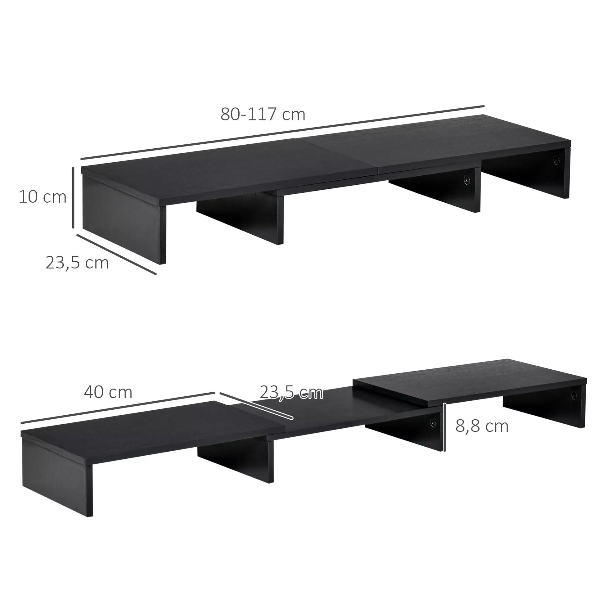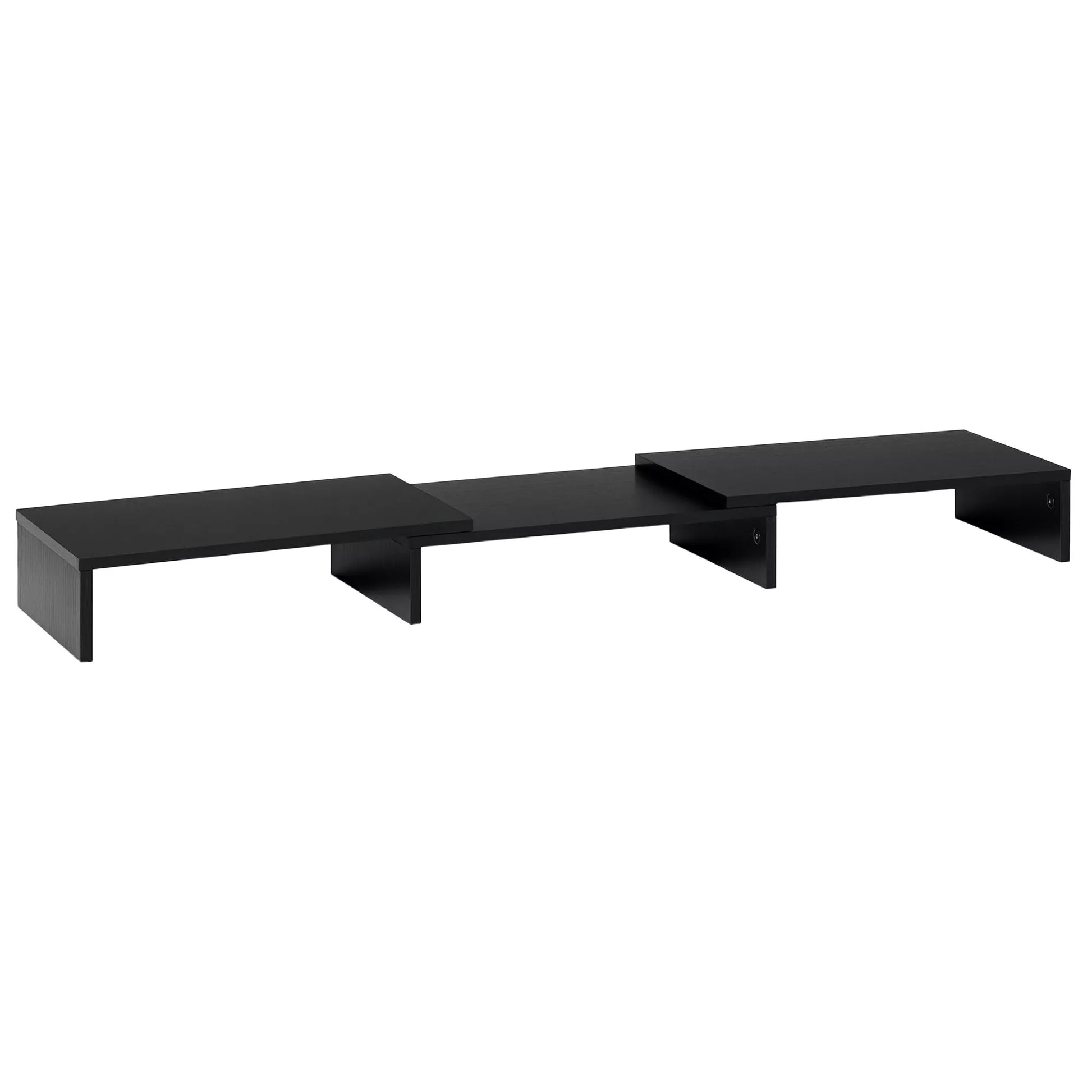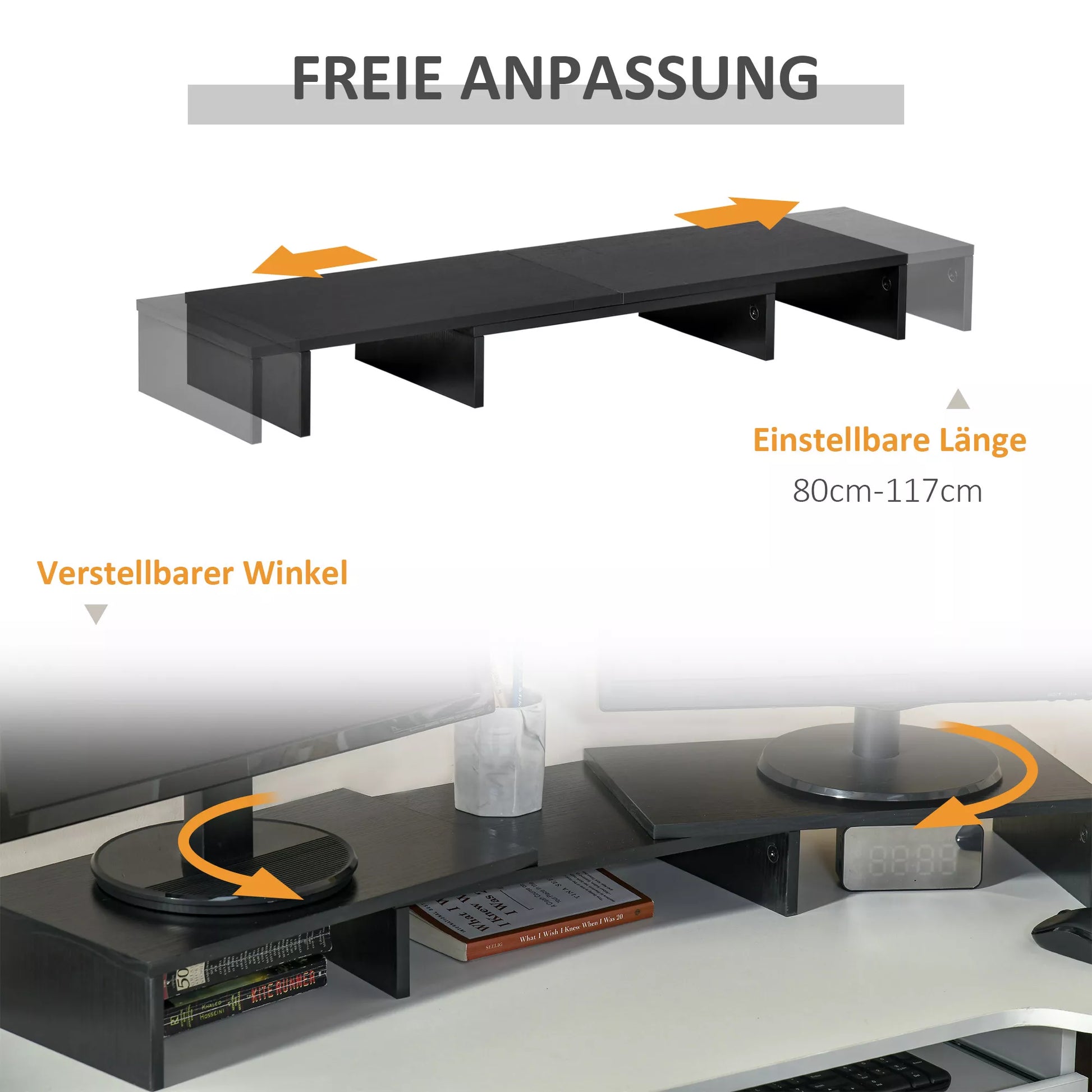Ar norite išvengti akių ir kaklo pervargimo ilgai dirbant prie kompiuterio? Šis monitoriaus stovas gali padėti jums išspręsti šią problemą. Jo ilgis reguliuojamas nuo 80 cm iki 117 cm, o kampas gali būti nustatytas pagal jūsų poreikius. Trys lentynėlės po pagrindine konstrukcija gali būti naudojamos biuro reikmenims laikyti, taip optimaliai išnaudojant darbo vietos erdvę. Ant stovo patogiai telpa du monitoriai.