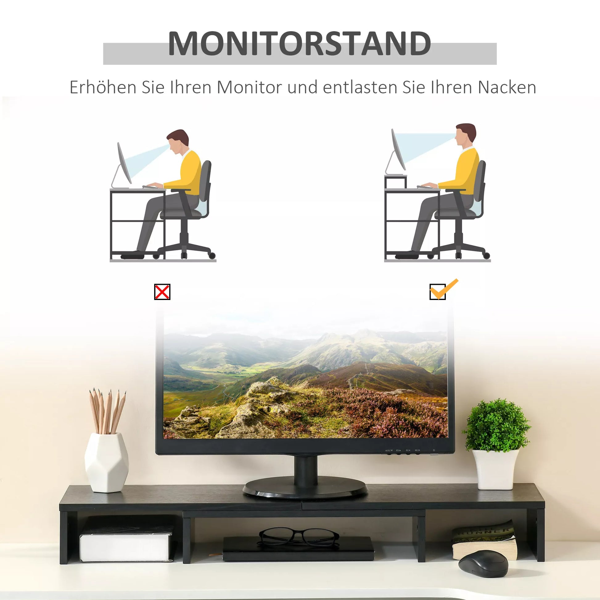 - ✔ Pakelia monitorius ir sumažina kaklo įtampą