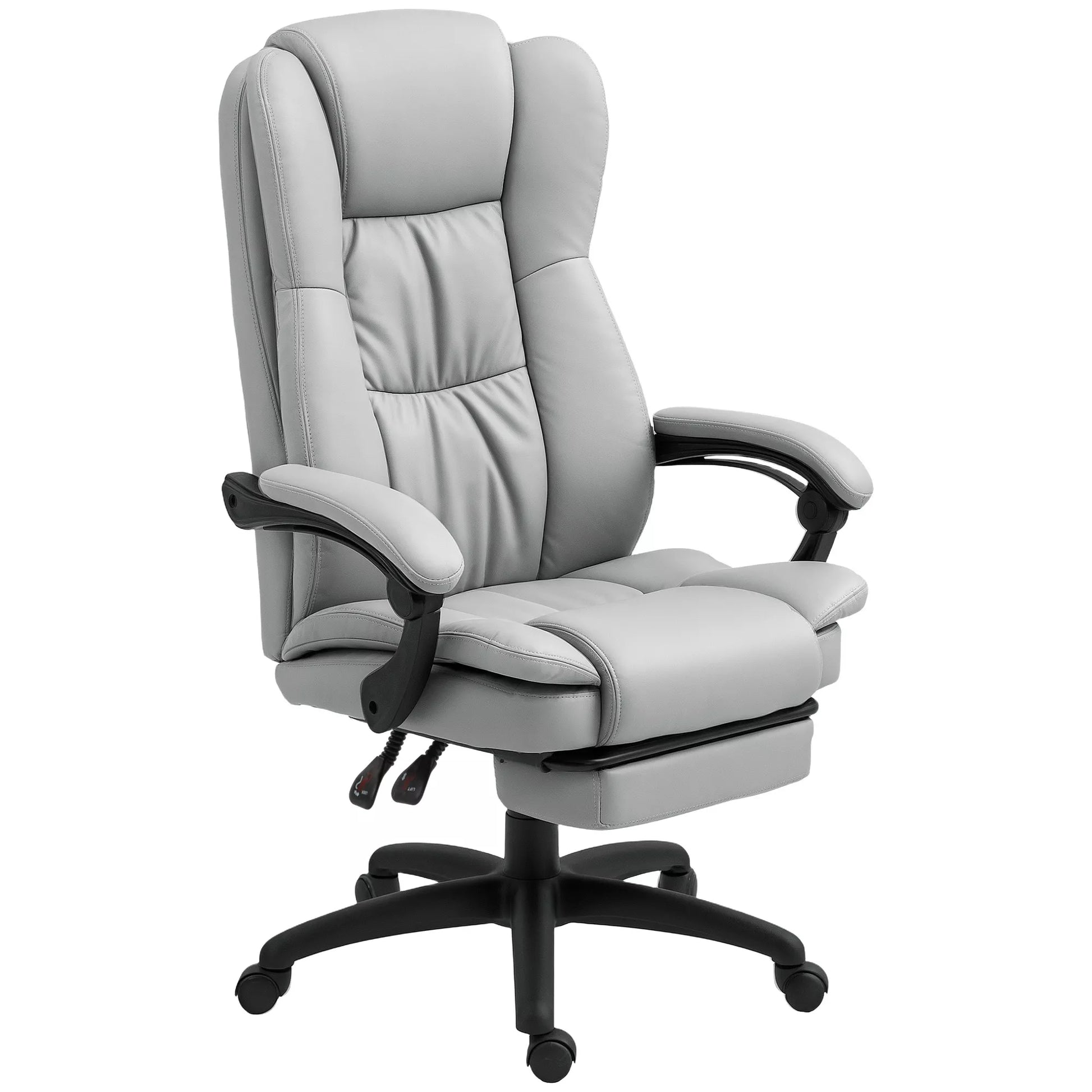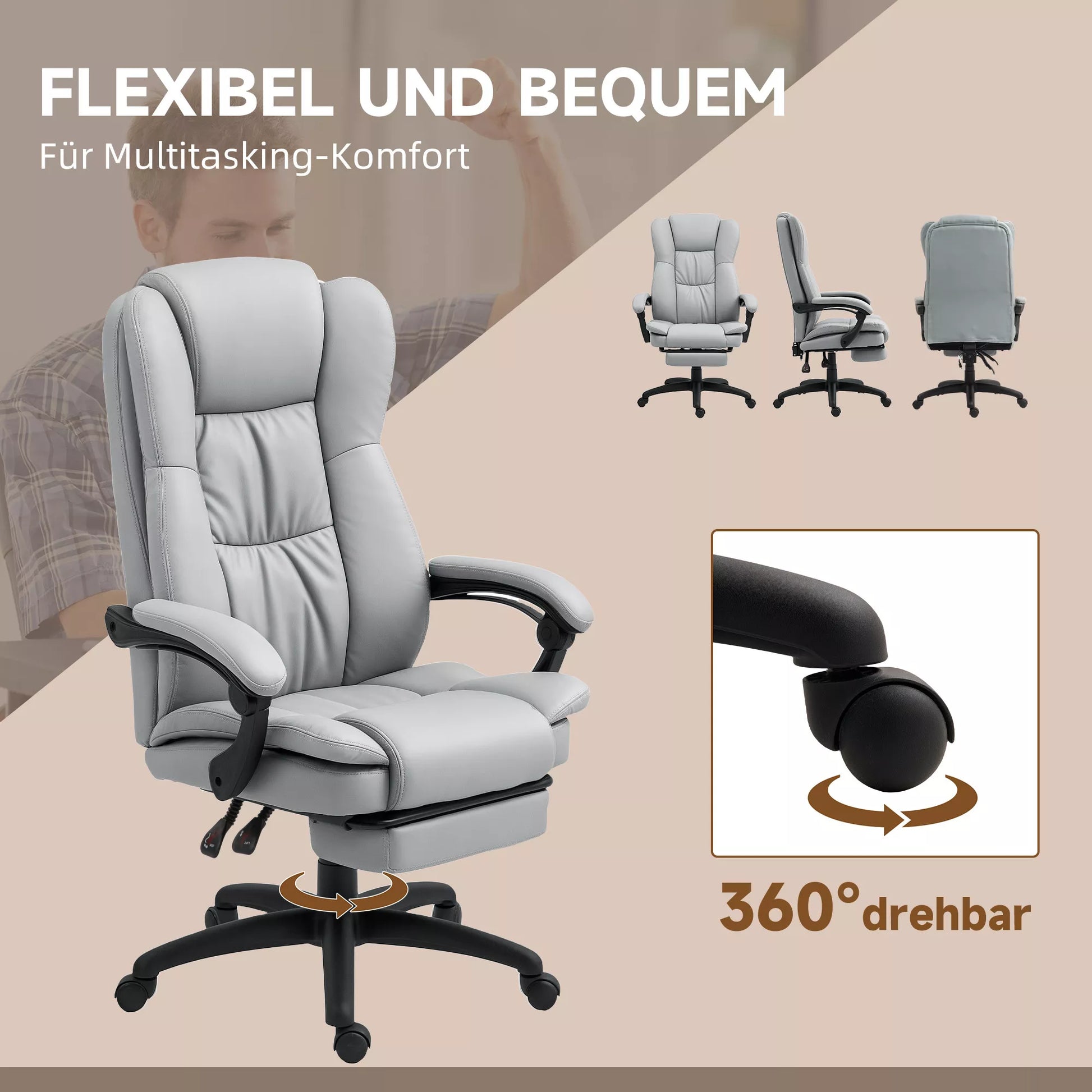 Patogiai įsikelkite darbo dienai biure su šia ergonomiška „Vinsetto“ biuro kėde su kojų atrama. Ši atlošiama biuro kėdė gali suktis 360 laipsnių bet kuria kryptimi. Jame yra 6 vibracijos taškai ir 5 masažo režimai jūsų kūnui atpalaiduoti, valdomi nuotolinio valdymo pulteliu. Pasukama kėdė yra reguliuojamo aukščio, o jos atlošas gali būti atlošiamas. Be to, patogi kojų atrama gali būti išskleidžiama ir sulankstoma.