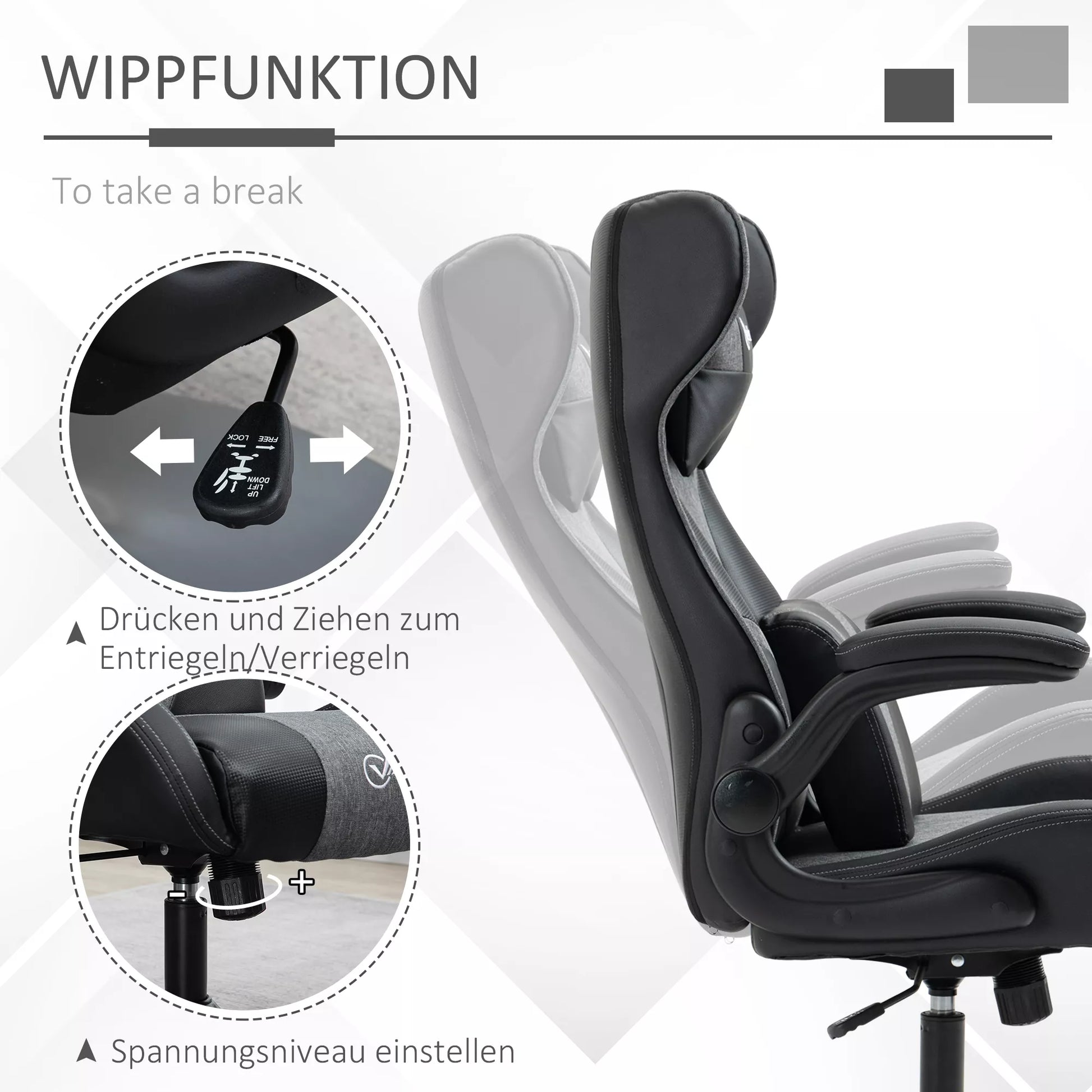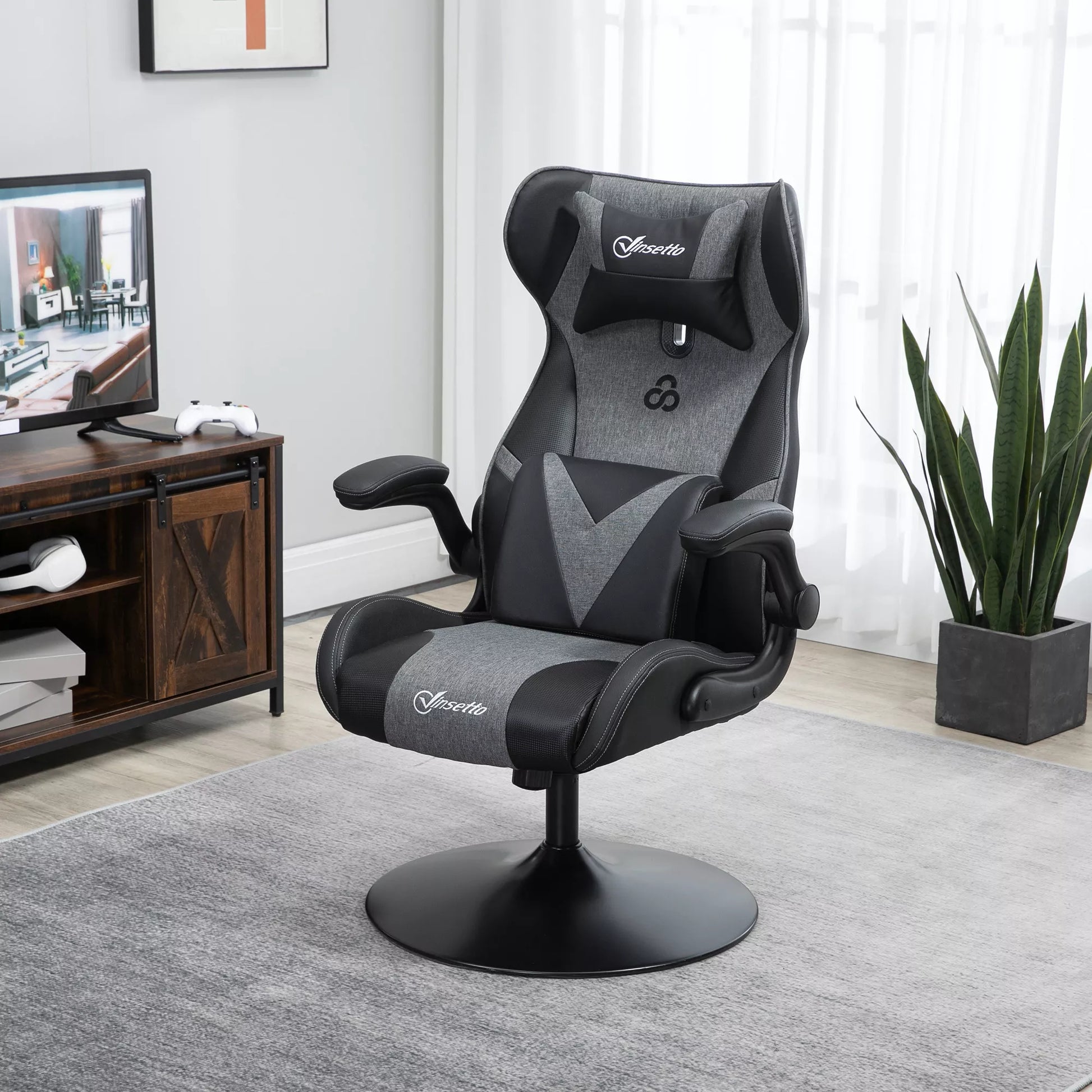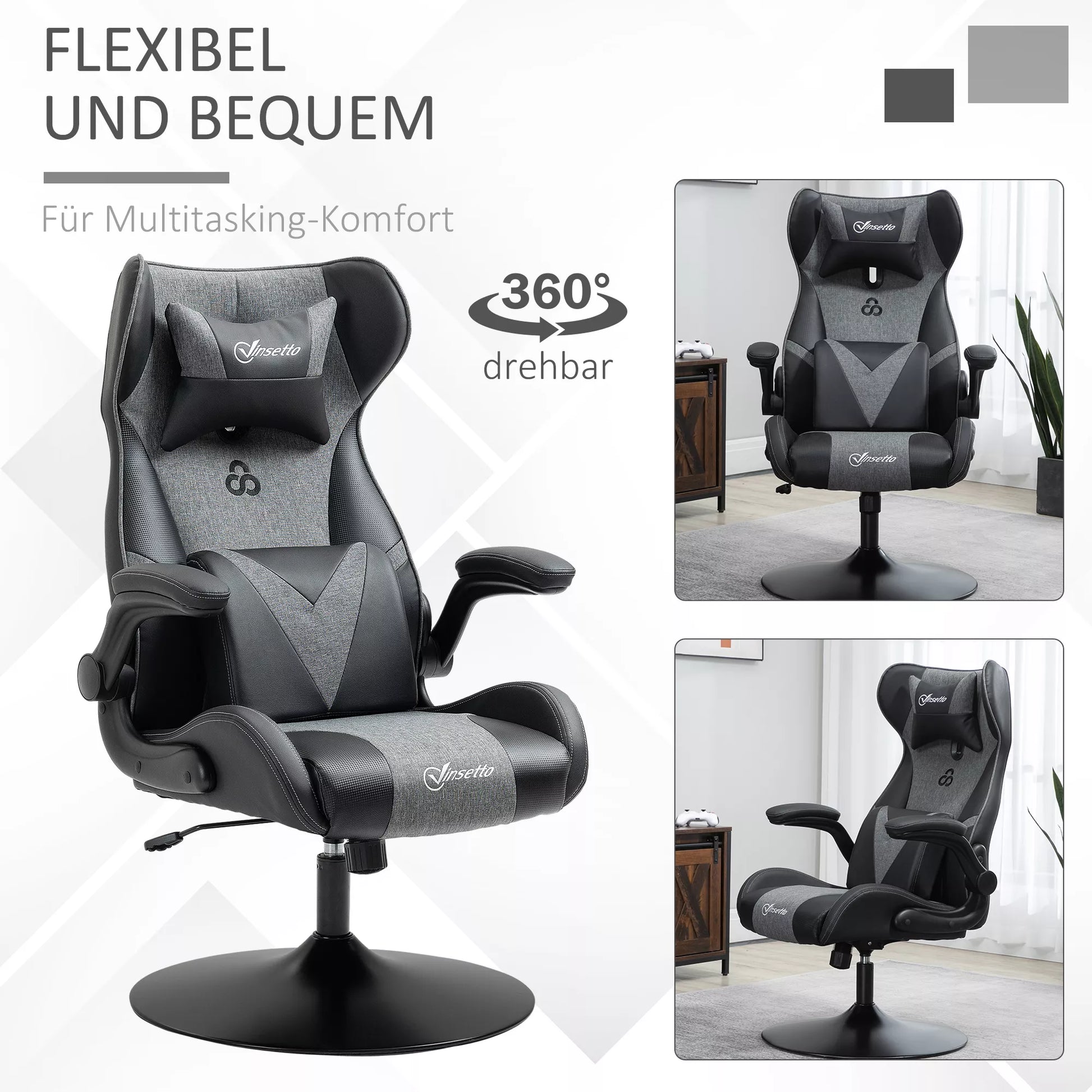 Žaidimų kėdė, reguliuojamo aukščio & pasukama, dirbtinės odos apmušalas, atlenkiamos porankiai, juoda+pilka